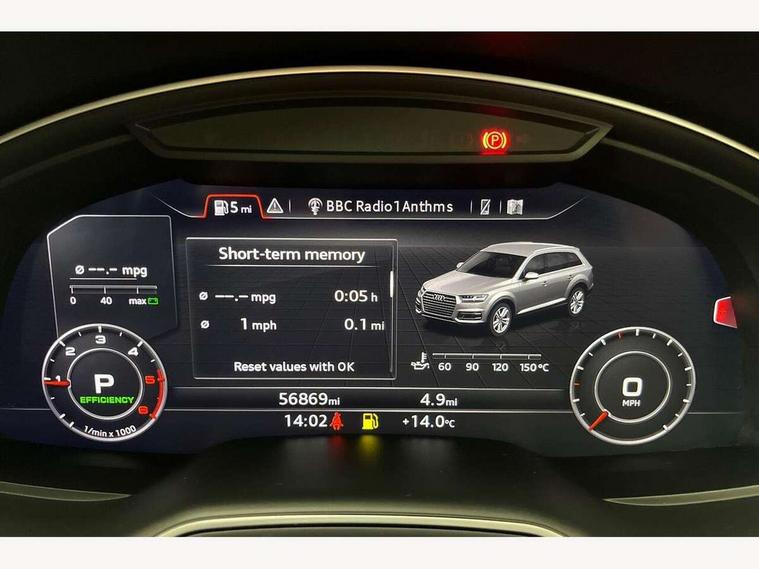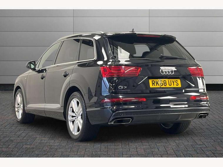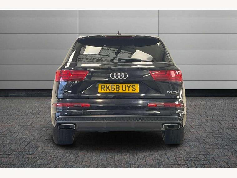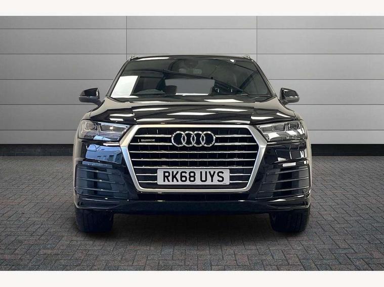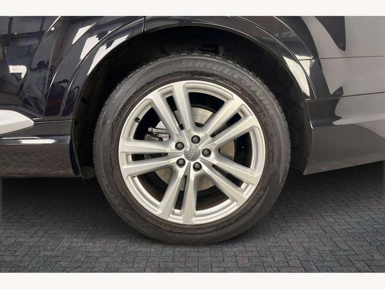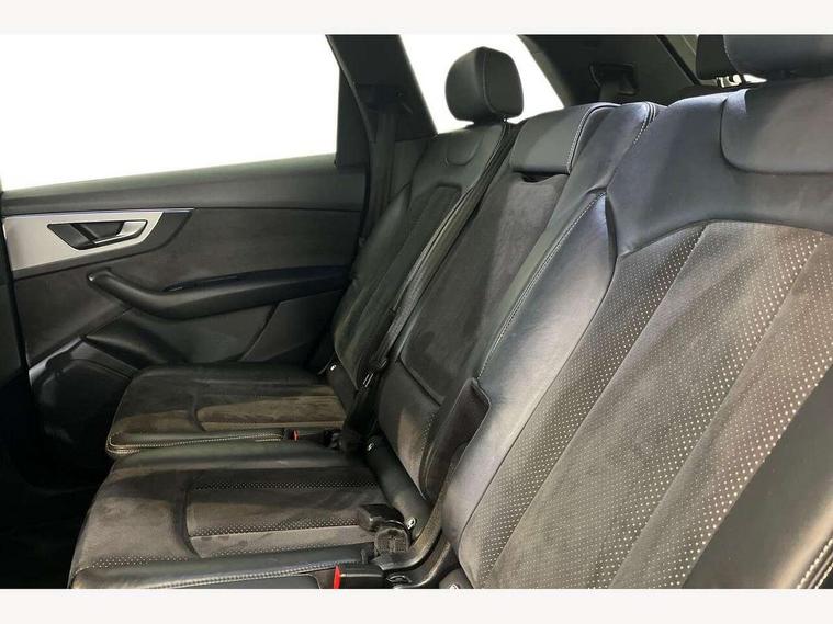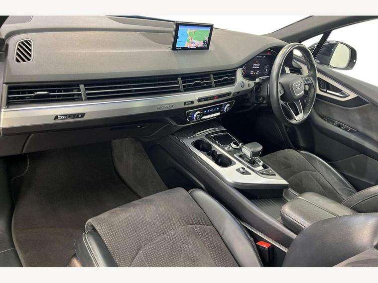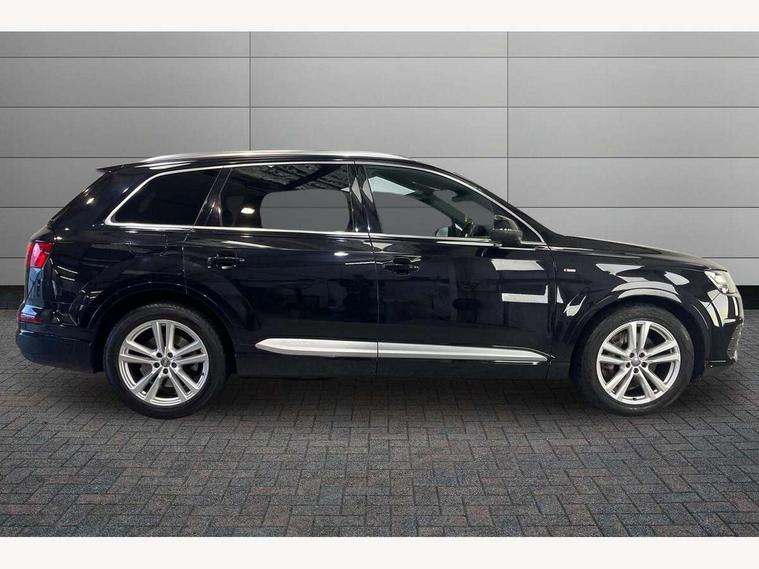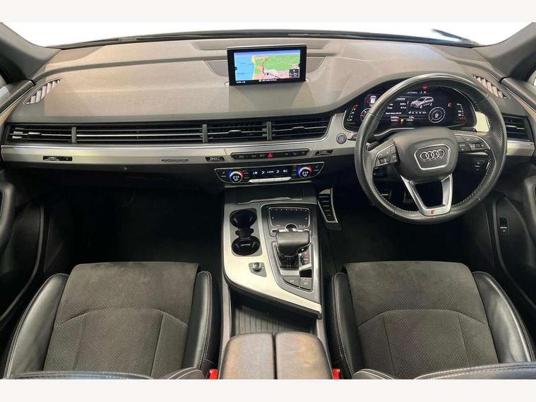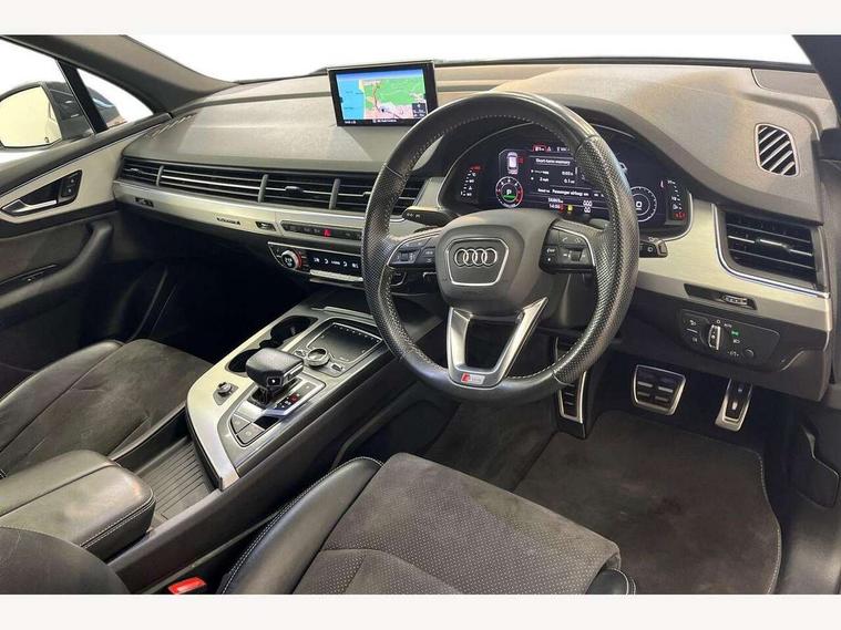 8.3" central fold-down colour display with high-resolution graphics, Audi connect safety and service (e-call), Audi drive select, Audi phone box with wireless charging, Audi smartphone interface, Audi virtual cockpit - 12.3" high-resolution LCD display with fully customisable instrument cluster, Colour driver's information system display, MMI - Multi Media Interface control system, MMI navigation plus with MMI touch, Mobile phone preparation with bluetooth interface, Power tailgate, Service interval indicator, Servotronic speed related PAS, Speed limiter, Stop/start system, Voice control system, Adaptive air suspension, 2 USB ports, 2x SD card slot, Audi music interface, Aux-in socket, DAB digital radio module, DVD System, MMI radio plus, Acoustic windscreen, Auto dimming rear view mirror, Electric front+rear windows, Electric/heated/folding door mirrors with memory, Green tinted heat insulating glass, Headlight washers, High beam assist, LED daytime running lights, Loading sill protector in stainless steel, Platinum grey front lip spoiler, Privacy glass, Rain and light sensors, Rear wiper, Roof spoiler, S Line badge on wings, S Line body styling, S Line front and rear bumpers, 2 cupholders in front centre console, 35/30/35 split fold 2nd row seats, Door sill trims with S line logo, Electric 3rd row 50/50 split/fold, Electrically adjustable front seats with electric 4- way lumbar support and driver memory function, Front ashtray and cigar lighter, Front centre comfort armrest with storage + cupholders, Front head restraints, Front/rear floor mats, Gearshift paddles, ISOFIX child seat mounting for 6 passenger seats with front passenger airbag deactivation includes top tether, Leather gear knob, Luggage compartment cover, Rear centre armrest with 2 cupholders, Rear headrests, Stainless steel pedals, Sunvisors with illuminated vanity mirrors, Interior light pack - Q7, 3 point seatbelts on all seats, ABS+Electronic Brake force Distribution, Curtain airbags, Driver and passenger airbags, EDL + ASR, Electrically operated child locks on rear doors, Electromechanical parking brake, Electronic stability control, ESP, Front side airbags, Hill descent control, Hill hold assist, Seatbelt warning, Traction control, Tyre pressure loss indicator, Warning triangle and first aid kit, Anti theft alarm, Anti-theft wheel bolts, Immobiliser, Keyless Go access/ignition system, Remote central locking, Chrome door inserts, Tool kit, Tyre repair kit,