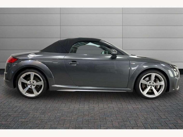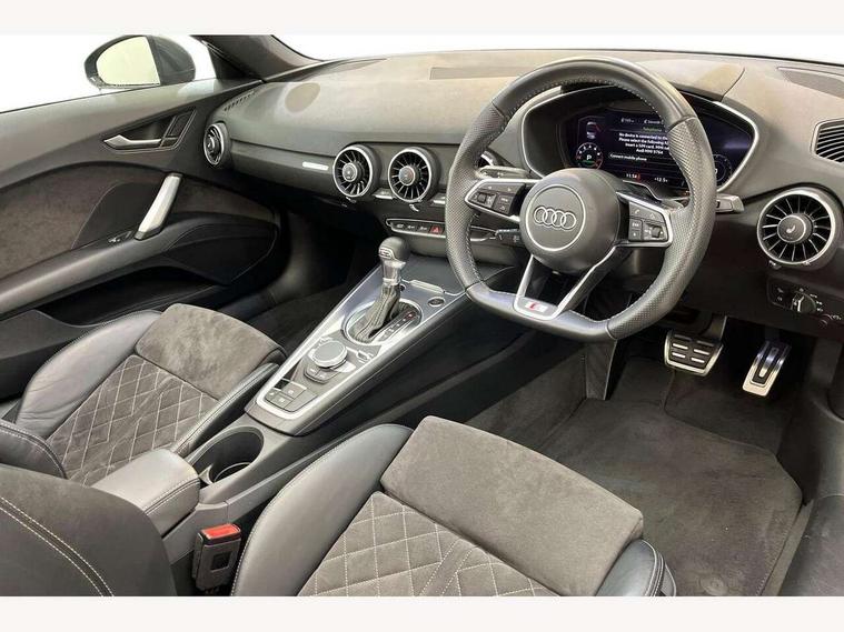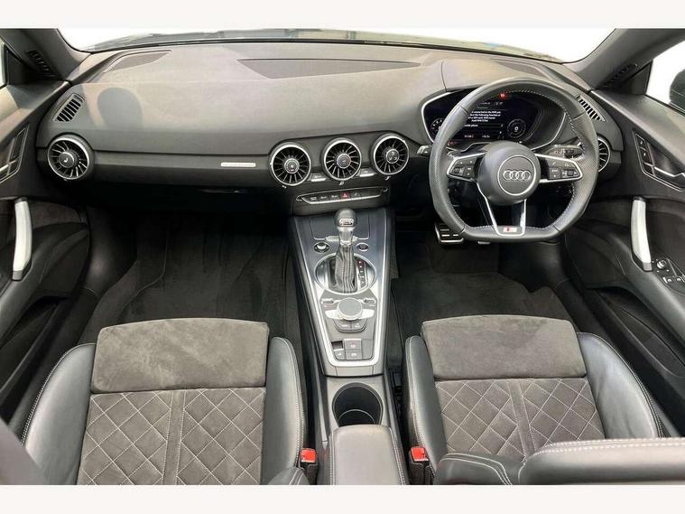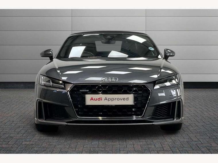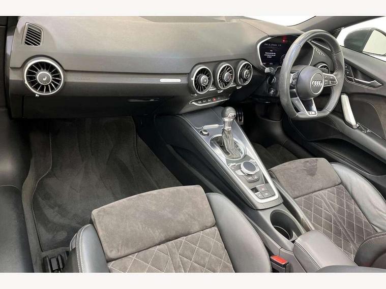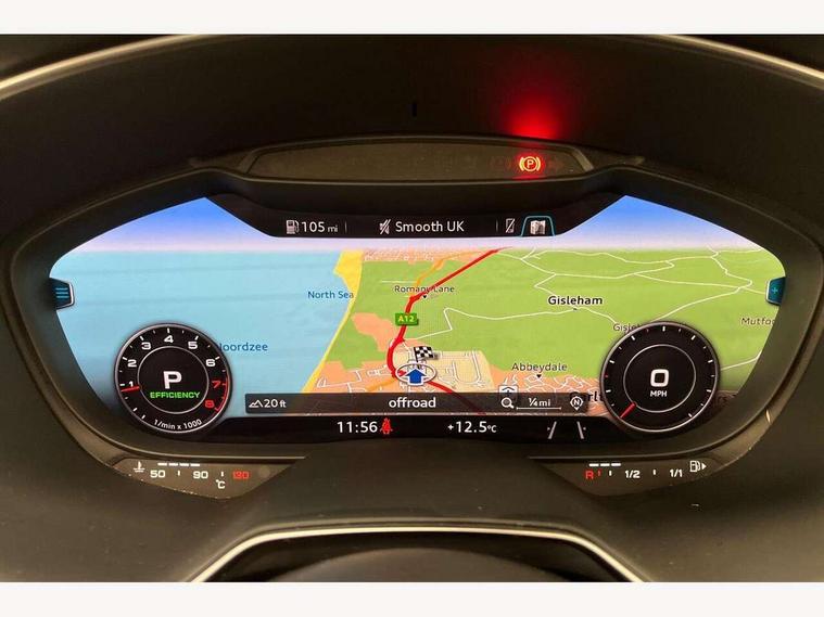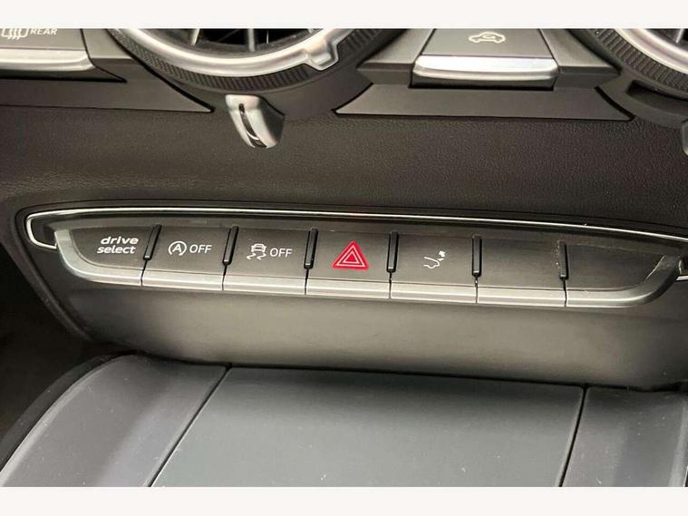 Audi active lane assist, Audi drive select with 4 Pre configured modes, Cruise control + speed limiter, MMI touch panel, Mobile phone preparation with bluetooth interface, Progressive power assisted steering, Rear parking sensors, Service interval indicator, Start/Stop system with energy recuperation, TP memo, 8 speakers, AM/FM radio, Audi music interface, Bluetooth audio streaming, DAB Digital radio, MMI Radio with CD player and SD/XC card slot, Auto dimming rear view mirror, Auto headlight range control, Body colour bumpers, Dynamic rear indicators, Electric front windows, Front fog lights, Green tinted heat insulating glass, Headlight wash system, High gloss black radiator grille, LED daytime running lights, Light and rain sensors, Retractable rear spoiler, S line badges on front wings, S Line body styling, S Line front and rear bumpers, S line rear diffuser with platinum grey insert, S line sill plates, Sunband for windscreen, 12V socket, 3 spoke flat bottomed high multi-function leather sport steering wheel with gearshift paddles, 4 way electric lumbar support for driver and front passenger, Black headlining, Door sill trims with S line logo, Extended aluminium look with stainless steel pedals, Front centre armrest, Front super sports seats, Heated front seats, Height adjustable driver's seat, Height adjustable front head restraints, Height/reach adjust steering wheel, ISOFIX child seat mounting for front passenger seat with airbag deactivation, Perforated leather gearknob, Rear head restraints, Rear top tether child seat ISOFIX attachment, S Line badge on steering wheel, Split folding rear seat, Tool kit, Top tether anchor plate for isofix child seat, Non smoking pack - TT/TT RS, 3 point front seat belts, ABS, ASR traction control, Brake energy regeneration, Curtain airbags, Driver and front passenger airbag with front passenger airbag deactivation, EDL traction control, Electromechanical parking brake, ESP, First aid kit, Front side airbags, Head airbags, Hill hold assist, Roll bar in glossy black, Seatbelt warning, Tyre pressure warning, Warning triangle, Anti theft alarm, Anti theft wheel bolts, Immobiliser, Keyless Go, Remote central locking, Matt brushed aluminium inlays, Tyre repair kit,