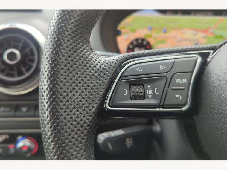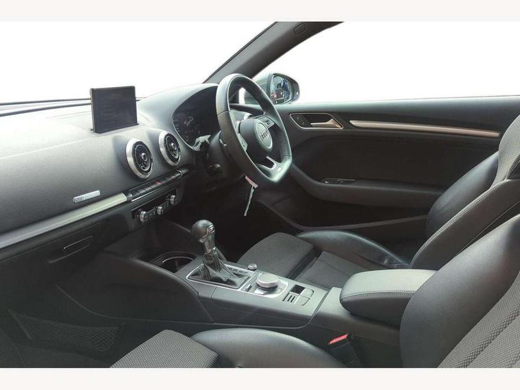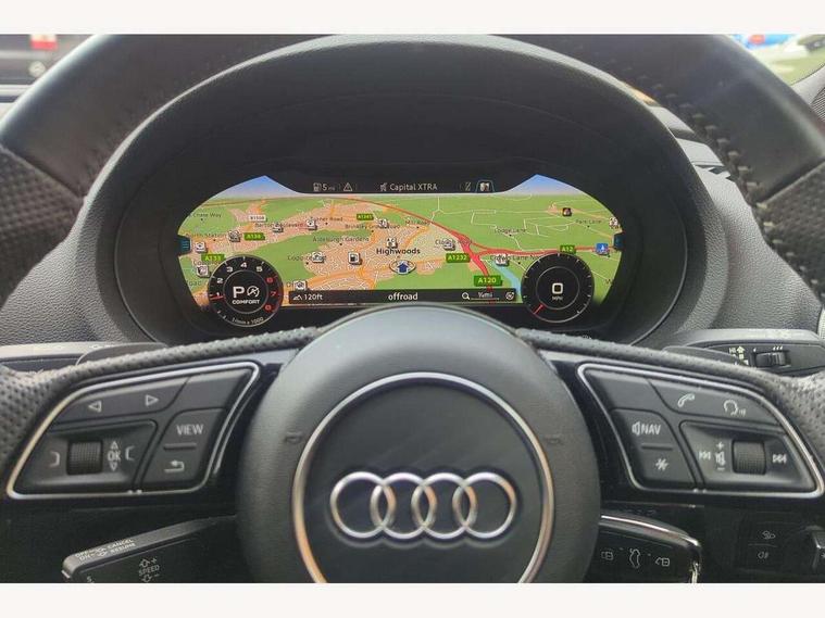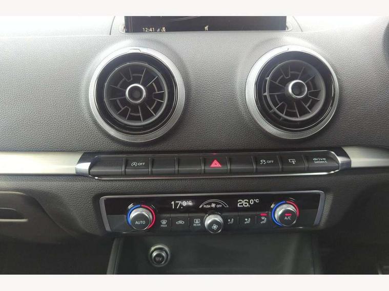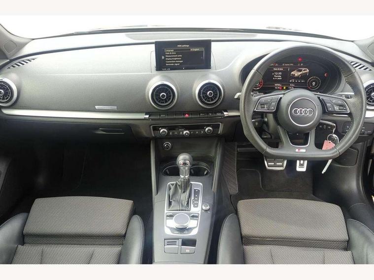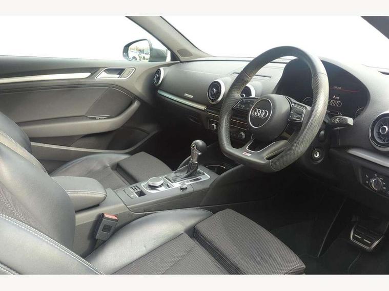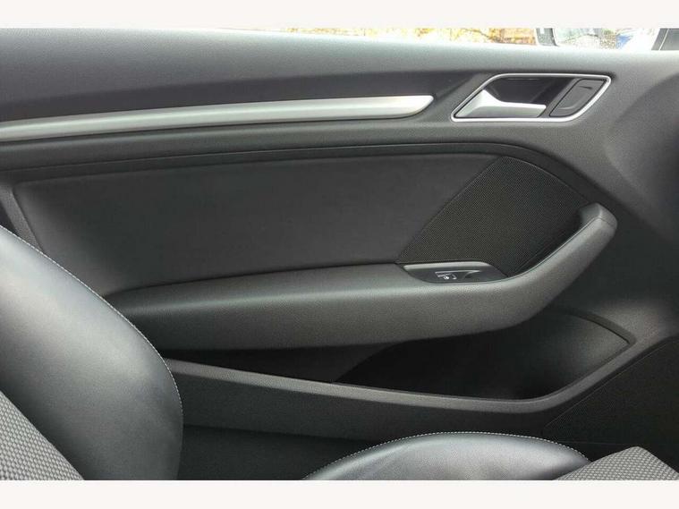 Audi connect, Audi drive select, Audi smartphone interface, Colour driver's information system display, Mobile telephone preparation - bluetooth interface, Service interval indicator, Speed limit display, Voice control system, 2 USB ports, Audi music interface, Auxiliary input socket, DAB Digital radio, Aluminium window trim, Body colour bumpers, Body colour door mirrors with integral indicators, Body colour roof spoiler, Chrome exhaust tailpipes, Electric front windows, Electric operated/heated door mirrors, Heated windscreen washer jets, LED daytime running lights, Matt black radiator grille, Rear wiper, S Line body styling, Sport specific side air inlet grille and diffuser insert, 3 adjustable rear headrests, 3 spoke flat bottomed multi-function leather steering wheel, 4 lashing points to secure luggage, Adjustable front armrest, Black cloth headlining, Dual zone electronic climate control, Front and rear interior lights with delay, Front passenger seat isofix location point, Front/rear floor mats, Height adjustable front seats, Height/depth adjustable steering column, Illuminated door sills, Illuminated glovebox, ISOFIX child seat preparation+airbag deactivation, Jack and tool kit, Stainless steel pedals, Steering wheel gearshift paddles, Storage compartment in centre console, Storage compartment under front seats, Storage compartments in doors, LED interior light pack - A3/RS3, Light and rain sensor pack - A3 Hatchback/Sportback, Storage and luggage pack - A3/RS3, 3 point seatbelts on all seats, ABS/EBD, Active bonnet, Active front headrests, ASR, Curtain airbags, Driver and passenger side airbags, Driver/Front Passenger airbags, Drivers knee airbag, EDL, Electromechanical parking brake, ESC - Electronic Stability Control + traction control, Front passenger airbag deactivation, Manual rear child locks, Multi-Collision braking, Seatbelt warning, Tyre pressure monitor, Warning triangle and first aid kit, Anti theft alarm, Anti-theft wheel bolts, Remote control central locking, Thatcham category 1 alarm + immobiliser, Aluminium air vent surrounds, Aluminium trim elements, Space saver spare wheel,
