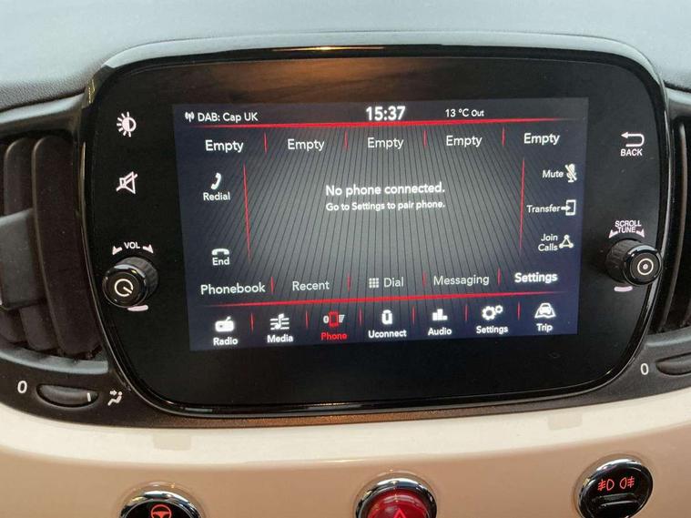 Apple car play/Android Auto, Cruise control, E-call, External temperature gauge, Power assist steering, Rear parking sensor, Speed limiter, Stop/start system, Trip computer, 4 speakers, 7" HD Touchscreen Radio, Bluetooth, USB and DAB, Rear speakers, 3rd brake light, Auto headlights, Body colour bumpers, Body coloured electrically adjustable door mirrors, Chrome plated exterior door handles, Dolcevita badge on fender, Dusk and rain sensors, Electric front windows, Fixed glass sunroof with sunblind, Front fog lights, Halogen headlamps, Heat insulated glass, Heated rear windows with wash wipe, LED daytime running lights, Rear side wing doors, Rear wiper, 1 passenger grab handle, 2 seat bench in second row, 50/50 split folding rear seats with height adjustable rear headrests, Air conditioning, Auxilliary 12V power socket, Chrome kit, Front headrests, Height adjustable drivers seat, Height adjustable steering wheel, Isofix child seat preparation, Single front passenger seat, Techno leather steering wheel with audio controls, 7 airbags - Driver, passenger, side, window and drivers knee airbags, ABS/EBD, ESC + ASR/MSR + HBA + Hill holder, Passenger airbag deactivation system, Traction control, Tyre pressure monitoring system, Automatic door locking, Immobiliser, Locking fuel filler cap, Remote central locking, 15" Alloy wheels,
