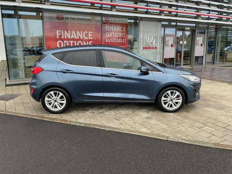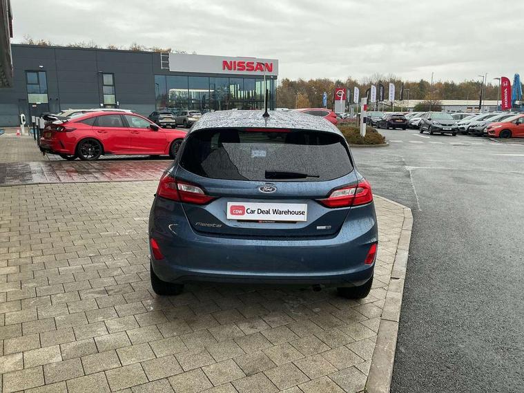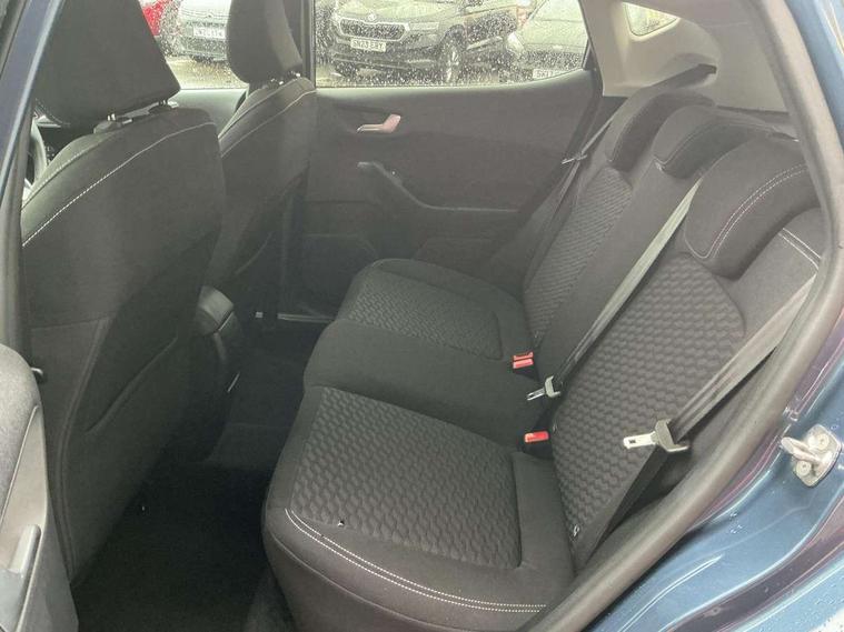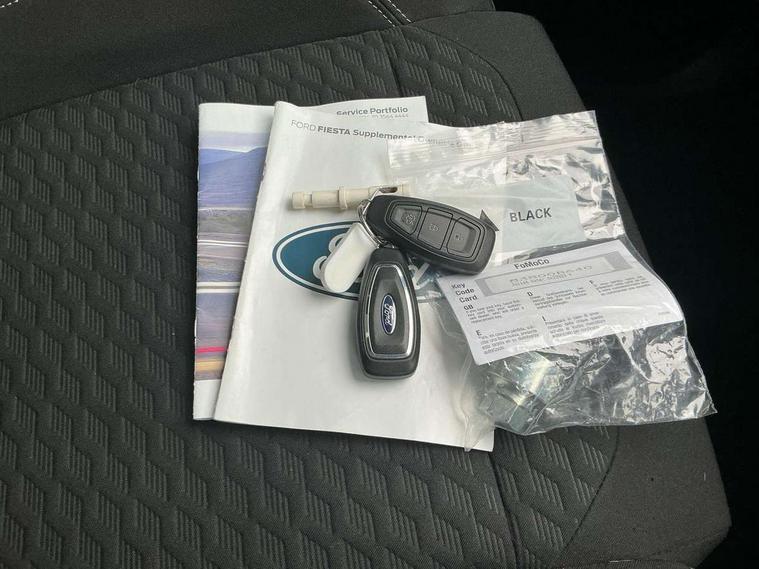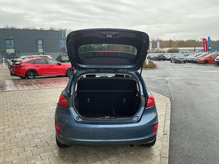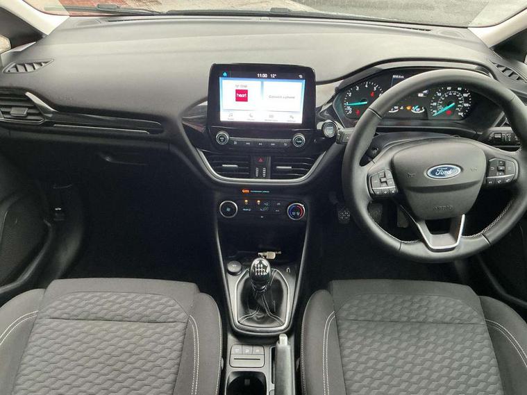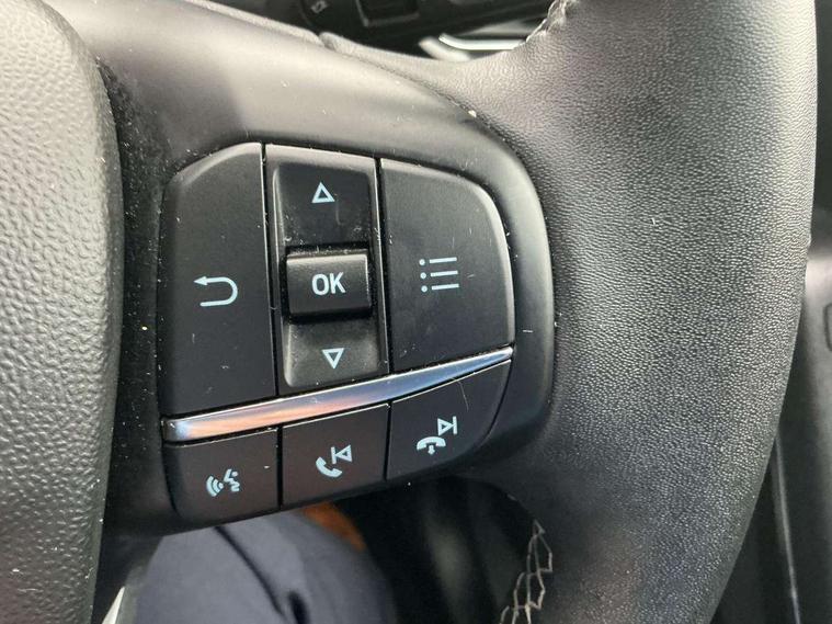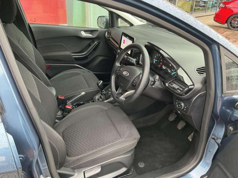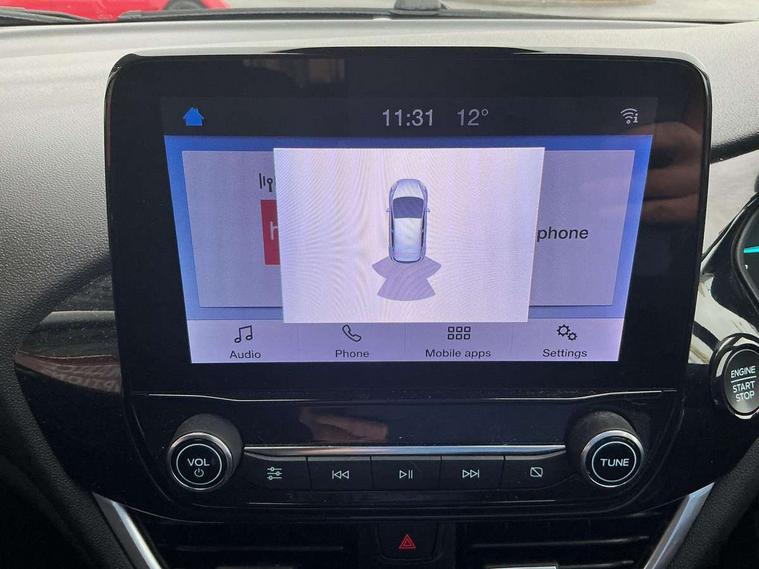 Bluetooth system, Electric power steering, Ford easy fuel, Ford SYNC 3 Navigation system incl 8" touchscreen, 7 speakers, FordPass connect, Apple carplay, android auto, voice control and emergency assistance, Rear parking distance sensors, Selectable drive modes (Normal, Sport, Track), Trip computer, 2 USB ports, Auxiliary input socket, DAB Digital radio, Steering wheel mounted controls, Body colour bumpers, Body colour door handles, Body colour rear spoiler, Body coloured electrically operated and heated door mirrors with side indicators, Chrome beltline trim, Chrome front grille, Chrome lower window surround, Cornering front fog lights, Electric front windows/one touch facility, Electric rear windows, Quickclear heated windscreen, Rain sensing wipers and auto dimming rear view mirror, Rear privacy glass, Rear wiper, 3 spoke leather trimmed steering wheel with audio control, 60/40 split folding rear seat, Adjustable head restraints, Boot carpet, Centre console with opening armrest, 2x cupholders, 12v and USB, Chrome inner door handles, Cloth upholstery, Footwell illumination, Front floor mats in velour, Front map reading lights, Front seat and rear pockets, Illuminated glovebox, Leather gaiter, Load area light, Luxury woven headliner, Manual 2 way passenger seat adjust, Manual 4-way driver seat adjust, Manual air conditioning, Overhead console with sunglasses holder, Pollen filter, Rake/reach adjustable steering wheel, Sensico wrapped steering wheel, NCAP Pack - Fiesta, 3 point seatbelts on all rear seats, ABS+EBA, Curtain airbags, Driver and passenger airbags, Drivers knee airbag, Electronic stability control with hill start assist, Front passenger airbag deactivation, Front side airbags, Seatbelt warning, Two tone horn, Tyre pressure monitoring system, Keyless start with 'Ford Power' starter button, MyKey system, Remote central locking & engine immobiliser, Thatcham Cat.1 alarm, 16" 10 spoke alloy wheels,