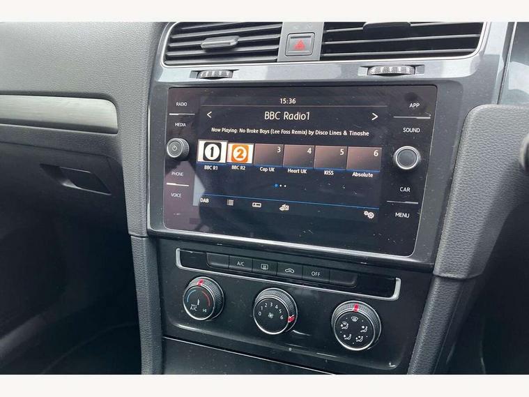 'Lights On' Reminder warning buzzer, 8" touch screen, Adaptive Cruise Control with pedestrian detection and speed limiter, App-Connect, Bluetooth hands free telephone connection, Brake pad wear indicator warning light, Driver alert system, Driver profile selection, Exterior temperature gauge, Front assistant collision mitigation, Instrument cluster in white, Multifunction computer, PAS - speed related, Rev counter, Trip and service interval display, Ultrasonic front and rear optical and audible parking sensors, Warning buzzer and light for front seatbelts unfastened, XDS electronic differential lock, CD/MP3/WMA, USB and SD card reader, aux-in, Composition media system, DAB Digital radio, Auto dimming rear view mirror, Automatic coming/leaving home lighting function, Automatic headlights, Black front air intake and radiator grille with chrome insert, Black rear diffuser, Body colour bumpers, Body colour door handles, Body colour door mirrors, Electric front windows, Electric rear windows, Electrically adjustable and heated door mirrors, Heated rear windscreen, LED daytime running lights, LED rear lights, Rain sensor, Rear roof spoiler, Rear windscreen washer and wiper with interval delay, 12V socket in luggage compartment, 3 rear headrests, 3 spoke steering wheel, 60/40 split folding rear seat, Bag hook in luggage compartment, Boot lashing points, Cooled glovebox, Courtesy light delay, Cover for storage compartment in centre, Dust/pollen filter, Front and rear reading lights, Front centre armrest with storage box and rear air vents, Front passenger seat height adjust, Front seat back storage pockets, Grab handles, Height adjustable driver's seat, Height/reach adjust steering wheel, Illuminated vanity mirrors, Isofix preparation for 2 rear child seats, Load through provision with rear centre armrest and cupholders x2, Luggage compartment cover, Luggage compartment lighting, Multifunction leather steering wheel with leather gear knob/handbrake grip, Overhead storage box, Pearl grey headlining, Storage box in luggage compartment, Storage compartments in doors, Sun visors, Variable boot floor, height adjustable and removable, Mirror pack - Golf, 3 point height adj front seatbelts + pretensioners, 3 rear 3 point seatbelts, ABS, Automatic post collision braking, Child locks on rear doors, Driver/Front Passenger airbags, Driver/Passenger whiplash optimised head restraints, Drivers knee airbag, Electronic parking brake with auto hold, ESP with EDL + ASR, Front and rear curtain airbags, Front passenger airbag deactivation, Front side airbags, Pre crash system, Tyre pressure monitor, Alarm with interior protection, Electronic engine immobiliser, Remote central locking with 2 remote folding keys, Brushed dark metal decorative inserts in dash and front door panels, Chrome-plated light switch surround, Polar night black centre console, Steel space saver spare wheel,