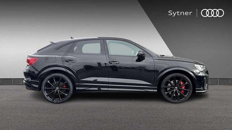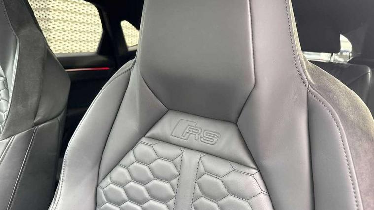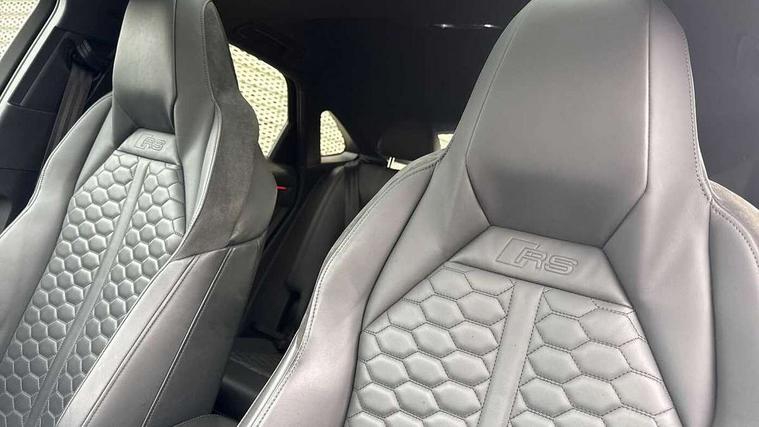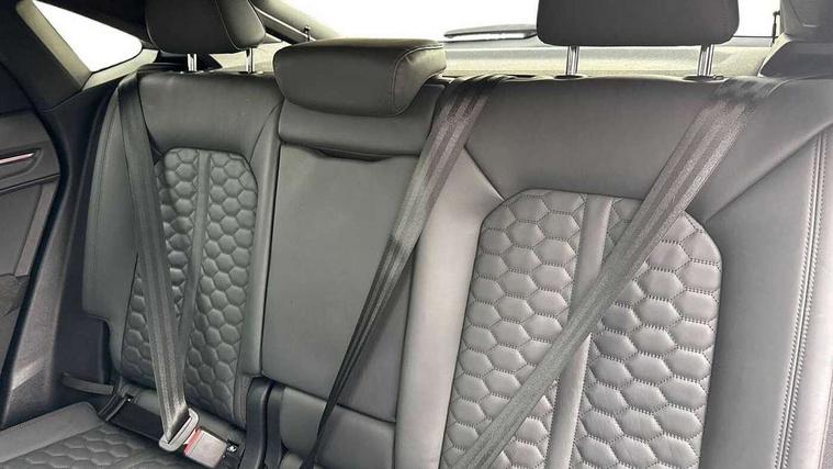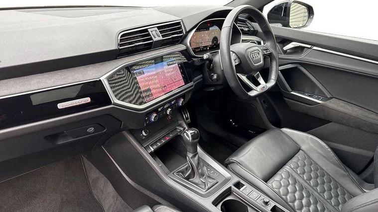 Audi drive select with new RS modes, Audi lane departure warning, Audi parking system plus with front and rear sensors, Audi virtual cockpit plus - 12.3 inch display, Bluetooth interface, Camera based traffic sign recognition, Emergency e-call, MMI Navigation Plus with high resolution 10.1 inch touchscreen colour display, Power operated tailgate, Progressive steering, Smartphone interface includes wireless Apple carplay/Android Auto, Start stop system with recuperation, Voice control system with natural language interaction, Quattro all wheel drive, 2 USB-C ports with charge and data functions, Audi sound system, DAB digital radio module, Acoustic windscreen, Audi Beam uses LEDs to project the Audi Sport logo, Auto dimming frameless rear view mirror, Body colour rear spoiler with lip in gloss black, Electrically folding, adjustable and heated door mirrors with integrated LED side indicators and kerb view function for passenger side, Flared wheel arches, Flat slits on single frame grille, Headlight washers, High gloss black finish B and C pillars, Honeycomb radiator grille in gloss black, Illuminated door sill trims with RS logo, LED headlights with LED daytime running lights, LED rear lights, LED third brake light, Panoramic glass sunroof, Privacy glass dark tinted rear and rear-side windows (from B-pillar backwards), Rain and light sensors, Rear side wing doors, Rear wiper, RS specific bumpers with large front air inlets in black, RS Sport exhaust system, dual branch with exhaust flap control and gloss black oval tailpipe trims, Tinted rear windows, Variable front intermittent wipers, 3 seat bench in 2nd row, 4 way electric lumbar support for driver and front passenger, Adjustable rear seat bench/backrest with centre armrest and cupholder, Black Alcantara elements - dashboard and the armrests in the front and rear doors, Black cloth headlining, Dual zone electronic climate control, Electrically adjustable front seats, Fine Nappa leather upholstery with front sports seats + honeycomb stitching and RS embossed logo, Front and rear floor mats, Front and rear head restraints, Front centre armrest, Heated front seats, ISOFIX child seat mounting for front passenger with airbag deactivation and outer rear seat including top tether attachment point for outer rear seats, Single front passenger seat, Stainless steel luggage compartment sill finisher, Stainless steel pedals, Ambient lighting pack - RS Q3, Black styling pack - RS Q3, Non smoking pack - RS Q3, 3x3 point rear seatbelts, 6 airbags - Driver, front passenger, curtain and side windows, Audi pre-sense front with pedestrain and cyclist recognition, Electrically operated child locks on rear doors, Electromechanical parking brake, Electronic stabilisation control including ABS, ASR and EDL, Front seatbelt reminder, Hill descent control, Hill hold assist, Pre sense basic, RS brake system, Seatbelt monitoring, Tyre pressure warning, Warning triangle and first aid kit, Advanced key, Anti theft alarm, Anti theft wheel bolts, Immobiliser, Aluminium look interior elements, Detail dashboard around MMI touch colour display in glass look, black with surround in aluminium look, Inlay - Black piano finish, Tool kit, Tyre repair kit,
