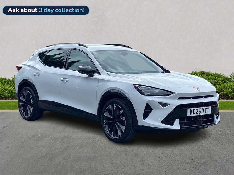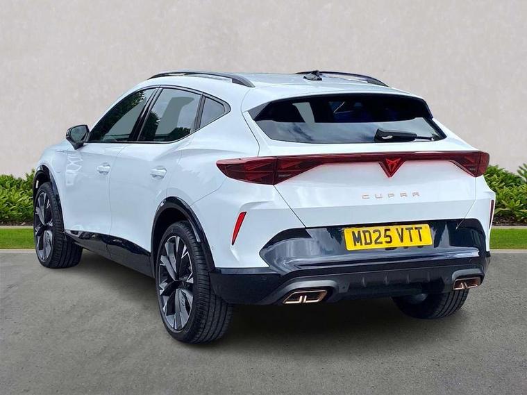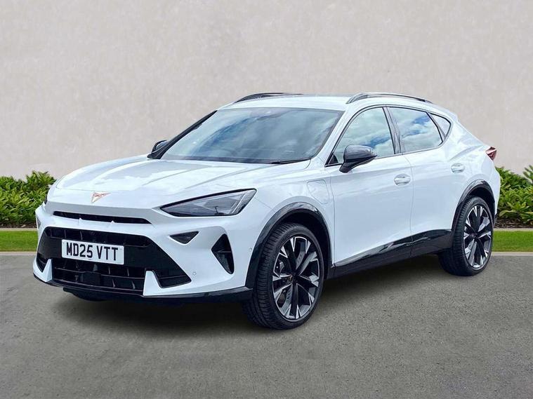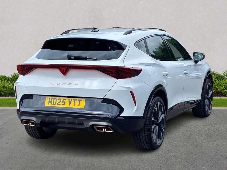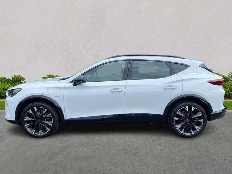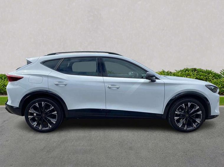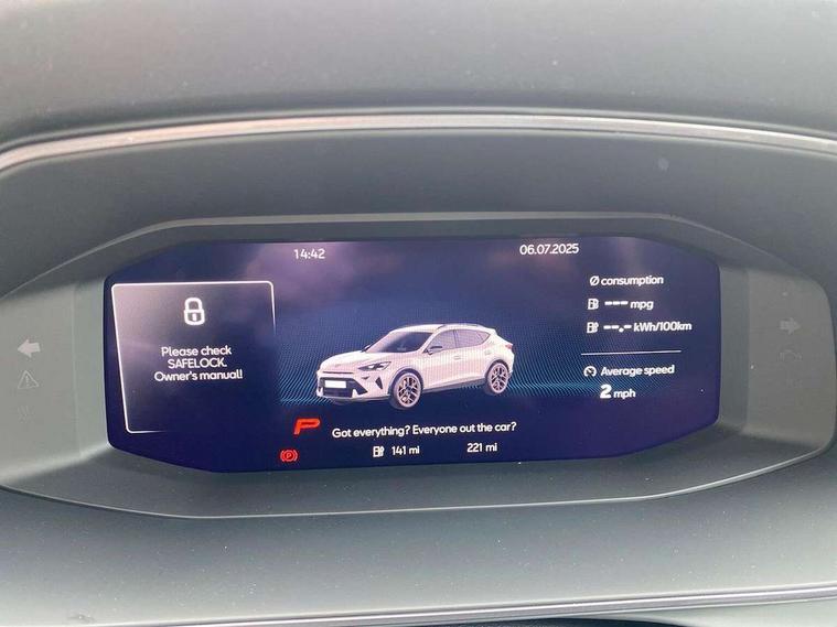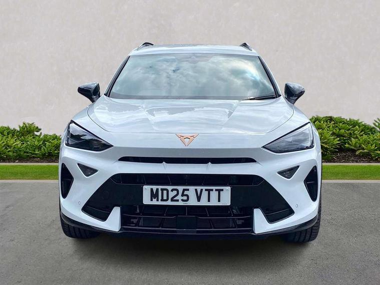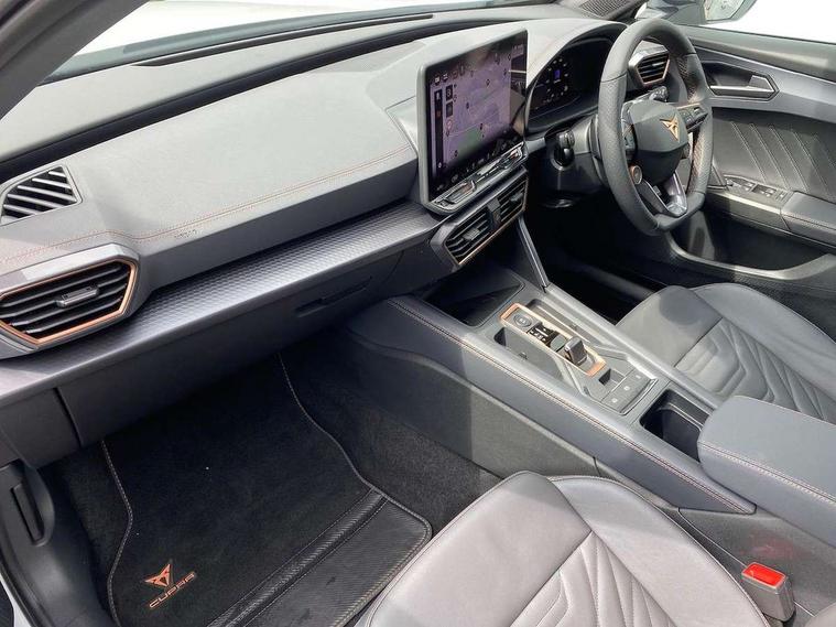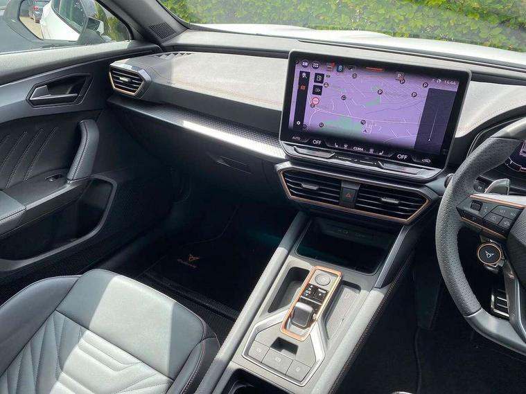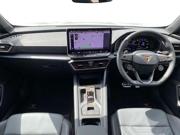 10.25" digital cockpit and configurable dashboard, Adaptive cruise control with follow-to-stop and speed limiter, Advanced driver alert system, Advanced lane assist with semi-automatic vehicle control in a medical emergency and traffic jam assist, Dynamic chassis control with driving profile selection (Comfort, Sport, CUPRA, Individual), Dynamic road sign display, Emergency steering support with turn assist, Forward collision warning with automatic braking, Full link phone integration, Intelligent park assist, RPM, trip computer, outside temp gauge, instrument light brightness, low fuel warning light, lights on reminder, gearshift indicator, Service interval indicator, Side and exit assist, Speed sensitive power steering, Start/stop system with regenerative braking, Top view camera, Virtual pedal and electric tailgate, Voice control system, Wired Android Auto, Wireless apple carplay, Wireless phone charger, 10 amp mode 2 charging cable, 32 amp mode 3 charging cable, Adaptive chassis control with continuous operation, CUPRA sport suspension, Electronic locking differential and dynamic traction support, 2 front and 2 rear USB type C sockets, Media system with navigation, 12.9" touchscreen display, voice control, DAB, steering wheel mounted controls, Auto dimming rear view mirror, Body colour door handles, Body coloured bumpers, Dark grey wing mirror, Daytime running light with automatic headlight control and coming home feature, Door panel ambient lighting, Dynamic headlight range control, Electric front/rear windows, Electrically adjustable heated and folding door mirrors with memory function, Gloss black roof rails and window surrounds, High beam assist, LED 3rd brake light, LED front fog lamps with cornering function, LED Taillights with dynamic indicator, Matrix LED headlights with multifunction camera, Rain sensing wipers, Rear diffuser with copper simulated exhaust pipes, Rear fog lights, Rear side wing doors, Rear wash/wipe, Tinted rear windows, Welcome lights (within exterior mirror housing), 12V socket, 2 front and 2 rear reading lights, 3 seat bench in 2nd row, 60/40 split rear bench seat with armrest and mechanical seat release, Black headlining, Black interior roof lining, Cupra sports pedals, Dust/pollen filter, Electrically adjustable front seats with lumbar support and memory function, Front and rear head restraints, Front centre armrest, Heated front seats, Heated supersports multifunction leather steering wheel with satellite buttons and gear shift paddles, Height/reach adjust steering wheel, Illuminated aluminium doorsteps, Illuminated interior front door sills, Illuminated sunvisor with mirror, Isofix, Leather dashboard, door insert and side trim panel, LED smart wraparound lighting, PVC/Leather upholstery, Satellite steering wheel, Single front passenger seat, Storage pockets on rear of front seats, Three zone climate control with control panel in rear, 3 point seatbelts on all rear seats, ABS, Brake control system - ESC and brake booster, Child proof door locks, Driver and front passenger airbags with front passenger airbag de-activation, Electronic parking brake, Front and rear disc brakes, Front side curtain airbags, Hill hold control, Pre-crash front and rear seat belt tensioner, window closure and hazard lights, Public e-call, Seat belt reminder for front and rear seats, Tyre pressure monitoring system, Anti theft alarm system, KESSY Advanced - Keyless start, keyless entry with SAFELOCK, Locking wheel bolts, Copper and aluminium interior detailing, 19" Artic machined sport black and silver alloy wheels, Breakdown and tool kit,