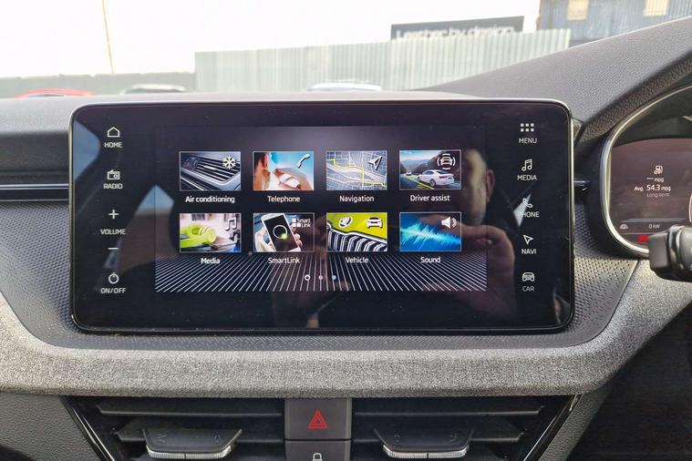 Advanced driver attention and drowsiness monitor, Bluetooth, e-Call (emergency call), Front assist system, PAS, Rear parking sensors, Rear view camera, Speed limiter, Tailgate, Traffic sign recognition, Virtual Cockpit - 10.25" digital display, Voice control system, Wireless smartlink, 4 USB C ports, 8 Speakers, 9.2" Skoda navigation display, DAB radio, Auto dimming rear view mirror, Automatic headlamp activation with Coming home and Leaving home feature, Automatic high/low beam, Body colour bumpers, Body colour door mirrors and handles, Chrome moulding around grille, Front and rear electric windows, Full LED headlights, Heated rear window, LED 3rd brake light, LED brake lights, LED daytime running lights, LED front turning lights, LED high beam, LED low beam, LED taillights, Rear LED fog light, Rear side wing doors, Rear wiper, Tinted windows, Unique dark chrome design logo on alloy wheels, 12V socket in luggage compartment, 3 seat bench in 2nd row, Black / Grey armrest stitching, Black hotstamping, Cargo elements, Chrome inner door handles, Door inserts in satin black, Driver and passenger sun visors with vanity mirror, Dual zone climate control, Front and rear roof lights, Front centre armrest, Front head restraints, Glasses storage in roof liner, Height adjustable driver seat, Height adjustable passenger seat, Ice scraper, Illuminated glove compartment, Inner circulation control with pollen filter, ISOFIX for front passenger seat, Isofix preparation for back seats, Leather gearknob and handbrake lever, Loft cloth upholstery, Luggage net under rear parcel shelf, Manual lumbar support for front seats, Net package and top tether hooks in boot space, Pearl grey ceiling, Pocket on the back of both front seats, incl. mobile phone pockets, Single front passenger seat, Skoda lettering on steering wheel, Textile floor mats, Third rear headrest, Ticket holder, Top tether for front passenger seat, Umbrella in driver's door, 3x3 point rear seatbelts, ABS, Child locks, Curtain airbags and front side airbags, Disc brakes, Driver and front passenger airbags, ESP, Hill hold control, Manual leather parking brake, One tone horn, Passenger airbag switch off function, Seatbelt reminder for driver and front passenger, Tyre pressure monitoring system, Anti theft alarm system with interior monitoring, backup horn and towing protection, Anti-theft wheel bolts, Remote central locking with 2 remote folding keys, SAFE function for remote central locking, Decord pad, door inserts Kota uni,