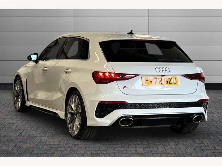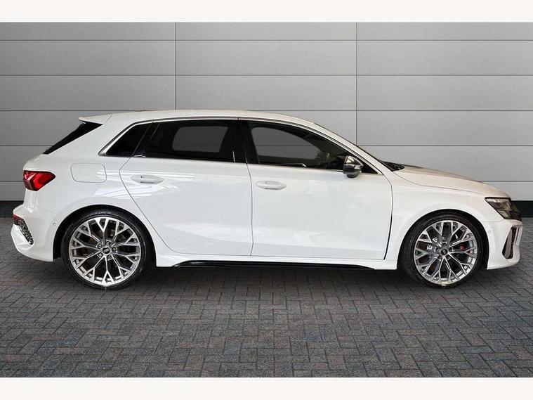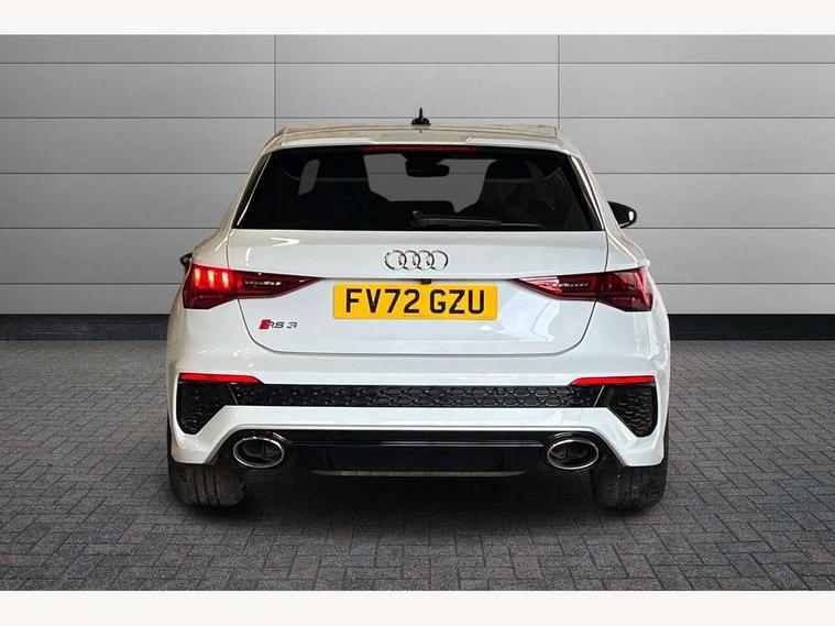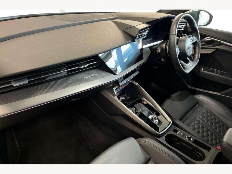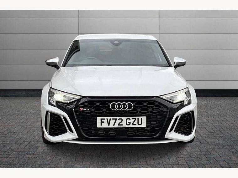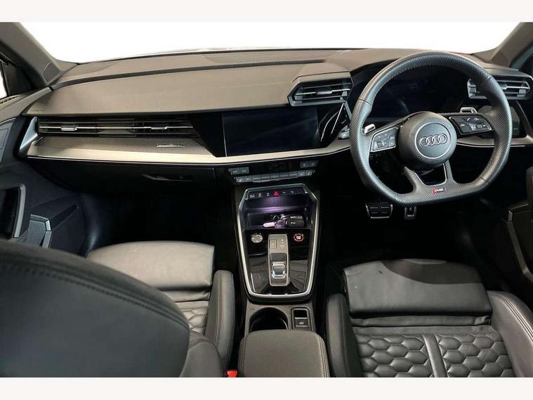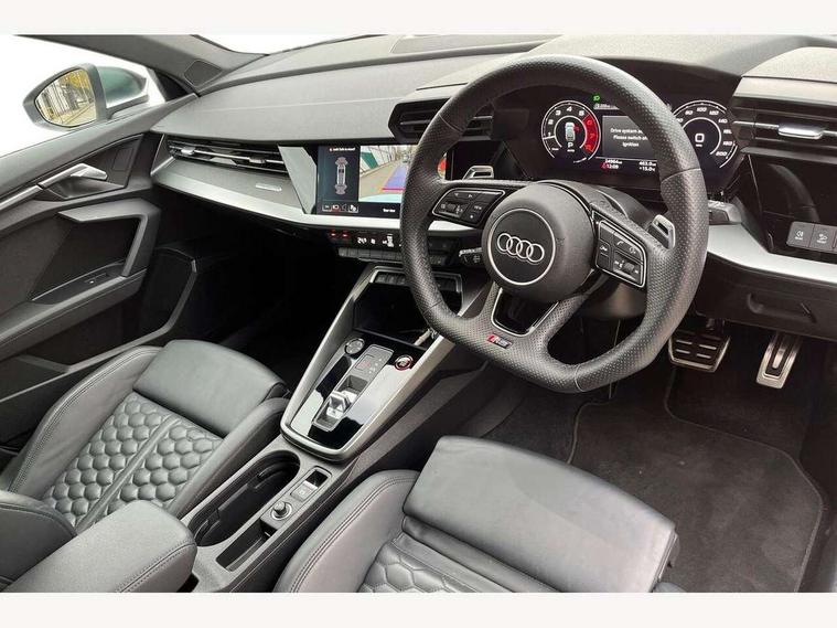 Audi smartphone interface, Audi virtual cockpit with RS specific display 12.3" full colour digital instrument cluster, Automatic start/stop system with recuperation, Bluetooth interface, Collision avoidance assistant, Emergency e-call, Lane departure warning system, Legal emergency call, Manual boot opening, Parking assist with parking system plus, Progressive power assisted steering, Quattro permanent four wheel drive, Rear suspension, Audi sound system impressive sound with 10 loudspeakers including centre speaker and subwoofer, 6-channel amplifier with a total output of 180 watts, DAB Digital radio, 3rd brake light, Acoustic glass windscreen, Audi beam uses LEDs to project the Audi sport logo onto the ground as you exit your RS 3, Auto dimming rear view mirror, Black side skirts, Body colour roof, Daytime running lights, Door mirrors - electrically adjustable, heated, folding and auto dimming on both sides, Headlight washers, LED headlights with LED rear lights + dynamic rear indicators, Light and rain sensors, Matt aluminium door mirrors, Matt aluminium window trims, Privacy glass - dark tinted rear and rear side windows from B-pillar backwards, Rear side wing doors, Rear window wiper and washer system, 3 seat bench in 2nd row, 40/20/40 split folding rear seat bench, Black cloth headlining, Dual zone electronic climate control, Front and rear headrests, Front centre armrest, Front sports seats RS embossed logo, Front/rear floor mats, Heated front seats, Honeycomb stitching and RS embossing, Illuminated door sill trims inlays in aluminium with RS 3 logo, Illuminated vanity mirror, Manually adjustable front seats, RS emblems, Single front passenger seat, Stainless steel pedals and front footrest in black, Aluminium interior elements pack - RS3, Ambient lighting pack - RS3, MMI navigation plus with MMI touch - RS3, RS bodystyling - RS3, Storage Pack - RS3, 3x3 point rear seat belts, ABS/EBD, ASR, Audi pre sense front, Driver/Front Passenger airbags, EDL, ESC - Electronic Stability Control + traction control, Front passenger airbag deactivation, Front side airbags with head airbags and interaction airbag, Hill hold assist, Seat belt reminder with passenger presence detection in rear, Tyre pressure loss indicator, Warning triangle and first aid kit, Anti theft alarm, Anti-theft wheel bolts, Electronically operated child lock, Remote control central locking, Carbon inlays, accent surfaces in the dashboard and centre console in platinum grey silk effect paint finish, 19" 10 Y spoke platinum grey, gloss turned finish alloy wheels, Tool kit, Tyre repair kit,