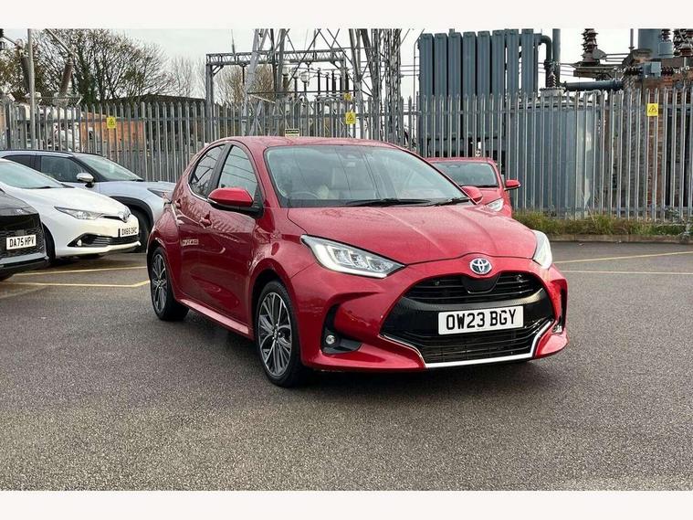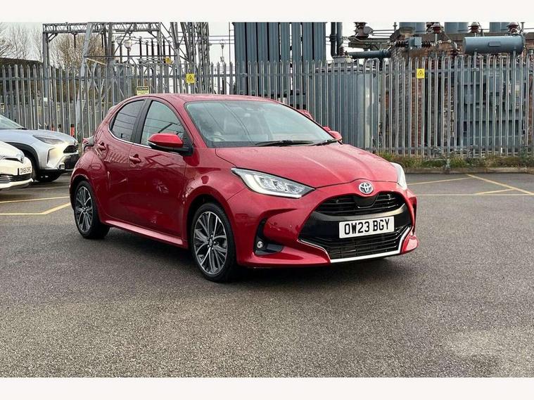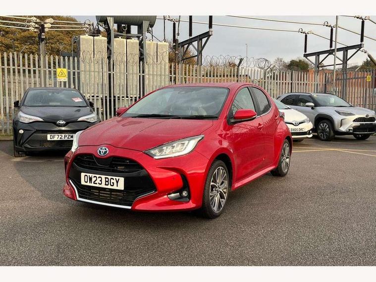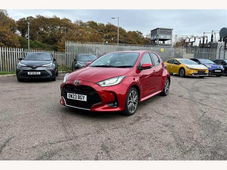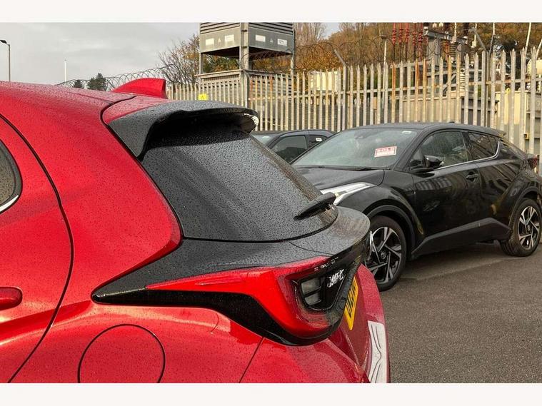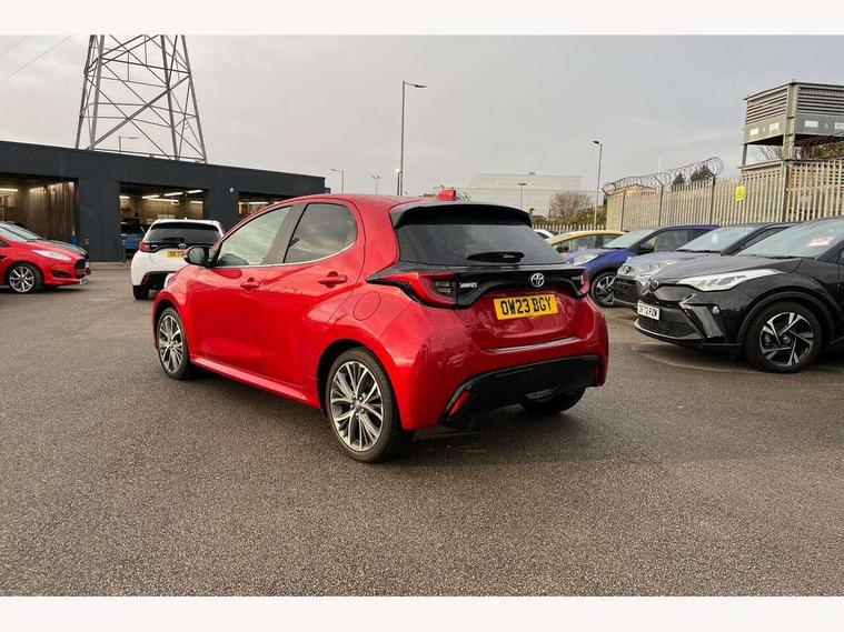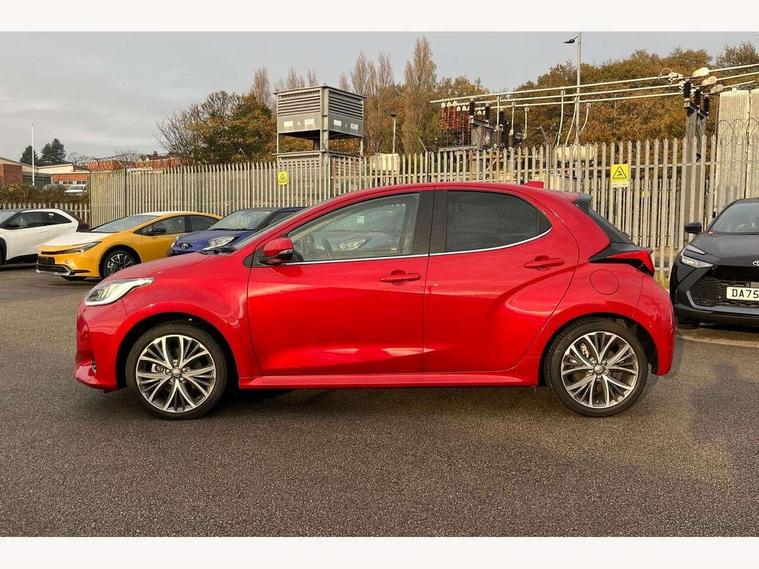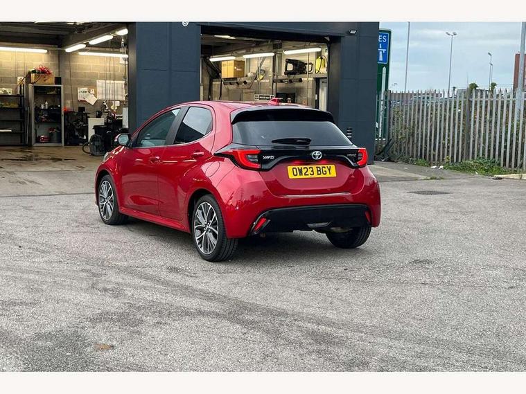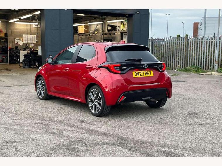 Adaptive cruise control, Adjustable speed limit with speed warning, Blind spot monitoring, Bluetooth connectivity, Colour binocular inspired displays with digital speedometer, E-call, Electric power steering, Hybrid energy display, Multi information display switches on steering wheel, Reversing camera, Smartphone integration with Apple CarPlay and Android auto, Tailgate, Touch 2 navigation system, Voice recognition, Vehicle Stability Control (VSC), 6 speakers, 9" HD multimedia display touch screen with Toyota smart connect, USB connection, Acoustic windscreen glass, Auto windscreen wipers, Automatic headlights, Automatically retractable door mirrors, Body coloured door mirrors, Electric adjustable heated door mirrors, Follow me home headlights, Front auto power windows with anti jam protection, Full LED rear lights, LED daytime running lights, LED front fog lights, LED front light guide, LED Headlights, LED High mounted stop lamp, LED Indicators, LED rear light guide, Manual headlight levelling, Painted chequered front grille, Rain sensor, Rear auto power windows with anti jam protection, Rear privacy glass, Rear side wing doors, Rear spoiler, Rear wiper, Satin lower front grille, Shark fin antenna, Turning signal integrated indicators in door mirrors, Variable front intermittent wipers, 3 adjustable rear headrests, 3 seat bench in 2nd row, 3 spoke leather steering wheel, 60/40 split folding rear seat, Active headrests, Adjustable boot height, Coat hooks in rear grab handles, Cup holders (2 front & door), Data Communication Module (DCM) connected services, Dual zone automatic air conditioning, Fabric seat with partial synthetic leather upholstery, Front armrest, Front sport seats, Glovebox, Grey roof lining, Height adjustable driver's seat, Height adjustable passenger seat, Isofix seat fixing, Leather gearshift, Map pockets on the backs of the front seats, Pollen filter, Shopping bag hooks, Single front passenger seat, Tilt/telescopic steering column, Parking pack - Yaris, 3 point seatbelts on all rear seats, ABS+EBD+Brake assist, Electronic parking brake, Emergency brake light system (EBS), Front passenger airbag on/off switch, Front seatbelt reminder, Hill start assist control (HAC), Rear child proof door locks, Rear seat belt reminder, Supplemental Restraint System (SRS) 8 airbags: Driver & passenger's airbags, dual side curtain airbags, side impact airbags, front centre airbag, Toyota Safety Sense 2, Precollison + Night time Pedestrian & Cyclist Detection, Lane Trace Assist, Auto High Beam, Intelligent ACC & Road Sign Assist, Tyre pressure warning system, 2x Master key, Alarm/immobiliser, Keyless smart entry with push button start, Remote AC via MyT, Remote locking via MyT, Remote powered central double locking doors, Satin chrome interior styling, Soft touch instrument panel, Space saver spare wheel,