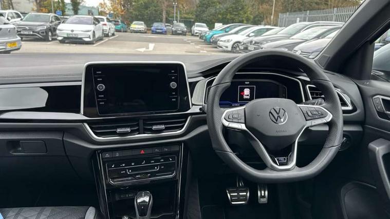 10.25" Digital cockpit pro, Advanced driver attention and drowsiness monitor, Emergency call service, Lane keeping system Lane Assist, Mobile phone interface, Modified key software - reduce switch off time for key status change to Long no motion, Online services, Park assist including front and rear parking sensors, Service interval indicator, Tailgate/trunk lid release from outside, Think blue trainer driver tips and journey analysis, Warning sound and light for front seatbelts unfastened, Wireless app connect, Battery regeneration during braking, Start/stop function with battery regeneration, DAB Digital radio, Diversity antenna for FM reception, Front and rear 6 speakers, Music playback - MP3, WMA and AAC files, Premium USB cable in choice of either Apple or Android smartphone compatibility, SD card slot, Simultaneous pairing of 2 compatible mobile devices, Title and cover art display, We Connect and We Connect Plus functionality, Auto dimming interior rear view mirror, Automatic hazard lights activation under emergency braking, Automatic headlight control with LED separate daytime running lights with coming/leaving home function, Body coloured exterior mirror housings and door handles, Electrically adjustable and heated door mirrors, Extended roof spoiler, Exterior mirrors aspherical on driver side, convex on front passenger side, External USB type C socket and charging sockets, Front windscreen wiper with intermittent wipe and 4 position delay, Heated rear window, LED 3rd brake light, LED rear combination lamps, LED rear number plate lights, Power windows with comfort operation and circuit breaker, Privacy glass for rear side windows and rear window, R-Line design body coloured bumpers, Rain sensor, Rear exhaust tailpipe, Rear fog light on one side and reversing lights on both sides, Rear side wing doors, Rear wash/wipe with intermittent wipe setting, Remote electrically foldable door mirrors, puddle lights and reverse activated passenger's door mirror, 12V power socket in centre console, 3 rear head restraints, 3 seat bench in 2nd row, 4 load lashing points in luggage compartment, Air care climatronic air conditoning system with active combination filter and 2-zone temperature control, Black roof lining, Chrome plated decorative trims, Chrome plated radiator grille inserts, air vent surrounds and light switch surrounds, Door and side trim panel with leatherette insert, Front + rear carpet mats, Front centre armrest, Front cupholders x 2, Front footwell illumination, Front reading light, Front scuff plates with R Line logo, Front seat back storage pockets, Glove compartment door with light, Instrument lighting, white adjustable panel illumination, Interior ambient lighting and surround lighting, Interior light delay, Isofix child seat preparation, Leather gearshift handle, Load-through provision with cup holder when folded down ('Unsplit rear seat bench, split folding backrest, with centre armrest), Luggage compartment lighting, Single front passenger seat, Stainless steel pedals, Storage compartment in left and right luggage area, Storage compartment in rear doors, Storage compartments in driver and front passenger doors, Sunvisors with illuminated vanity mirrors, Variable boot floor, height adjustable and removable, Driver assistance pack without proactive passenger protection - T-Roc, 3 point height adj front seatbelts + pretensioners, 3 point seatbelts in outer rear with ECE label, ABS, Child locks on rear doors, City emergency braking and pedestrian monitoring, Driver and front passenger airbag with front passenger airbag deactivation, Driver and front passenger safety-optimised head restraints, Drivers seatbelt reminder, Electronic parking brake, Electronic Stability Control (ESC) inc EDL (Electronic Differential Lock) and ASR (Traction Control), Front and rear passengers curtain airbag system including front side airbags, Hill start assist, Predictive pedestrian protection, Rear disc brakes, Two tone horn, Tyre pressure loss indicator, Volkswagen roadside assistance, Piano black decorative inserts in dashboard and front door trim panels, Trims for alloy wheels,