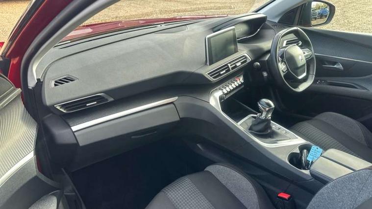 180 degree colour reversing camera, Bluetooth telephone facility, Drive modes select (Eco, normal and sport), Driving Time Warning (DAA1), Emergency services call system, Extended traffic sign recognition, Exterior temperature indicator with ice warning, Lane departure warning system, Lane Keeping Assistance (LKA) with road edge detection, Mirror screen with mirror link, apple carplay and android auto, Multi function trip computer, PEUGEOT i-Cockpit with 8.0" capacitive touchscreen in centre console, Peugeot i-cockpit with compact multi-function sports steering wheel, PEUGEOT i-Cockpit with configurable 12.3" Head-up digital instrument panel, Programmable cruise control and speed limiter, Speed limit recognition and recommendation, Dynamic stability control and electronic anti-skid system, Stop/start function, 6 speakers radio with mp3 compatible, DAB Digital radio, USB socket, Automatic hazard light activation upon heavy brake application, Automatic triggered rear windscreen wiper in reverse gear, Black front wing trim, Black rubber side window trim, Body colour door handles, Body colour rear roof spoiler with stainless steel edging trim, Body colour roof, Body protectors (bottom of front and rear bumpers + wheel arches + protection at bottom of doors) in black, Chrome frameless 'Classic' grille, Chrome rear bumper facia, Diamond Black door mirror shells, Door mirror mounted LED courtesy floor lighting, Eco LED headlights, Electric folding door mirrors with exterior courtesy LED lighting, Electric operated/heated door mirrors, Front and rear door sill protectors, Front bumper lower trim in Silver, Front windscreen wiper with magic wash cleaning system, Gloss black B and C pillar and aerodynamic deflector trim, Gloss black front bumper air scoops, Gloss black rear cluster connecting strip, Gloss black windscreen trim, Headlights left on audible warning, Heated rear windscreen with integrated antenna, LED daytime running lights, LED front indicator, LED rear number plate lighting, LED side indicator lights integrated into door mirrors, LED third brake light, One touch electric front/rear windows with pinch protection, Rear LED Peugeot signature 'Claw Effect' lights, Rear side wing doors, Stainless steel roof arches, Tinted rear side windows + tailgate window, 12V Sockets in dashboard, rear cabin and load area, 2 cupholders in front centre console, 2 x Rear reading spotlights, 2x Rear coat hooks, 3 seat rear bench, 3x Isofix child seat fittings in the front passenger and outer rear seats, 4 Grab handles retractable and damped, Blue ambient lighting for connecting zone, Blue ambient lighting to headup instrument panel, Brumeo fabric trimmed door armrests, Centre front armrest with butterfly wing opening and illuminated storage compartment, Driver seat manual adjustment (longitudinal and back rest angle), Dual zone automatic climate control, Electric power steering with reach and rake adjustable steering column, Flocked glovebox interior, Front interior light with 2 reading spotlights and rear interior light with timer, Front passenger seat manual adjustment (longitudinal and back rest angle), Front seat back map pockets, Gear shift indicator, Height adjustable front seats, Illuminated glovebox, Interior lighting in storage spaces and load area, Leather steering wheel with detail stitch, Meco cloth upholstery, Rear centre console ventilation system, Roof lining - Salin light grey, Satin chrome dashboard trim, Satin chrome digital instrument panel and touchscreen trim, Satin chrome interior door handles, Satin chrome scorpion's tail and toggle switch trim, Seatbelt not fastened audible and visual alert for front seats, Seatbelt unfastened on the move audible and visual alert for front and rear seats, Single front passenger seat, Two position boot floor, Safety pack with emergency braking system - 3008, Visibility pack - 3008, 3x Rear three-point retractable seatbelts with force limiters in the outer rear seats, ABS (Anti-lock Braking System) with EBD (Electronic Brakeforce Distribution) and EBA (Emergency Braking Assistance), Adaptive driver and front passenger airbags with passenger airbag deactivation function, Driver and front passenger side airbags, Electric child locking functionality on rear windows and doors, Electric parking brake, Front and rear curtain airbags, Front optimised safety headrests and 3 x rear retractable headrests with height adjustable, Front three point retractable seatbelts with pre tensioners and force limiters, Front ventilated disc brakes and rear disc brakes, Hill start assist, Single tone horn, Automatic door locking when moving off, Electronic immobiliser, key operated exterior door lock from the left hand door, Keyless Start, Perimetric and volumetric alarm with lift and tilt sensor, Remote control central locking with two plip keys, Carbon effect Dashboard, front and rear door panel finish, 17" Chicago alloy wheels, Puncture repair kit including compressor, sealant cartridge and towing eye,
