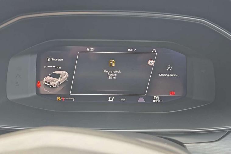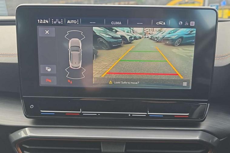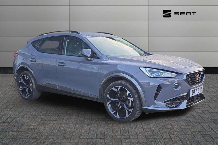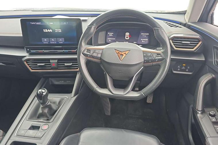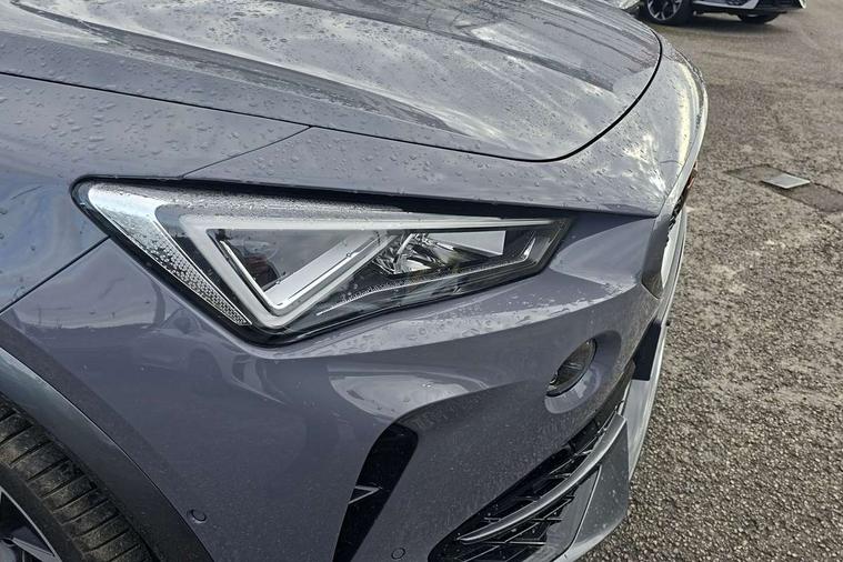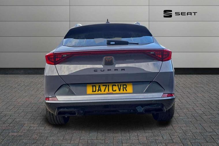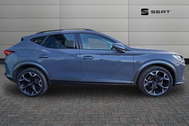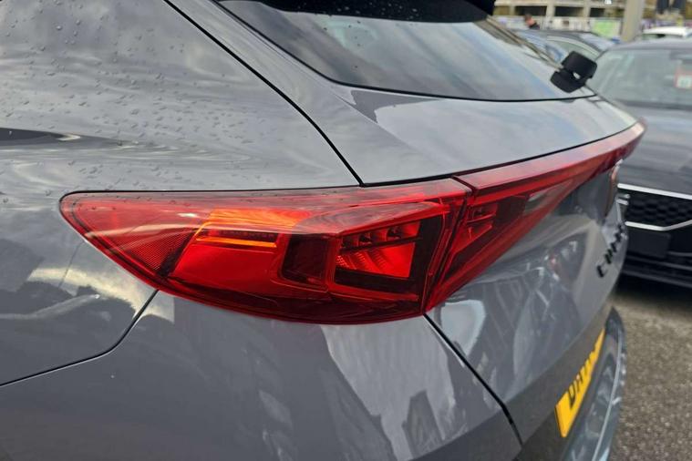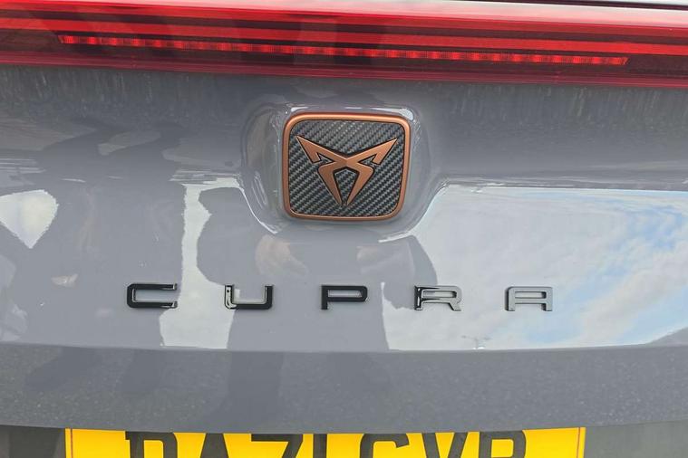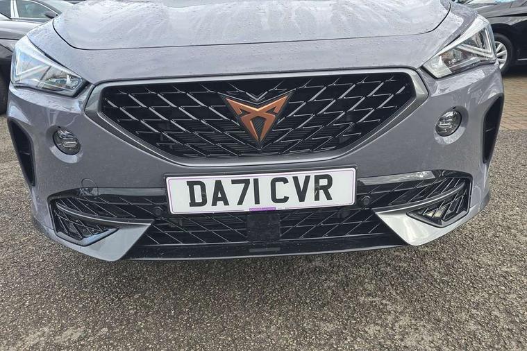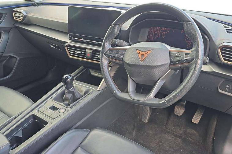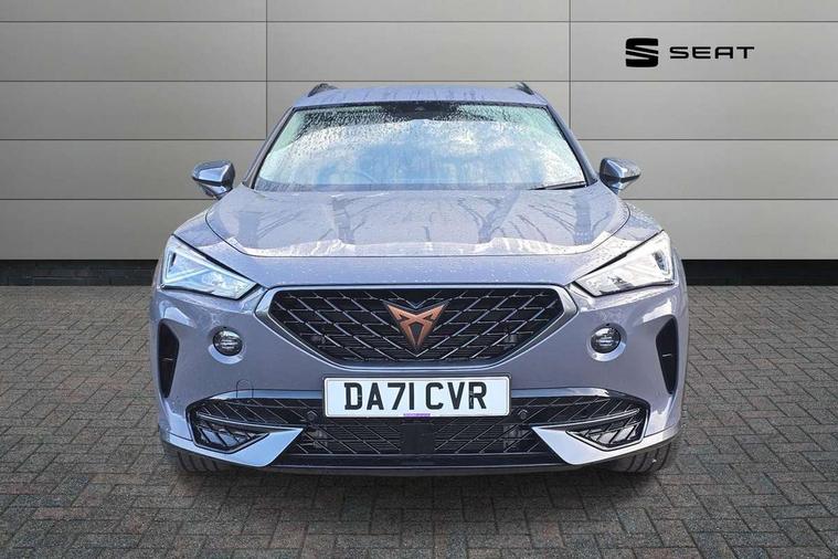 Digital cockpit and configurable dashboard, Driver alert system, Driving profile selection, E-call, Forward collision warning with automatic braking, Lane assist, Park assist (inc front/rear parking sensors), PAS, Predictive adaptive cruise control with speed limiter, Rear view camera, RPM, trip computer, outside temp gauge, instrument light brightness, low fuel warning light, lights on reminder, gearshift indicator, Service interval indicator, Start/stop system with regenerative braking, Wireless apple carplay, Wireless phone charger, Electronic locking differential and dynamic traction support, Standard suspension, 2 front and 2 rear USB type C sockets, Auxiliary input socket, DAB radio, Auto dimming rear view mirror, Body colour door handles, Body coloured bumpers, Dark grey wing mirror, Daytime running light with automatic headlight control and coming home feature, Dynamic headlight range control, Electric front/rear windows, Electrically adjustable heated and folding door mirrors with memory function, Front fog lamps with cornering function, Gloss black roof rails and window surrounds, LED Headlights, LED Taillights with dynamic indicator, Rain sensing wipers, Rear diffuser with black simulated exhaust pipes, Rear side wing doors, Rear wash/wipe, Third brake light, Tinted rear windows, Welcome lights, 12v power supply in centre console, 12V socket, 12v socket in loadspace, 2 front and 2 rear reading lights, 230V socket, 3 seat bench in 2nd row, 60/40 split rear bench seat with armrest and mechanical seat release, Dust/pollen filter, Front and rear head restraints, Front centre armrest, Height/reach adjust steering wheel, Illuminated interior front door sills, Illuminated sunvisor with mirror, Isofix, Leather multi function steering wheel, Luggage tie-down hooks, Single front passenger seat, Three zone climate control with control panel in rear, Variable luggage/load compartment floor, Wraparound lighting, Genuine Nappa leather Pack - Cupra, Navigation system pack with 10" navigation system - Formentor, Safety and driving pack (M) - Formentor, 3 point seatbelts on all rear seats, ABS, Brake control system - ESC and brake booster, Child proof door locks, Driver and front passenger airbags with front passenger airbag de-activation, Electronic parking brake, Front and rear disc brakes, Front side curtain airbags, Hill hold control, Seat belt reminder for front and rear seats, Tyre pressure monitoring system, Anti theft alarm system, Keyless entry and start system (KESSY), Locking wheel bolts, Copper and aluminium interior detailing, 19" 'Exclusive' machined sport matte black and silver alloy wheels,