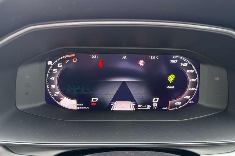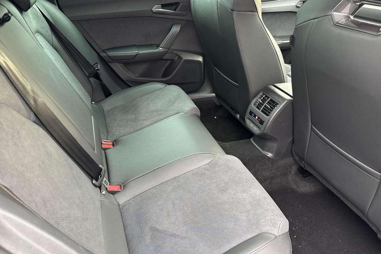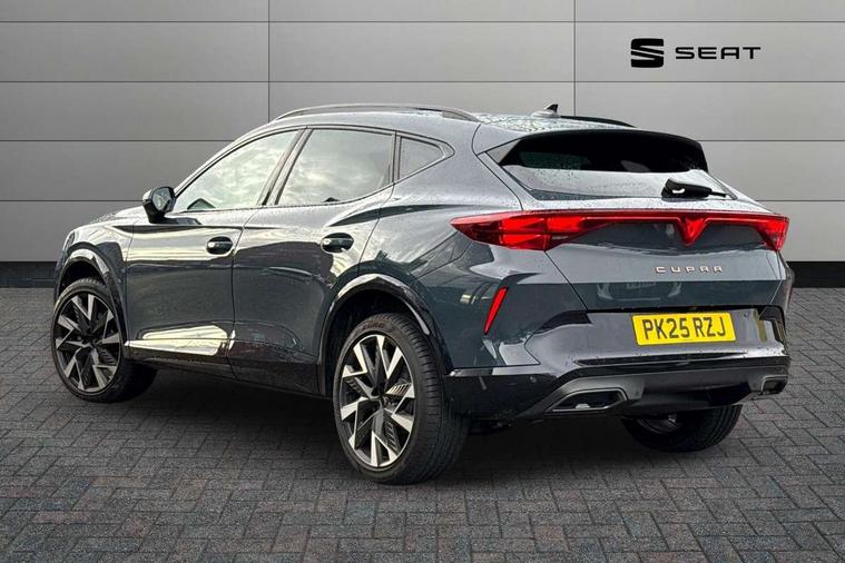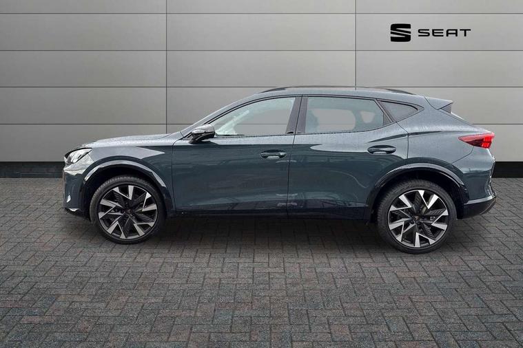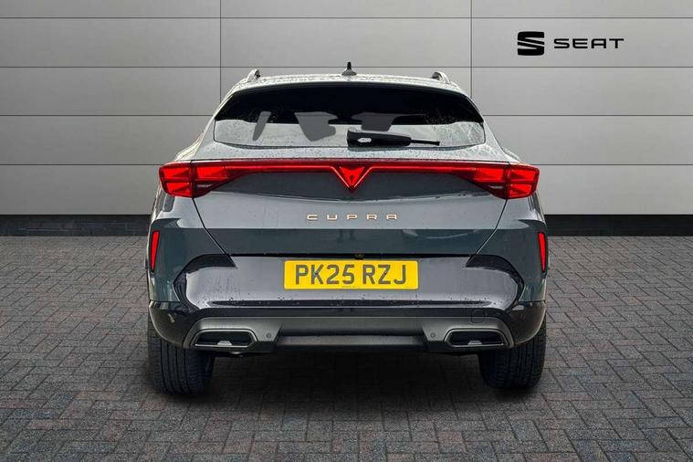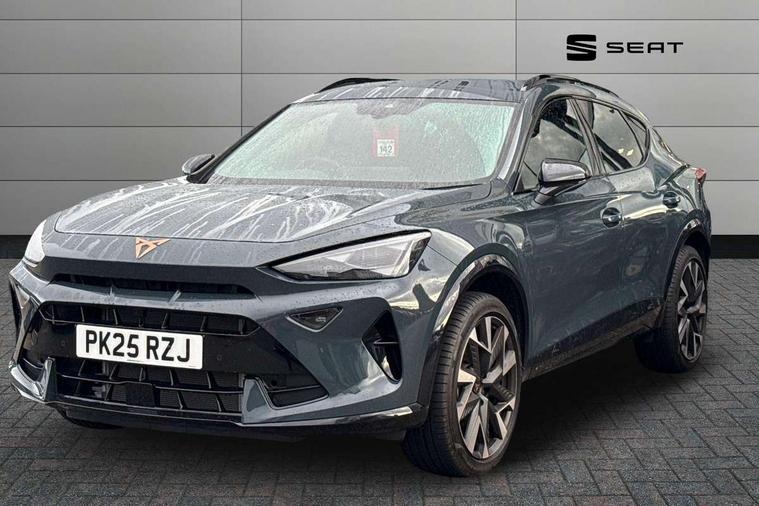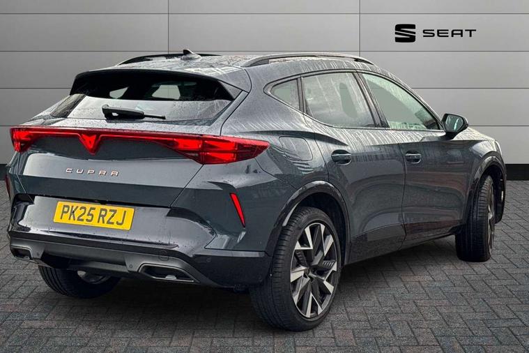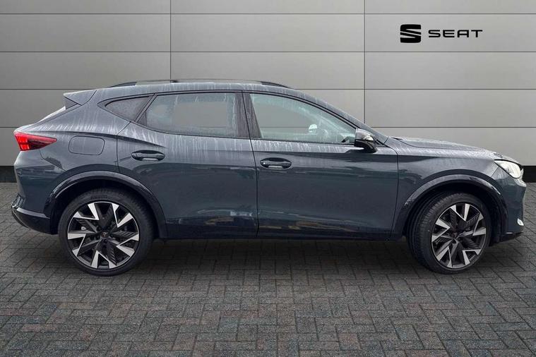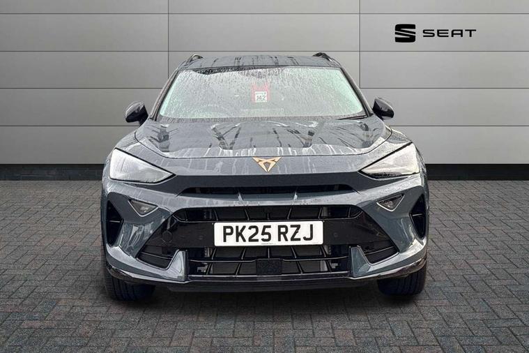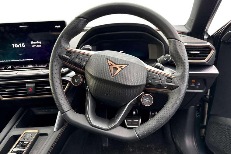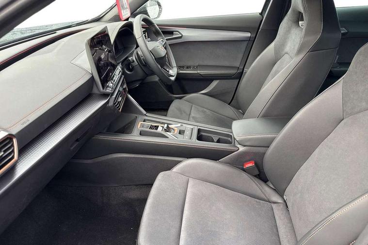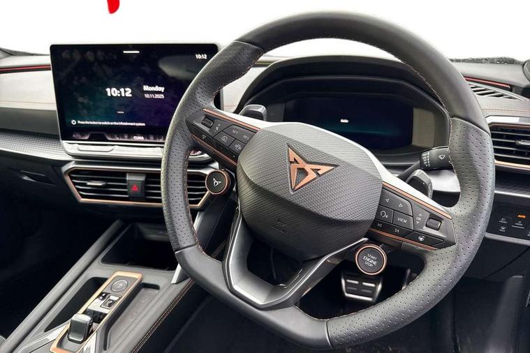 10.25" digital cockpit and configurable dashboard, Adaptive cruise control with follow-to-stop and speed limiter, Advanced driver alert system, Driving profile selection, Dynamic road sign display, Emergency steering support with turn assist, Forward collision warning with automatic braking, Front and rear parking sensors, Full link phone integration, Lane assist, Progressive steering, Rear view camera, RPM, trip computer, outside temp gauge, instrument light brightness, low fuel warning light, lights on reminder, gearshift indicator, Service interval indicator, Start/stop system with regenerative braking, Virtual pedal and electric tailgate, Voice control system, Wired Android Auto, Wireless apple carplay, Wireless phone charger, CUPRA sport suspension, Electronic locking differential and dynamic traction support, 2 front and 2 rear USB type C sockets, Media system with navigation, 12.9" touchscreen display, voice control, DAB, steering wheel mounted controls, Auto dimming rear view mirror, Body colour door handles, Body coloured bumpers, Dark grey wing mirror, Daytime running light with automatic headlight control and coming home feature, Door panel ambient lighting, Dynamic headlight range control, Electric front/rear windows, Electrically adjustable heated and folding door mirrors with memory function, Gloss black roof rails and window surrounds, High beam assist, LED 3rd brake light, LED front fog lamps with cornering function, LED Headlights, LED Taillights with dynamic indicator, Rain sensing wipers, Rear diffuser with black simulated exhaust pipes, Rear fog lights, Rear side wing doors, Rear wash/wipe, Tinted rear windows, Welcome lights (within exterior mirror housing), 12V socket, 2 front and 2 rear reading lights, 3 seat bench in 2nd row, 60/40 split rear bench seat with armrest and mechanical seat release, Black headlining, Black interior roof lining, Cupra sports pedals, Dust/pollen filter, Electrically adjustable front seats with lumbar support and memory function, Front and rear head restraints, Front centre armrest, Heated front seats, Heated supersports multifunction leather steering wheel with satellite buttons and gear shift paddles, Height/reach adjust steering wheel, Illuminated aluminium doorsteps, Illuminated interior front door sills, Illuminated sunvisor with mirror, Isofix, Leather dashboard, door insert and side trim panel, LED smart wraparound lighting, PVC/Dinamica microfiber upholstery + bucket seats, Satellite steering wheel, Single front passenger seat, Storage pockets on rear of front seats, Three zone climate control with control panel in rear, Variable luggage/load compartment floor, 3 point seatbelts on all rear seats, ABS, Brake control system - ESC and brake booster, Child proof door locks, Driver and front passenger airbags with front passenger airbag de-activation, Electronic parking brake, Front and rear disc brakes, Front side curtain airbags, Hill hold control, Public e-call, Seat belt reminder for front and rear seats, Tyre pressure monitoring system, Anti theft alarm system, KESSY Advanced - Keyless start, keyless entry with SAFELOCK, Locking wheel bolts, Copper and aluminium interior detailing, 19" Sandstorm machined sport black and silver alloy wheels,