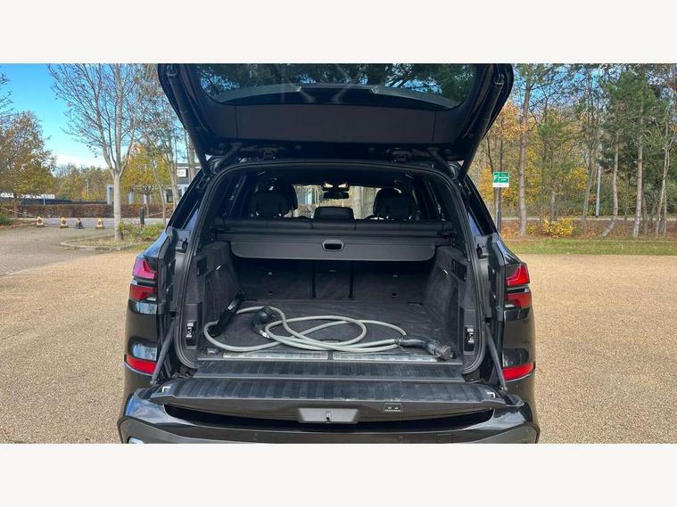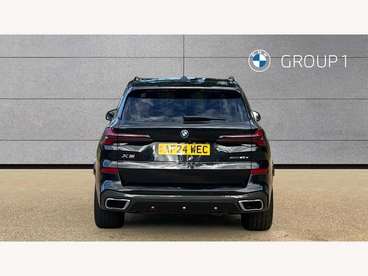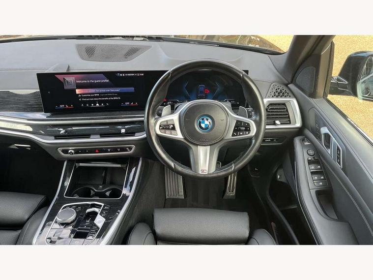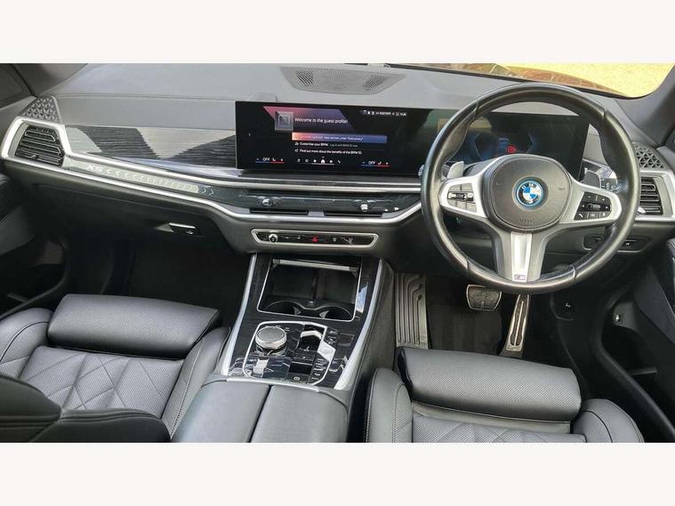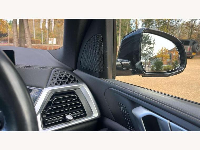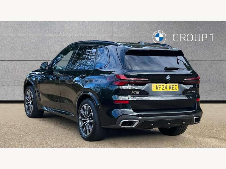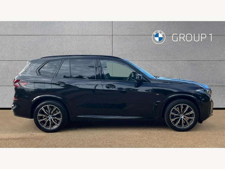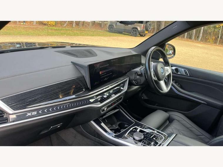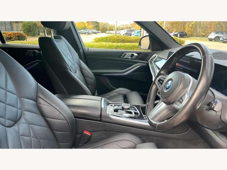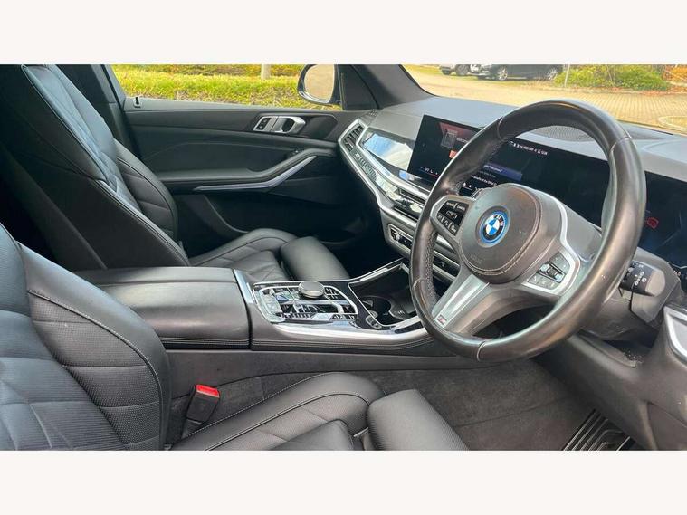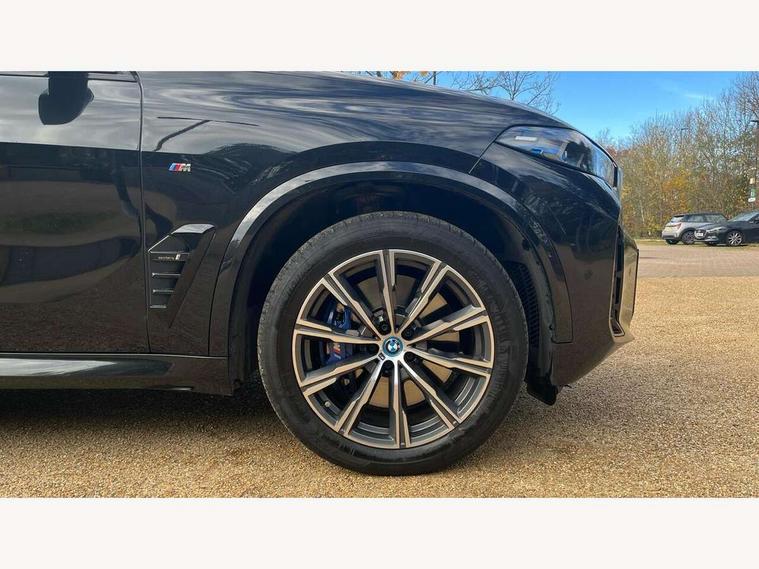 Attentiveness assist, Automatic tailgate operation, BMW ConnectedDrive online services, BMW live cockpit + with curved 12.3 instrument cluster/14.9 central display, nav/Tuner with diversity reception, RDS/4GLTE/remote software upgrade, BMW Teleservices, Condition based service, Cruise control with brake assist, eCall emergency call system, Enhanced bluetooth with wireless charging, Integrated owner's handbook, PAS, Speed limiter, Wi-Fi hotspot, Adaptive 2-axle Front and rear air suspension, Drive performance control with ECO PRO comfort + sport mode, Eight speed steptronic sport automatic transmission and gearshift paddles on the steering wheel, Hi-Fi loudspeaker system, Personal eSim, Adaptive LED Headlights, Front and rear electric windows, High beam assistant, High gloss black shadow line roof rails, LED daytime running lights, Rain sensor, Rear side wing doors, Third brake light in rear spoiler, Variable intermittent rear wash/wipe, 12V - Power sockets with 2x centre console and 1x luggage compartment, 3 seat bench in 2nd row, Foldable rear centre armrest with 2 cupholders and storage compartment, Front and rear side armrest integrated into door trim, Headrests for all seats, Luggage compartment separating net, Single front passenger seat, Three spoke sport M leather steering wheel, Velour floormats, Ambient light interior pack - X5, Driving assistant pack with radar based driver assistance system - X5, Expanded exterior mirror pack - X5/X5 M, M aerodynamics pack - X5, 3 rear seatbelts, Acoustic protection for pedestrians, Active protection, Airbags - driver/front passenger, rear and side, first and second row seats head airbags, front passenger seat airbag deactivation + knee airbag, Anti-lock braking system (ABS), Automatic Stability Control (ASC), Brake energy regeneration, Cornering brake control (CBC), Crash sensor activating central locking release, hazard warning lights, fuel cut off, interior lighting + activation of safety battery terminal clamp, DSC - Dynamic Stability Control, Dynamic Traction Control - DTC, Electromechanical parking brake with automatic drive away release and auto hold function, Electronic brake force distribution, Hill start assistant, M Sport blue painted brake calipers with 'M' designation, Mechanical child proof lock on rear doors, Tyre pressure monitoring system, Tyre pressure sensors, Ventilated front and rear disc brakes, Warning triangle and first aid kit, Alarm system, Closing system with central locking, Comfort access system, Locking wheel bolts,