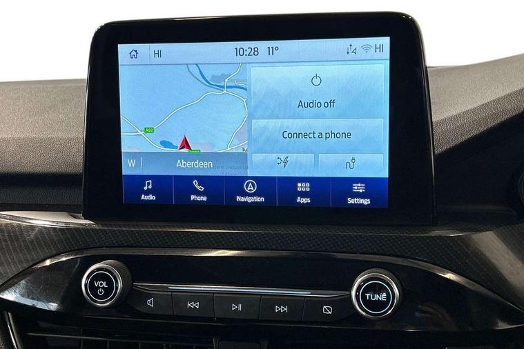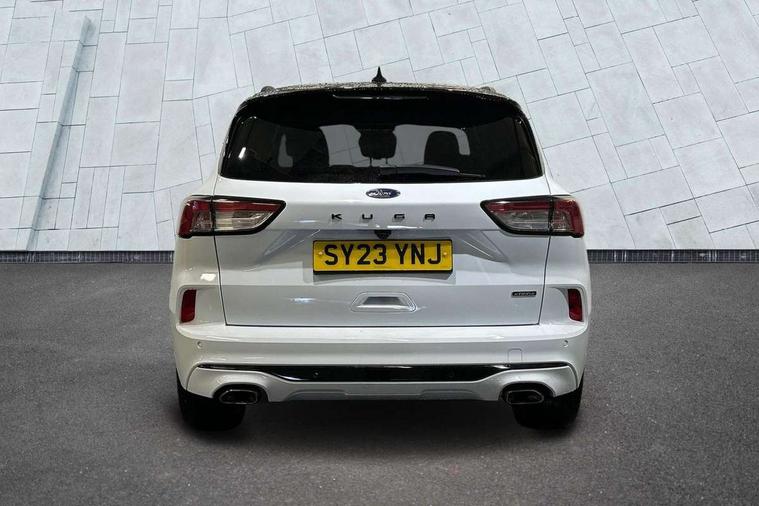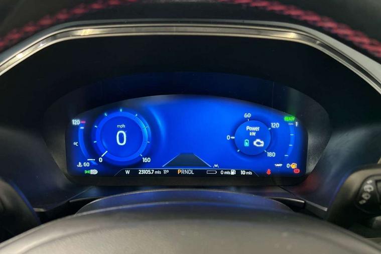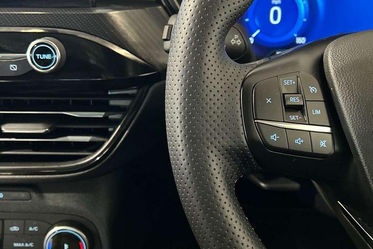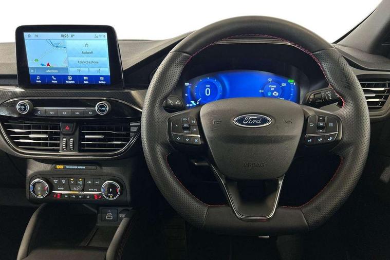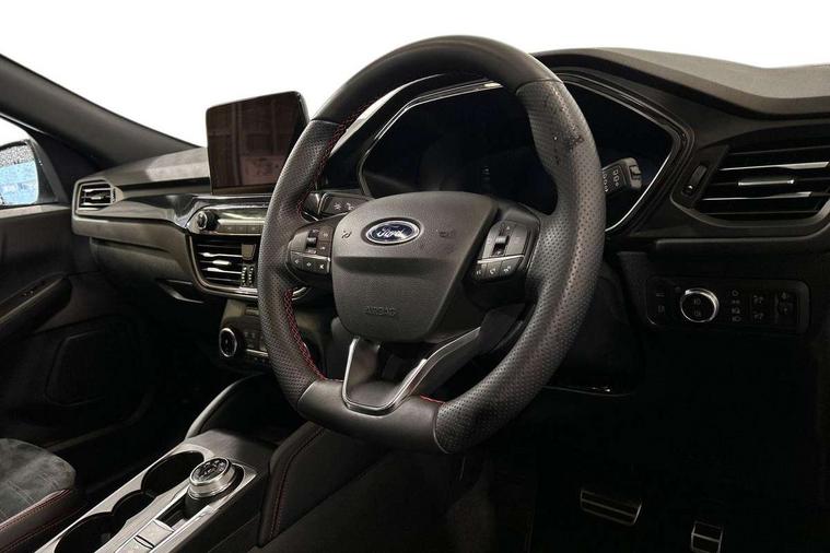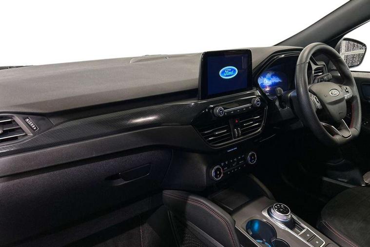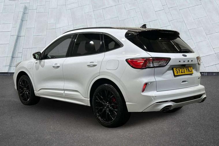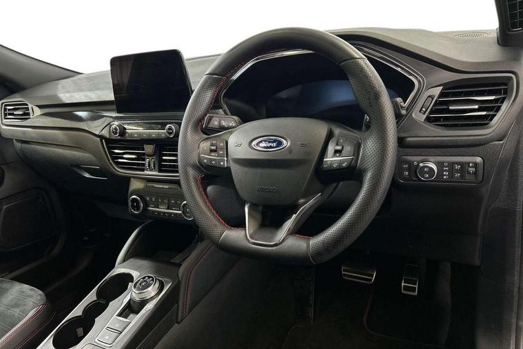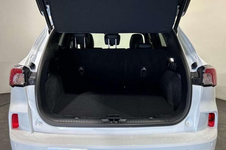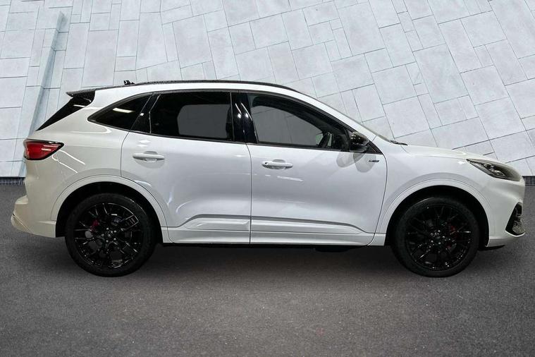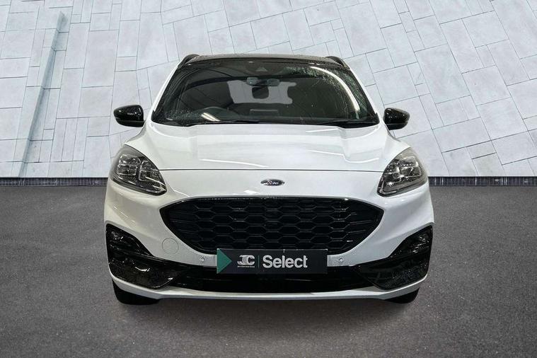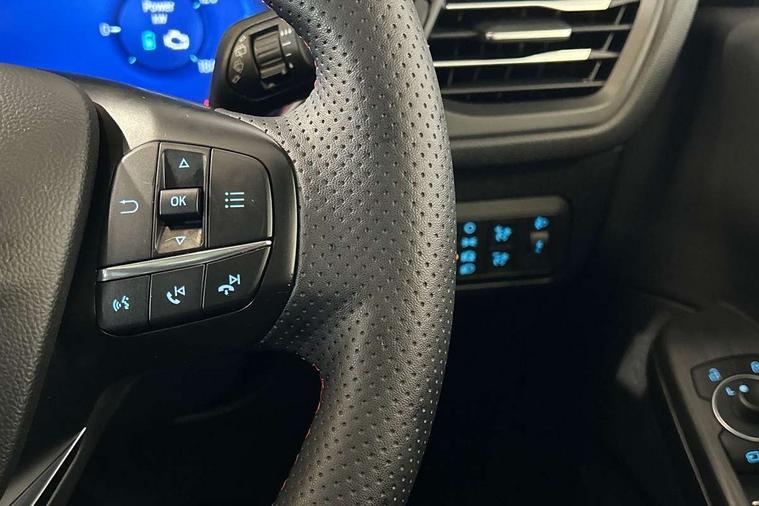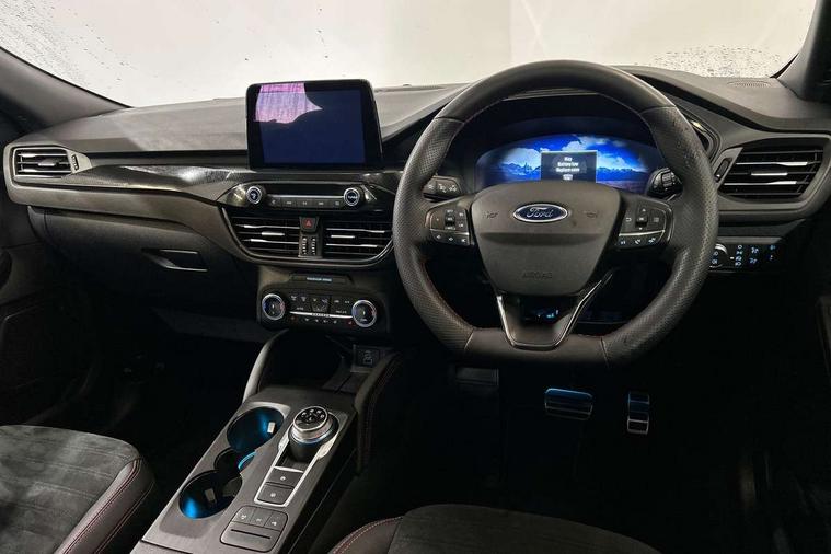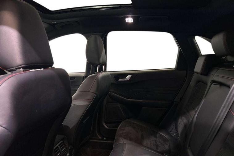Driver impairment monitor, Ford easy fuel, Ford SYNC 3 with 8" colour touchscreen, App Link, andriod auto/apple carPlay and navigation with Ford pass connect, Front and rear parking sensors, Hands free power tailgate, Intelligent speed assist, Lane keeping aid with lane departure warning, Mobile phone wireless charging pad, Power assist steering, Selectable drive modes, 3-Pin Home charge cable (230V/16A Domestic socket), Sports suspension, Ford DAB audio system with 6 speakers, Auto dimming rear view mirror, Auto headlamps with high and low beam, Auto wipers, Black roof rails, Front LED fog lights with cornering function, Full LED headlamps, Large rear spoiler, LED daytime running lights, LED rear lights, Power folding heated door mirrors with puddle lights, Power front/rear windows with global close, Power opening panoramic roof, Privacy glass, Quickclear heated windscreen, ST Line body styling kit with unique front and rear fascia and bumper, rear painted diffuser, front painted skid plates, dark mesh upper grille, ST Line front scuff plates, Twin exhausts, 10 way power adjustable drivers seat, 2nd row sliding seats, 8 way manual passenger seat including lumbar support and height adjust, Alloy pedals, Ambient lighting, Centre console with electronic parking brake, Dark headlining and pillars, Dual electronic automatic temperature control, Flat bottomed leather steering wheel in sensico with red stitching, Front and rear head restraints, Heated passenger and driver seats, Rear charging point, Sensico partial premium leather upholstery, Sports seats, ST Line front and rear floor mats, B&O with large instrument cluster pack - Kuga, 3x3 point rear seatbelts, Airbags - front driver/passenger, front and rear curtain, Drivers knee airbag, Electronic stability control (ESC) and ABS, Ford MyKey Gen 2 safety system, Post collision braking, Powered child proof rear door locks, Pre collision assist with autonomous emergency braking, Red brake calipers, Tyre pressure monitoring system, Engine immobiliser, Keyless entry, Keyless start with 'Ford Power' starter button, Locking wheel nuts, Remote powered central double locking doors, Thatcham category 1 alarm,
