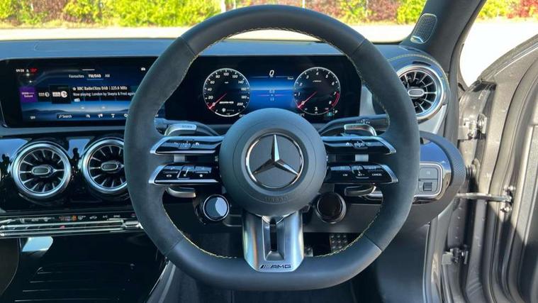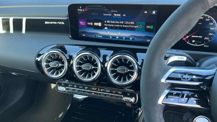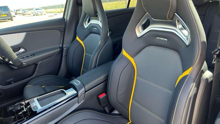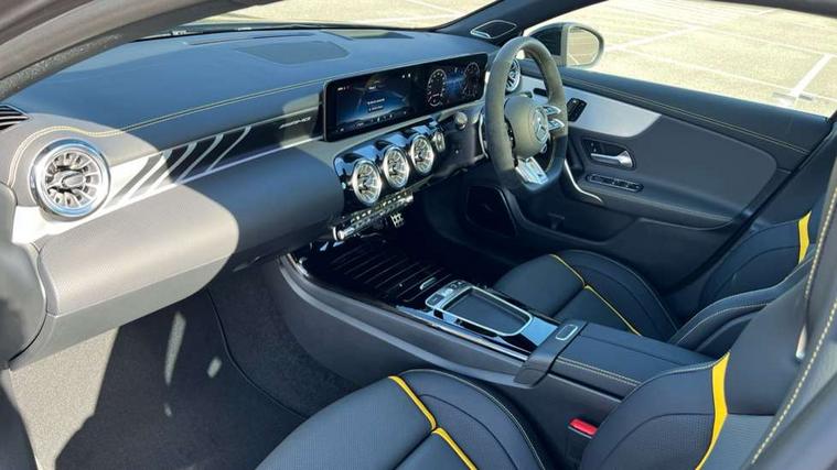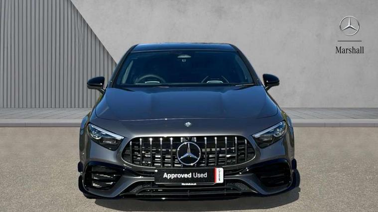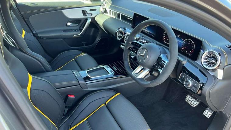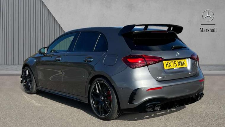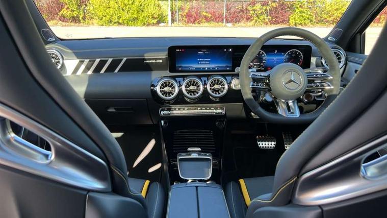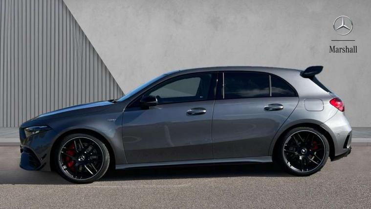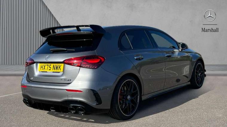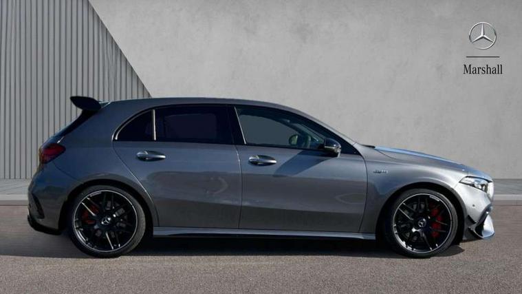 10.25 inch touchscreen central media display with AMG specific, AMG start up logo, visualisation of the AMG drive programs, vehicle and engine data, 10.25" Digital instrument cluster display screen, AMG DYNAMIC SELECT with drive modes(Slippery, Comfort, Sport, Sport+, Individual and Race) incl drift mode via steering wheel shift paddles+Race Start, AMG menu with sporty additional information - Gear indicator with yellow M symbol manual mode, Warm Up menu and Set Up menu, AMG speed sensitive steering with two sets of steering characteristics, Attention assist, Brake pad wear indicator warning light, Car wash mode, Direct steering, Dual bluetooth interfaces, ECO start/stop function, Engine start/stop button, Fluid level warning indicator for fuel, oil, coolant and washer fluid, Fluorescent jacket for driver, Hard-disk navigation, Head up Display, Hey Mercedes Voice activation, Lamp failure indicator, MBUX augmented reality for navigation, Mercedes me connect including emergency call system, accident recovery, breakdown and maintenance management, Mercedes me remote services, Outside temperature gauge, Owners manual in English, Pre-installation of private car share, Remote boot closing, Service indicator (ASSYST), Smartphone integration with Apple CarPlay and Android auto, Tailgate, Traffic sign assist, Trip computer in multifunction display with current consumption indicator, Wireless charging, AMG performance 4MATIC+ with torque control, AMG suspension including AMG specific axles and sporty spring/damper setup, Suspension with adaptive damping system, Burmester surround sound system (590W) with Dolby atmos, speakers - 1 center+4 doors+2 in C pillars, tweeter, subwoofer, DSP amp, burmester lettering, DAB Digital radio, MBUX multimedia system, 4 Electric Front and Rear windows, Adaptive brake lights, AMG A45 S bodystyling -rear apron, four vertical fins, side sill panels, roof spoiler lip, specific front apron, diffuser look and S label on boot lid, AMG real performance exhaust sound system, AMG specific radiator grille in high gloss chrome with AMG lettering, Beltline strips in High gloss Black, Body colour bumpers, Body colour door handles with chrome inserts, Body colour side skirt, Electric adjustable and heated door mirrors with integrated LED side indicators, Headlamp assist automatic headlamp activation, Heated glass rear windscreen + timer control, LED daytime running lights, LED High level third brake light, LED tail lamp, Multibeam LED headlamps with adaptive highbeam assist and cornering function, Panoramic sliding sunroof, Privacy glass, Radio aerial, Rain sensing windscreen wipers with two sensitivity settings, Rear fog lights, Rear side wing doors, Rear windscreen wiper, Surround lighting with logo projection, Two round twin tailpipe trim elements each measuring 90 mm in diameter and AMG lettering plus ribbing on the inside of the pipe, Valve control dependent on drive program, Wider wheel arches for AMG wheels, Window line trim strip in black, 3 seat bench in 2nd row, 3 Spoke flattened lower section sporty design AMG Performance steering wheel in nappa leather/microcut microfibre, 40:20:40 split folding rear seats, Air conditioning - Two zone thermotronic luxury automatic climate control with display, AMG brushed stainless steel sports pedals with rubber studs, AMG centre console finished with trim in silver chrome, AMG floor mats, AMG performance seats, AMG sporty centre console with raised front section and integral control switched for manual transmission mode, AMG steering wheel buttons, Automatic child seat recognition sensor, Black air vents with surround in silver chrome, Black roof lining, Electrically adjustable front memory seats including lumbar support and backrest inclination, Front centre armrest with stowage, Front seat head restraints, Height/reach adjustable steering column, Illuminated AMG front door sills with changeable cover, Interior lighting - 64 colour Ambient lighting, Interior mirror with reading lamps in black and frameless, Rear armrest with 2 cupholders, Rear head restraints, Seat occupancy sensor for front passenger seat, Silver coloured aluminium gear shift paddles on steering wheel, Single front passenger seat, Stowage compartment in centre console with retractable cover, Sunvisors with illuminated vanity mirrors, Twin front cupholders, Aerodynamic pack - A Class, AMG Driver's pack - A Class, AMG night pack - A Class, AMG performance high-end seat pack - A Class, Light and sight package - A Class, Mirror package - A Class, Multi-contour seat pack - A Class, Parking pack with 360 degree camera - A Class, Seat comfort pack - A Class, USB pack plus - A Class, Winter pack - A Class, 3 rear 3 point seatbelts, 3 stage electronic stability programme, ABS with Brake Assist, Active bonnet, Adaptive brake assist with hold function and hill start assist, AMG high performance brake system with red painted brake callipers and black AMG lettering at the front, ventilated and perforated brake discs, Black seatbelts, Bonnet with power domes, Childproof locks manually operated for rear doors and electrically operated for rear power windows, Crash responsive emergency lighting, Driver and passenger head and side airbags, Drivers knee airbag, Dual stage driver/passenger airbags, Electronic parking brake, ESP curve dynamic assist, ESP with ASR, Exit warning, Front and rear seatbelt reminder, ISOFIX and top tether child seat fixing points in two outer rear seats, Tyre pressure monitoring system, Warning triangle and first aid kit, Window airbags, Alarm system/interior protection/immobiliser, Guard 360 degree vehicle protection, Keyless entry lock/unlock, Keyless Go, Remote central locking and crash sensor with emergency opening function, Aluminium AMG design black/silver interior trim, 19" AMG cross spoke forged wheels painted in matt black with high sheen rim flange, Summer tyres, Tirefit sealant kit, Wheel arches with flared AMG wings with TURBO 4MATIC+ letterin
