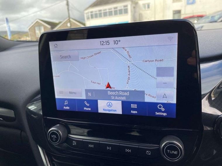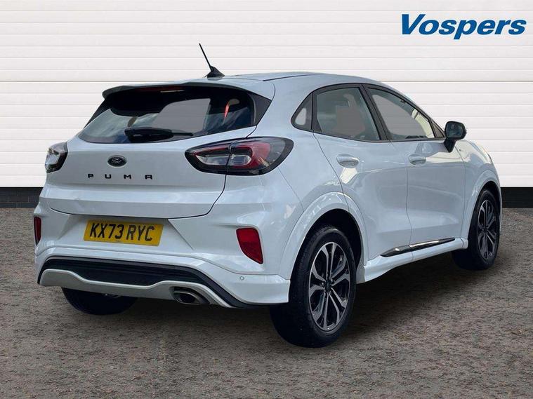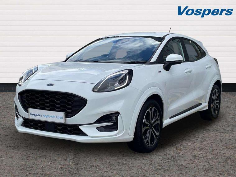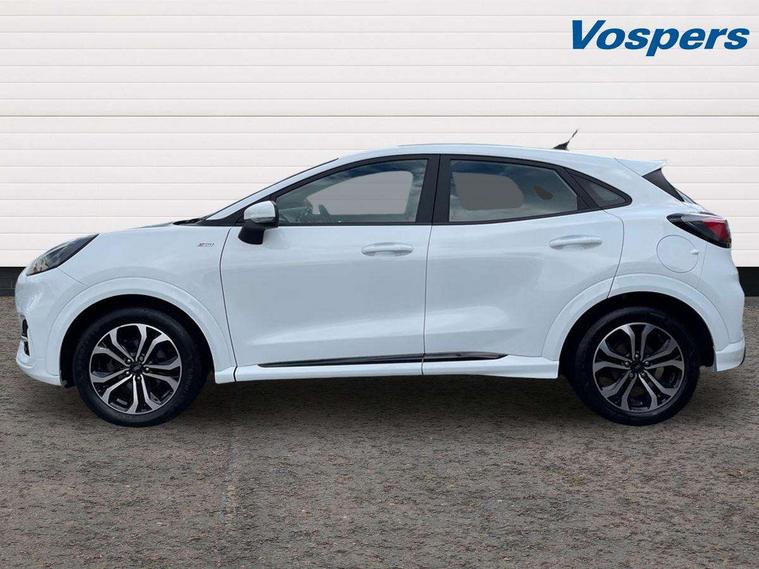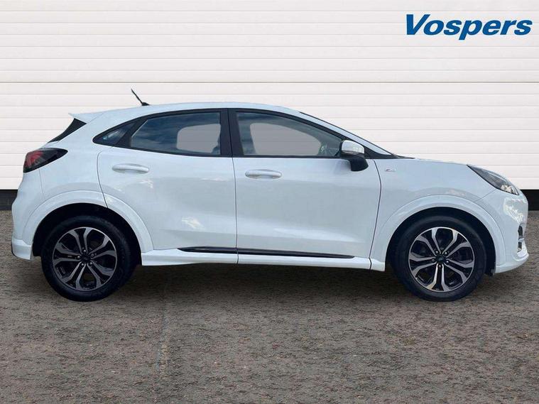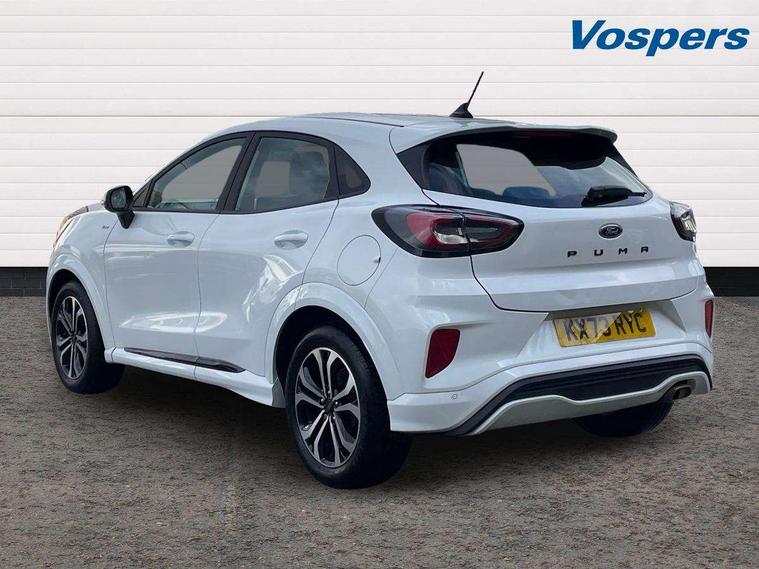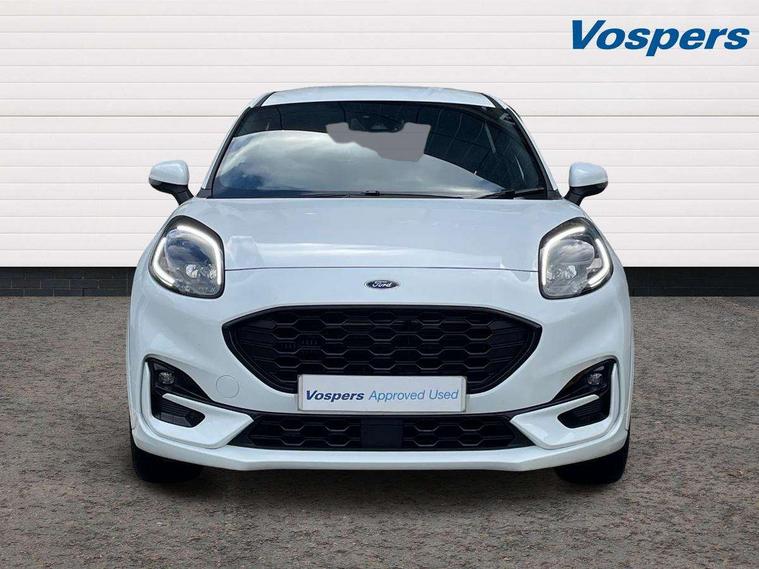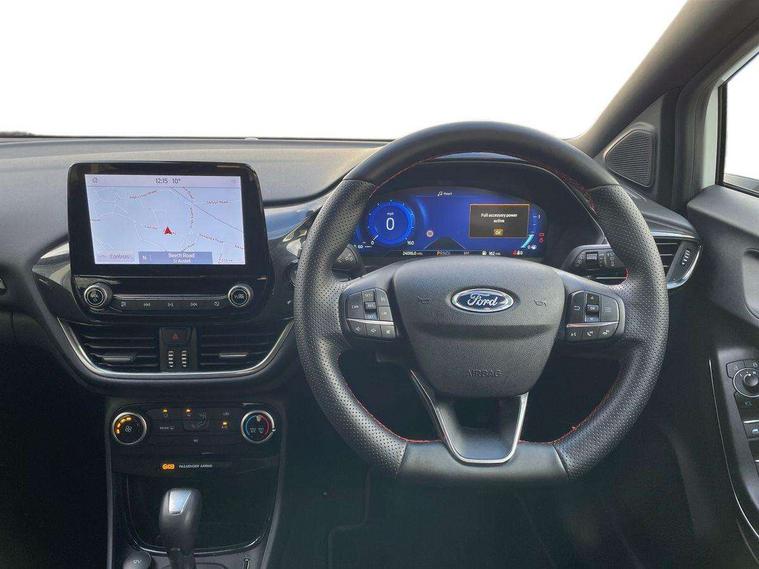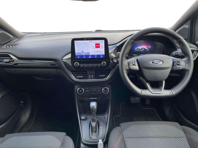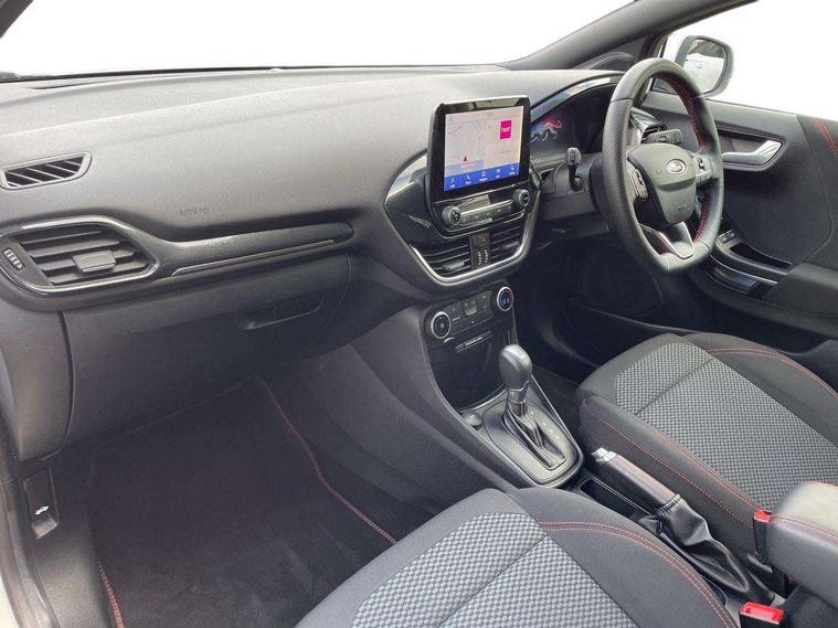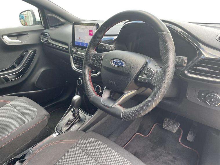 Driver impairment monitor, Emergency call service, Ford easy fuel, Full digital 12.3" instrument cluster, Lane keeping aid with lane departure warning, Power assist steering, Power start button, Rear parking sensor, Selectable drive modes(Normal, sport, Eco, trail, slippery), Speed sign recognition, Sport suspension, Automatic headlights with auto high beam, Automatic rain sensing wipers, LED rear lamps, Power foldable heated door mirrors with puddle lamps, Projector headlamps with LED day time running lights and front fog lamps, Quickclear heated windscreen, Rear side wing doors, Rear wiper, ST-Line body styling kit with unique grille, Third brake light, 3 seat bench in 2nd row, Centre console with armrest and stowage, Ford megabox extended bootspace, Front and rear head restraints, Front floor mats, Manual 2 way passenger seat adjustment, Manual 4 way driver seat adjust with lumbar adjustment, Single front passenger seat, ST- Line cloth trim with red stitching, ST-Line flat bottomed sensico leather steering wheel with leather handbrake and aluminium gear knob, Ford SYNC 3 navigation pack - Puma, 3 rear seatbelts, Child safety lock, Electronic stability control (ESC) and hill start assist, Pedestrian/cyclist detection & post-collision braking, Pre collision assist system, Tyre pressure monitoring system (TPMS), Thatcham alarm,