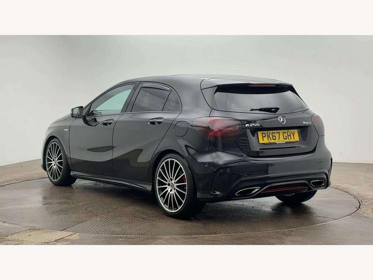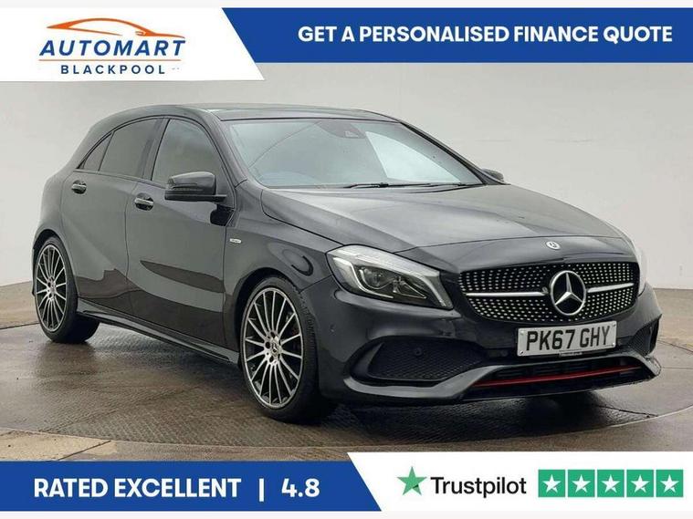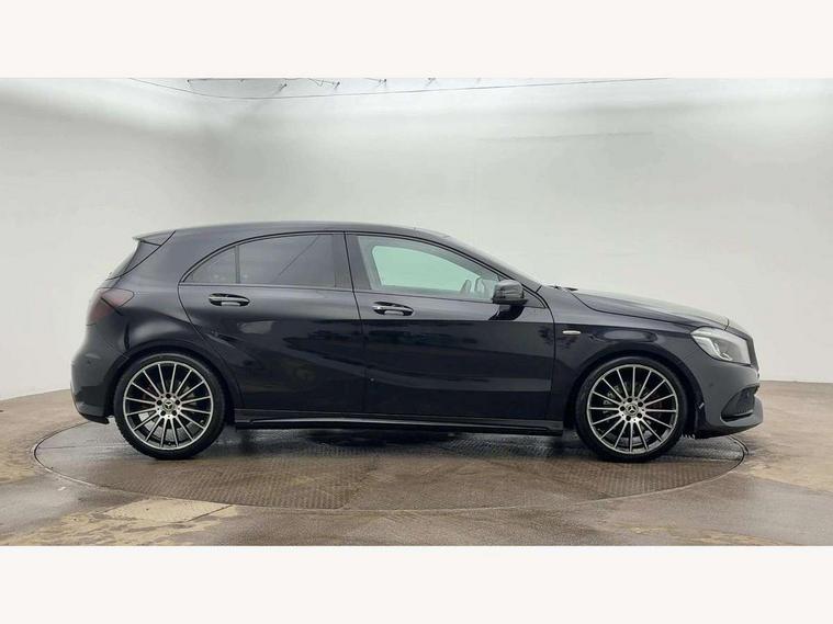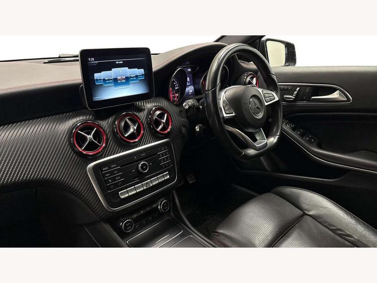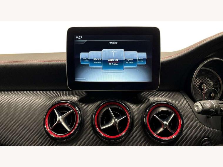 8" colour display screen, AMG speed sensitive sports steering, Attention assist, Bluetooth interface for hands free telephone, Bulb failure indicator, Collision prevention assist plus, DYNAMIC SELECT with a choice of driving modes (ECO, Comfort, Sport, Sport+ and Individual), External temperature gauge, Low fluid warning light, Park assist pilot with front and rear park assist, Reversing camera, Service indicator (ASSYST PLUS), Trip computer, Sports suspension, Harman/Kardon logic 7 surround sound system + 12 speakers, USB port, Adaptive brake lights, AMG body styling, Auto dimming driver's door mirror, Auto dimming rear view mirror, Body colour bumpers/red strips, Body colour door handles, Body colour side skirt, Body coloured door mirrors, Chrome beltline trim, Diamond radiator grille with chrome pins and gloss black louvre + chrome insert, Electric adjustable heated door mirrors, Electric folding door mirrors, Electric front windows, Electric rear windows, Headlamp assist, Heated rear window with timer, Heated windscreen wash system, High beam assist, LED daytime running lights, LED Headlights, LED rear lights, LED tail lights, Panoramic sliding sunroof, Rain sensor windscreen wipers, Rear wiper, Twin Trapezoidal tailpipes, 1/3 to 2/3 split folding rear seats, 12 colour Ambient lighting, 12V socket, 3 Spoke sports multifunction flat bottomed leather steering wheel, AMG performance seats, Auto Mercedes-Benz child seat recognition sensor, Black headlining, Brushed stainless steel sports pedals, Dual zone automatic climate control, Electric front seats with memory function, Footwell lights, Front and rear reading lights, Front centre armrest with storage compartment, Front head restraints, Front sport seats, Gearshift paddles on steering wheel, Heated front seats, Height adjustable front seats, Height/reach adjustable steering column, Illuminated door sills, Illuminated glovebox, Illuminated storage compartment, Isofix rear child seat preparation, Load securing rings in luggage compartment, Luggage compartment cover, Rear head restraints, Storage compartment under load area floor, Sunvisors with illuminated vanity mirrors, Twin front cupholders, Seat comfort pack - A Class, 3 rear 3 point seatbelts, ABS with Brake Assist, Active bonnet, Adaptive brake system, Brake calipers with Mercedes-Benz lettering + perforated brake discs, Child proof door locks, Crash responsive emergency lighting, Drivers knee airbag, Dual stage driver/passenger airbags, Electronic parking brake, ESP with ASR, Front and rear seatbelt reminder, Front head airbags, Front passenger seat occupancy sensor, Front side airbags, Hill start assist, Red painted brake calipers, Tyre pressure monitoring system, Warning triangle and first aid kit, Window airbags, Alarm system/interior protection/immobiliser, Keyless Go access/ignition system, Remote central locking, Black air vent surrounds with red insert, Carbon effect trim, Tirefit sealant with electric air pump,