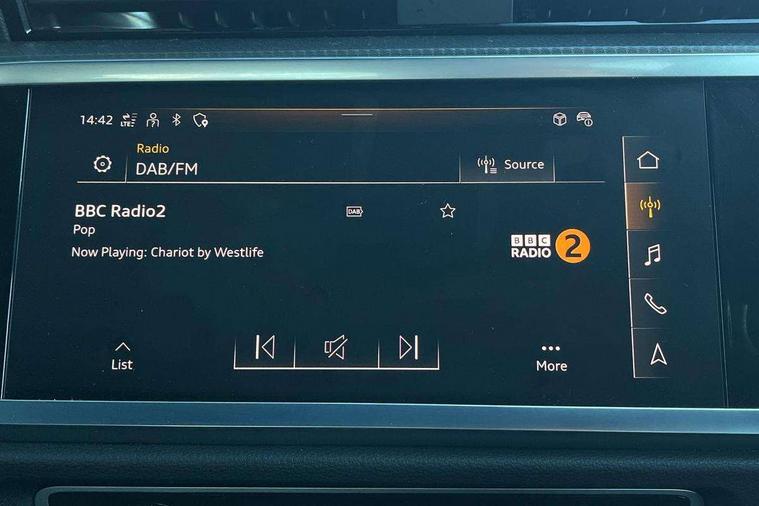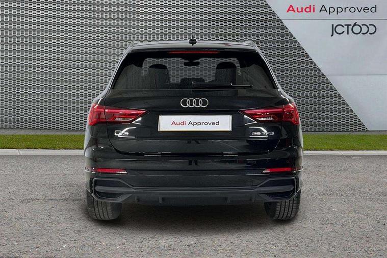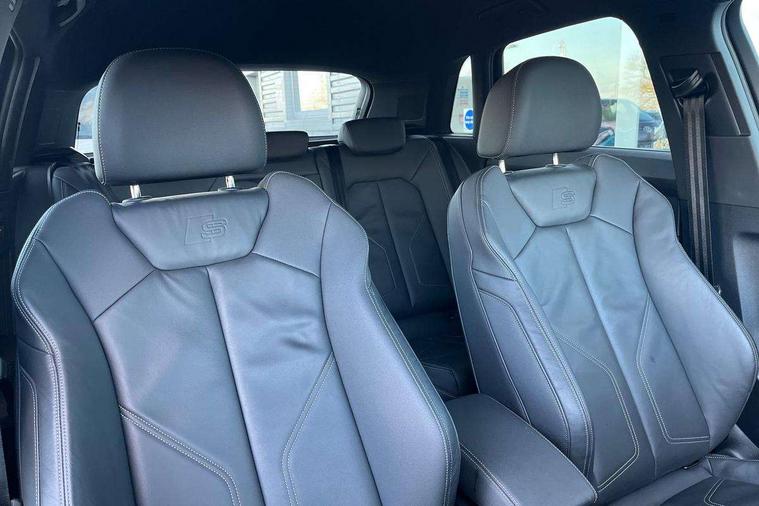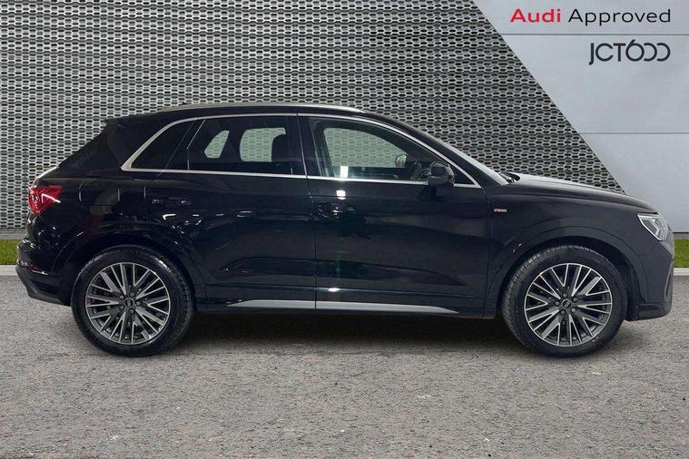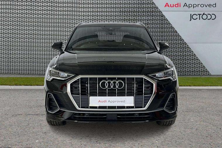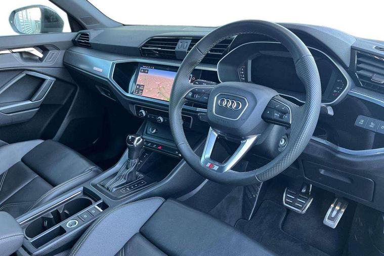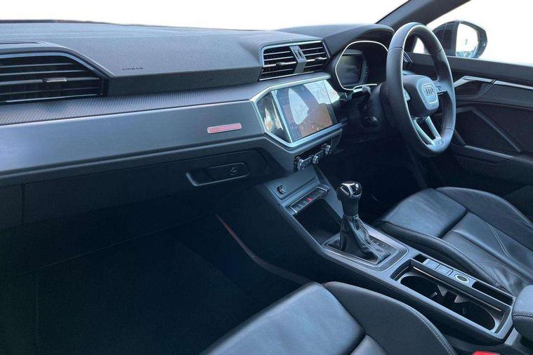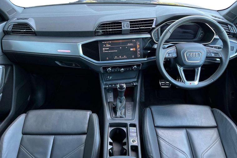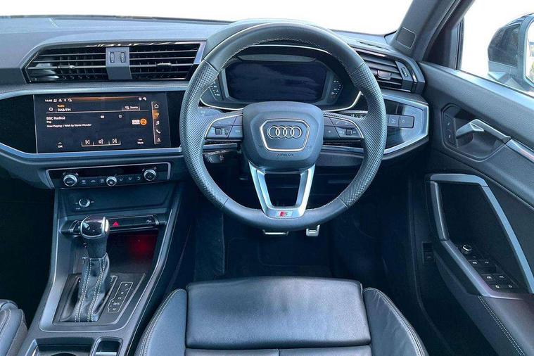 Amazon alexa Integration, Audi connect safety and service, Audi drive select, Audi lane departure warning, Audi Virtual Cockpit - 10.25" display, Bluetooth interface, Camera based traffic sign recognition, Distraction and Fatigue warning, Legal emergency call, MMI Navigation Plus with high resolution 10.1 inch touchscreen colour display, Power operated tailgate, Progressive steering, Service interval indicator, Smartphone interface includes wireless Apple carplay/Android Auto, Start stop system with recuperation, Voice control system with natural language interaction, Sports suspension, 2 USB-C ports with charge and data functions, 6 passive loudspeakers, DAB digital radio module, Acoustic windscreen, Aluminium roof rails, Aluminium window trim, Anthracite black radiator grille, Auto dimming door mirrors, Auto dimming frameless rear view mirror, Body colour front spoiler blade, Electrically folding, adjustable and heated door mirrors with integrated LED side indicators and kerb view function for passenger side, Front and rear electric windows, Front fog lights, Front side air inlets in matt platinum grey, Grille vertical bars in aluminium silver/Matt, High gloss black finish B and C pillars, LED Dynamic rear indicators, LED headlights with LED daytime running lights, LED rear lights, LED third brake light, Privacy glass dark tinted rear and rear-side windows (from B-pillar backwards), Rain and light sensors, Rear diffuser grille in grained matt black, Rear diffuser strip in matt anthracite black, Rear side wing doors, Rear wiper, S line badges on front wings, S line front and rear bumpers and side skirts in contrasting Manhattan grey paint finish, Side skirt insert in matt Platinium grey, Variable front intermittent wipers, 12V socket in rear centre console, 3 seat bench in 2nd row, 3 spoke leather multifunction steering wheel features S badging and grips in perforated leather with contrast stitching, 40:20:40 folding with manual adjustment for 60:40 forwards/backwards position and backrest angle, Adjustable rear seat bench/backrest with centre armrest and cupholder, Black cloth headlining, Dual zone electronic climate control, Electric lumbar support, Front and rear black floor mats with contrast stitching in rock grey, Front and rear headrests, Front centre armrest, Height and reach adjustable steering wheel, Illuminated door sill trims with S logo, ISOFIX child seat mounting for front passenger with airbag deactivation and outer rear seat including top tether attachment point for outer rear seats, Manual front seats with height adjustment, Perforated leather gearknob, Single front passenger seat, Stainless steel luggage compartment sill finisher, Stainless steel pedals, Twin leather upholstery with front sport seats + S embossing, Non smoking pack - Q3, 3x3 point rear seatbelts, 6 airbags - Driver, front passenger, curtain and side windows, Audi pre-sense front with pedestrain and cyclist recognition, Electrically operated child locks on rear doors, Electromechanical parking brake, Electronic stabilisation control including ABS, ASR and EDL, Front seatbelt reminder, Hill descent control, Hill hold assist, Pre sense basic, Seatbelt monitoring, Tyre pressure warning, Warning triangle and first aid kit, Anti theft wheel bolts, Immobiliser, Remote central locking, Thatcham approved category 1 anti theft alarm, Aluminium look interior elements, Dark matt brushed aluminium inlay, Detail dashboard around MMI touch colour display in glass look, black with surround in aluminium look, Leatherette door armrest,