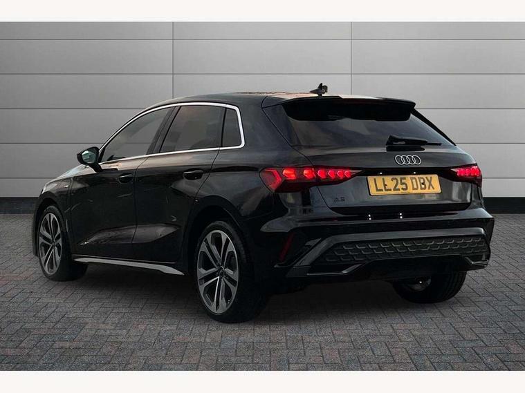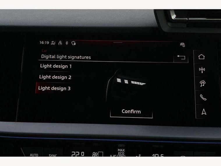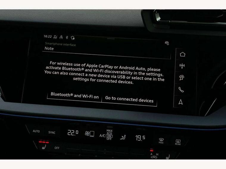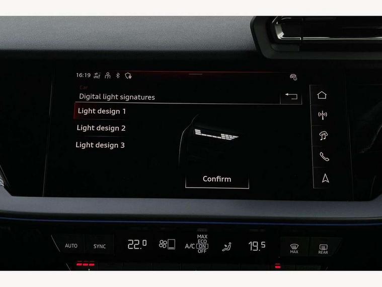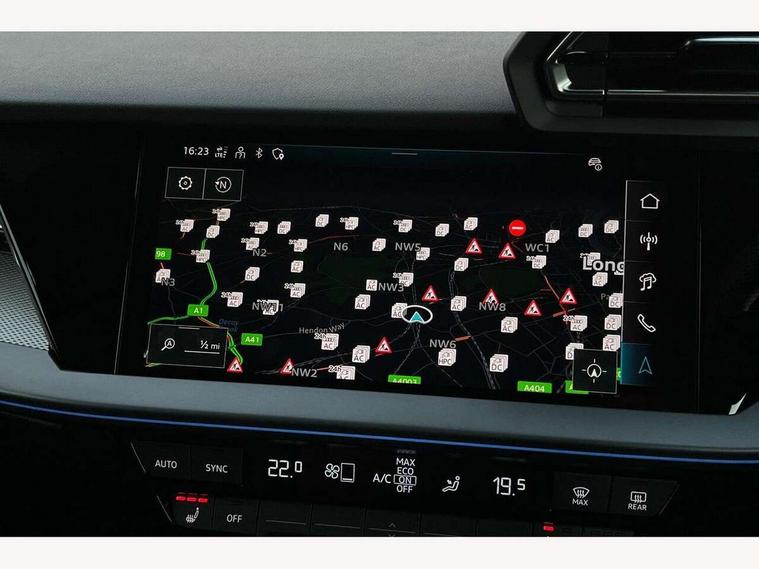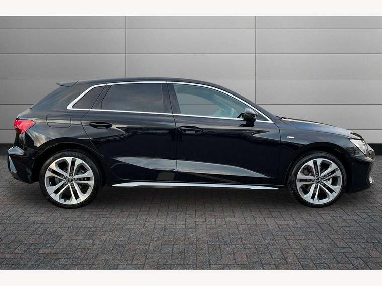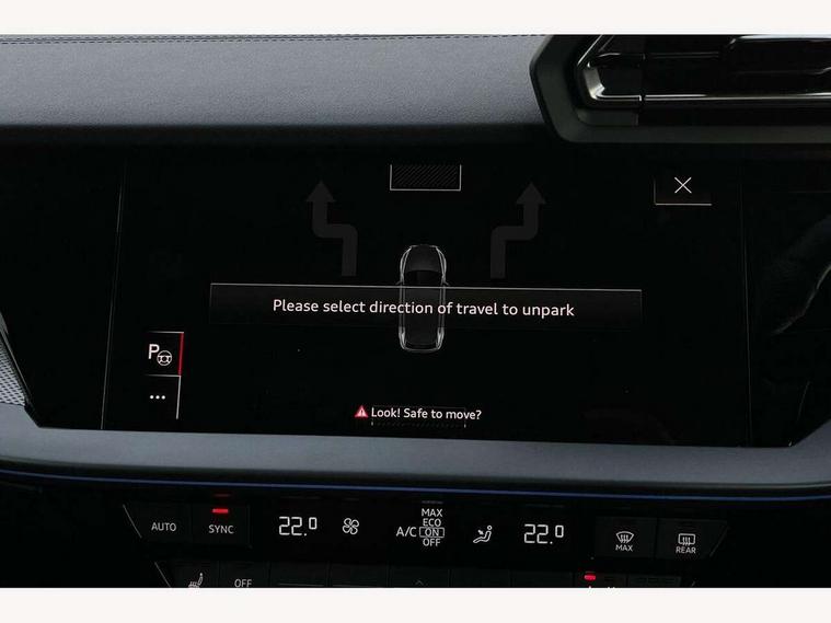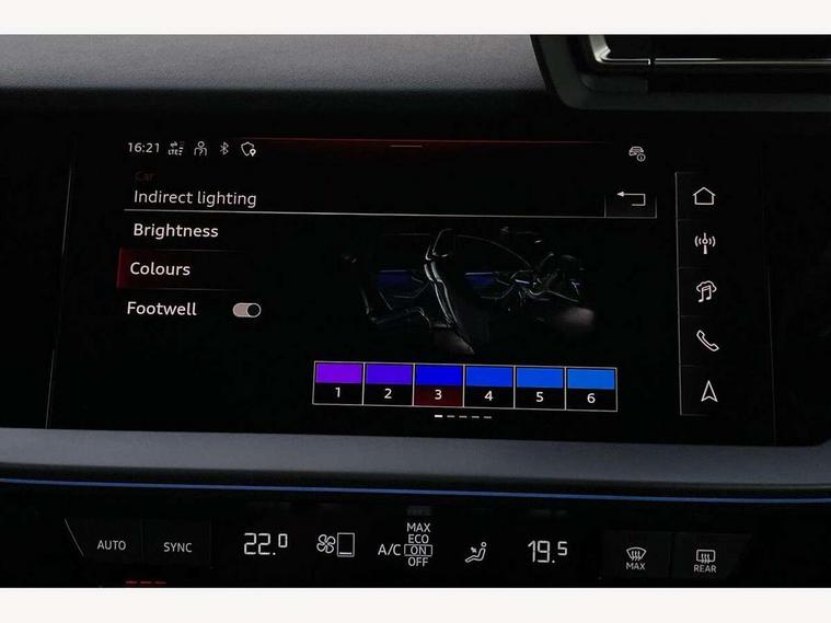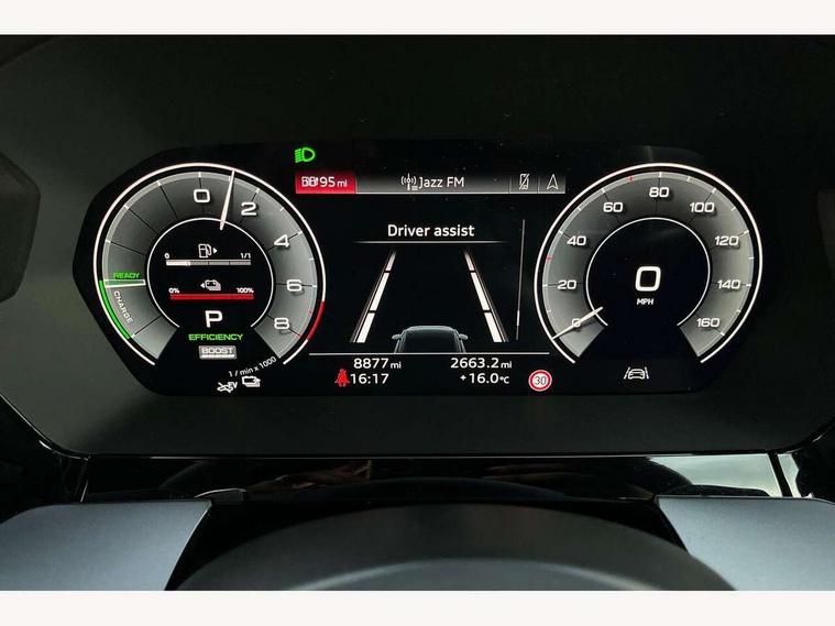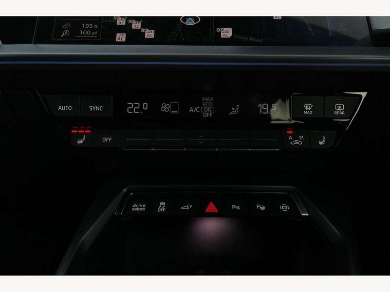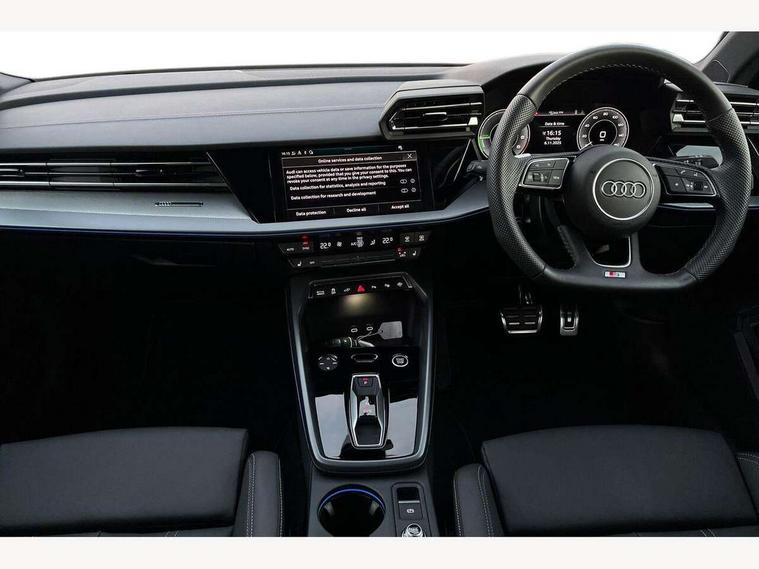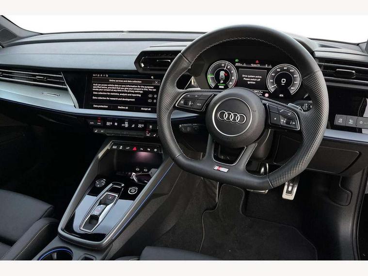Adjustable speed limiter, Audi drive select, Audi smartphone interface with app store includes wireless Apple carplay, Android auto and Amazon alexa integration, Audi virtual cockpit plus - 12.3" full HD resolution dynamic digital instrument cluster, Automatic start/stop system with recuperation, Bluetooth interface, Camera based traffic sign recognition, Collision avoidance assistant, Cruise control, Distraction and Fatigue warning, e-Call (emergency call), Electromechanical power speed sensitive steering, Emergency assist, Lane departure warning system, MMI Navigation Plus with high resolution 10.1" colour touch screen display, Park Assist with parking system Plus, Service indicator, Trip computer, Voice control system with natural language interaction, 3 pin 10 amp domestic charging cable, CCS socket for DC charging, Charging cable for public charging, mode 3 (type 2), 32 A, Compact charging system, Industrial connector CEE 32 A, 230 V, length 1.6 m, Standard suspension, Type 2 socket for AC charging, Audi Phonebox light with wireless charging, Audi sound system - 10 loudspeakers including centre loudspeaker and subwoofer, DAB Digital radio, USB ports with charging function in the rear, Acoustic glass windscreen, All weather light, Aluminium window trim, Auto dimming frameless rear view mirror, Automatic dynamic range control, Body colour exterior mirrors, Chrome exhaust tailpipes, Dipped beam, main beam, position light and turning light, Electrically adjustable/heated/folding/auto dimming door mirrors with integrated LED indications + kerb view function for passenger side, Exterior model badging, Front and rear side air inlets in grained matt black with dark liquid chrome frame, Front electric windows, Front radiator grill in high gloss dark chrome, Heat insulating glass windscreen, Illuminated door sills with aluminium inserts at the front with S logo, Intersection light, LED 3rd brake light, LED brake lights, LED daytime running x3, LED headlights with LED rear lights and dynamic rear indicators, LED rear number plate lights, LED reverse light, LED tail lights, Light and rain sensors, Manoeuvring light, Motorway light, Privacy glass - dark tinted rear window, rear door and side windows, Rear diffuser and grill in grained matt black with inlay in dark liquid chrome, Rear electric windows, Rear side wing doors, Rear wiper, S line bumpers, S roof spoiler, Side S line emblems on front wings, Side sill trim in dark liquid chrome, Static Cornering lights, 12V socket and storage compartment in front centre console, 3 seat bench in 2nd row, 3 spoke flat bottomed leather multifunction sport steering wheel with gear shift paddles, 3-zone deluxe automatic air conditioning, 4 way electrically adjustable lumbar support for driver and front passenger, 40/20/40 split folding rear seat bench, Black cloth headlining, Black front and rear floor mats, Convenience auxiliary air conditioning, Front and rear centre armrest in artificial leather with contrasting stitching on armrests and instrument panel, Front and rear headrests, Heated front seats, Height and reach adjustable steering wheel, Manual boot compartment lid, Manually adjustable front seats, Rear centre armrest with cupholder, S badging on the steering wheel, Seat side bolsters, Single front passenger seat, Stainless steel pedals and front footrest in black, Twin leather upholstery with front sports seats S embossed logo, Aluminium interior elements pack - A3, Multi-coloured LED interior lighting package with Multi-coloured contour lighting of instrument panel - A3, 3x3 point rear seat belts, Acoustic vehicle alerting system, Driver and front passenger airbag with passenger airbag deactivation, Electronic Stabilisation Control (ESC) including ABS, ASR and EDL, First aid kit with warning triangle and 2 safety vests, Front side airbags with head airbags and interaction airbag, Hill hold assist, Pre-sense front with pedestrian and cyclist detection, Seatbelt monitoring, Tyre pressure loss indicator, Anti theft alarm, Anti-theft wheel bolts, Electronically operated child locks, Immobiliser, Remote central locking with safelock, Black dashboard, Inlay in dark aluminium spectrum, Tyre repair kit,