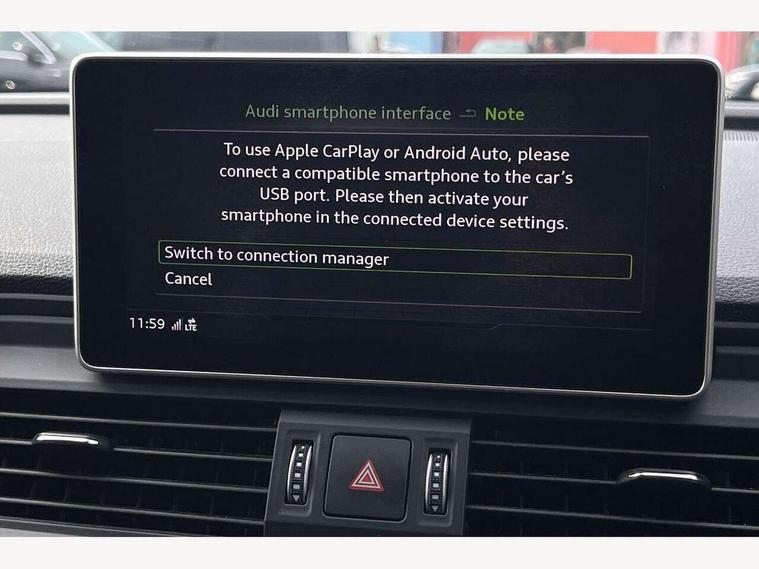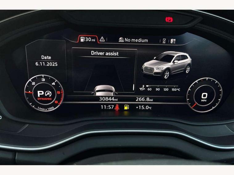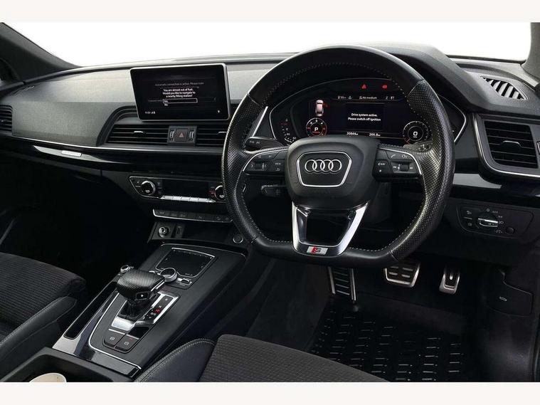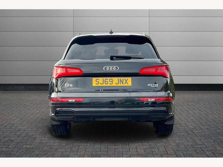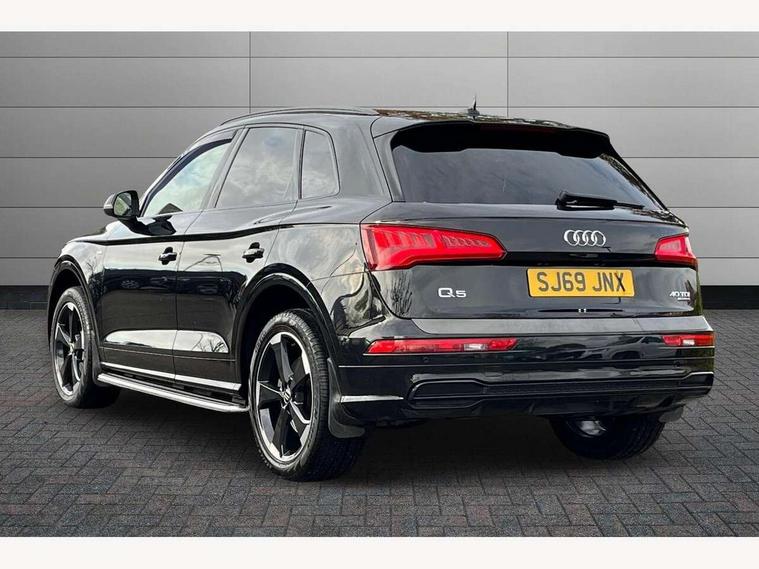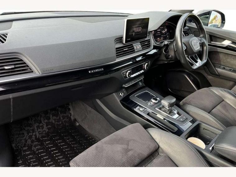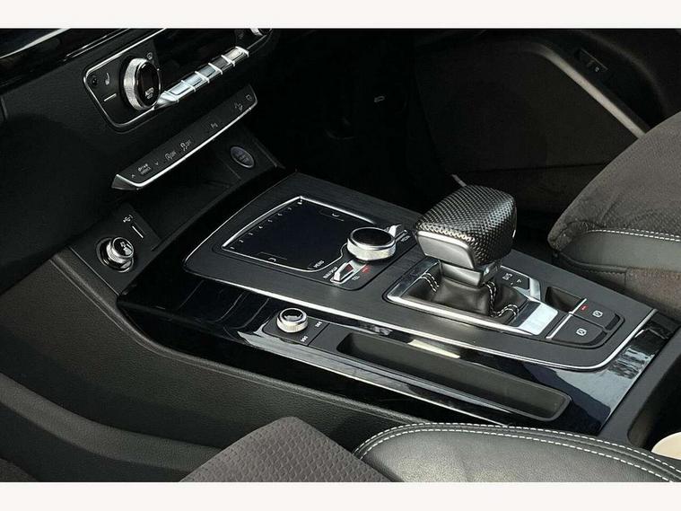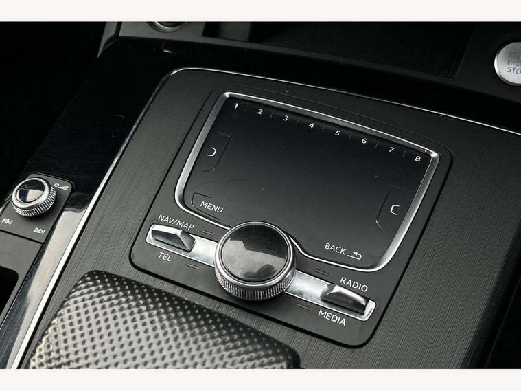 7" Colour driver information system, Audi connect safety and service (e-call), Audi drive select, Audi parking system plus with front and rear sensors, Audi Pre sense collision avoidance, Audi smartphone interface, Automatic start-stop system with coasting functionality and efficiency programme, Cruise control + speed limiter, Electro - mechanical power assisted steering, MMI Navigation, Mobile telephone preparation - bluetooth interface, Power tailgate, Service interval indicator, Voice control system, Diesel particulate filter, Dynamic suspension, Quattro on demand, 2 x USB charging port with aux input socket, 2x SD card slot, CD player, DAB Digital radio, MMI radio plus with 7" colour MMI screen and MMI controller, Acoustic windscreen, Air inlets in matt titanium black with blades in matt aluminium silver, Auto dimming rear view mirror, Automatic headlight levelling, Black roof rails, Body colour bumpers, Body colour rear diffuser with matt aluminium silver surrounds, Body colour underbody protection, Chrome exhaust tailpipe, Electric adjustable/heated/folding door mirrors, Front and rear electric windows, High beam assistant, LED headlights with LED rear lights + dynamic rear indicators, Light and rain sensor for auto activation of lights and windscreen wipers, Loading sill protector in stainless steel, Privacy glass with front acoustic glazing, Rear wiper, Titanium black door mirror housings, 3 rear headrests, 3 spoke flat bottom high multi-function leather steering wheel, 40:20:40 split folding rear seat with rear centre armrest, Black cloth headlining, Contrast stitching on seats, steering wheel and gear lever gaiter, Deluxe 3 zone electronic climate control, Front centre armrest, Front sport seats with S embossed logo, Front/rear floor mats, Heated front seats, Height adjustable front head restraints, Height/reach adjustable steering column, ISOFIX child seat mounting and top tether, Luggage compartment carpet, Manual seat adjustment with 4-way electric lumbar support, Perforated leather gearknob, Removable luggage compartment floor, Stainless steel pedals, Sunvisors with vanity mirrors, Trunk roller cover, LED interior light pack - Q5, Non Smokers pack, Titanium black styling pack - Q5, 3 point seatbelts on all seats, 6 airbags - Driver, front passenger, curtain and side airbags, Electromechanical parking brake, Electronic stabilisation control including ABS, ASR and EDL, Front passenger airbag deactivation, Hill descent control, Hill hold assist, Multi collision brake assist, Pop-up bonnet for pedestrian protection, Pre sense city, Seat belt force limiter, Seatbelt monitoring, Tyre pressure warning, Warning triangle and first aid kit, Anti theft alarm, Anti-theft wheel bolts, Keyless Go access/ignition system, Remote central locking, Black piano finish inlays, 20" 5 arm rotor design sport alloy wheels in gloss anthracite black, diamond cut finish, Tool kit,