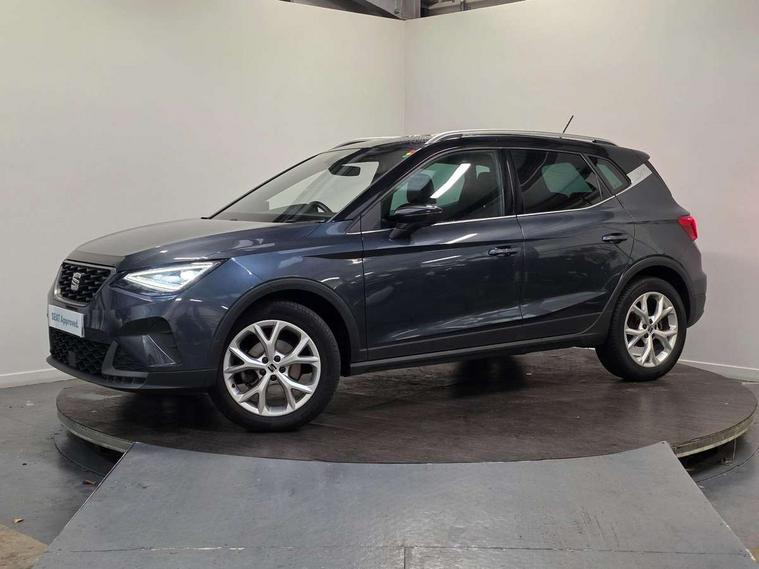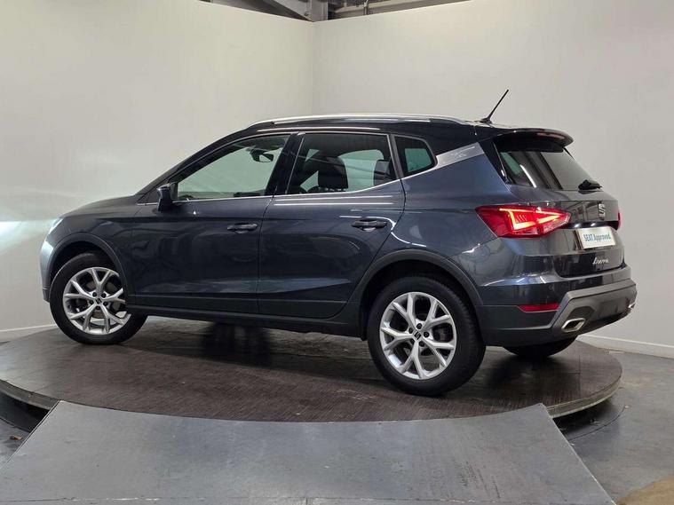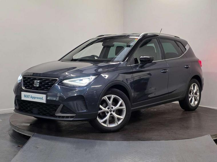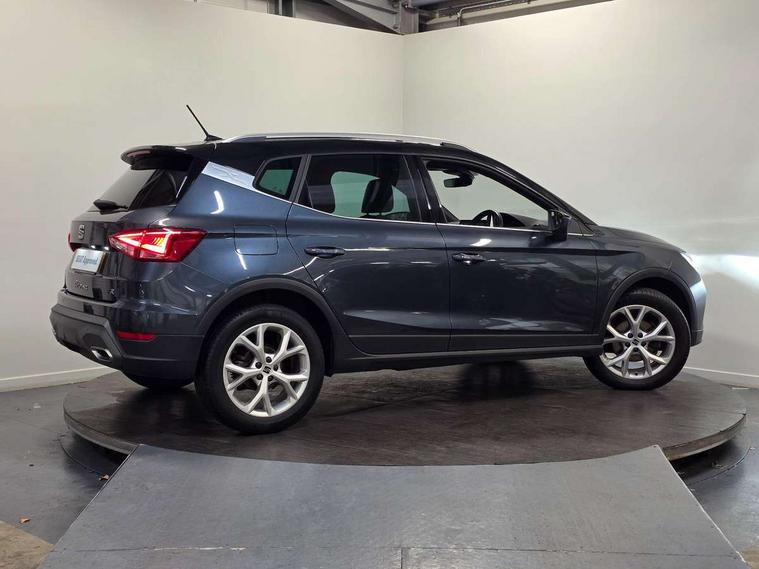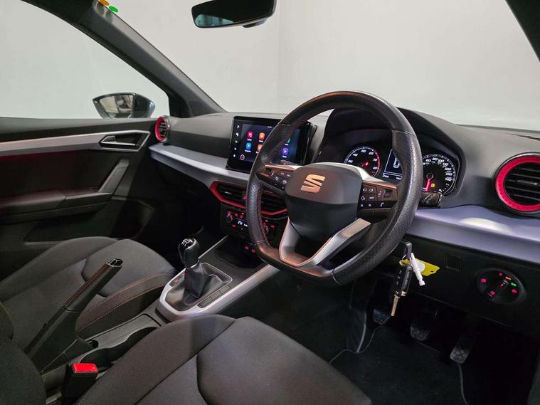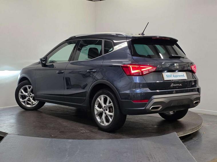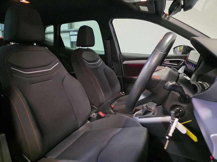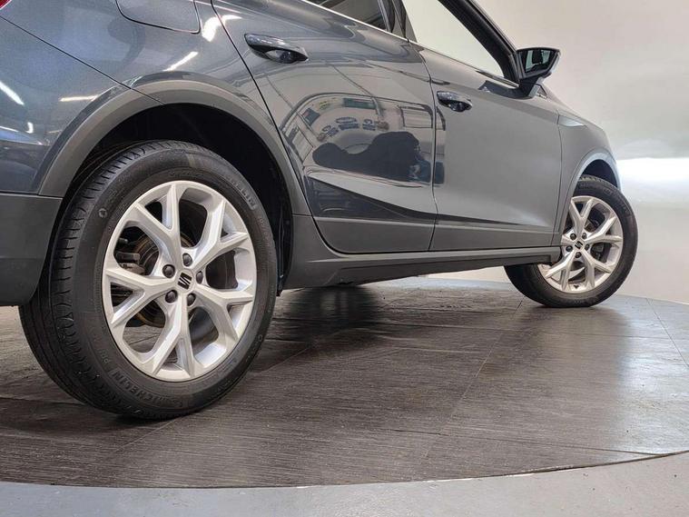 'Lights On' Reminder warning buzzer, 8" Digital cockpit, Digital clock, E-call, Electric speed sensitive power steering, Full Link Smartphone Integration with Mirror Link, Apple Car Play, Google Android Auto with USB Type C cable for Apple and Android compatibility, Lane keeping system, Low fuel warning light, Outside temperature display, Rear parking sensor, RPM counter, Seat connect with safety, service, remote and online, SEAT Drive profile - Four different models normal-sport-eco-individual, steering response, throttle response, Trip computer, Bluetooth interface for hands free and audio streaming, DAB digital radio and AM/FM radio, Steering wheel mounted audio controls, Anti theft roof antenna, Auto dimming interior rear view mirror, Automatic activation of hazard warning lights, Body coloured bumpers, Body coloured door handle inserts, Chrome roof rails and window surrounds, Dark tinted rear windows, Electric front/rear windows, Electrically adjustable, heated and folding door mirrors, Front fog lights with cornering function and rear fog light, FULL LED automatic headlights with dynamic headlight range control, coming and leaving home, LED daytime running lights, LED rear tail lights and licence plate lights, Protective side mouldings, Rain sensing wipers, Rear side wing doors, Rear spoiler, Rear window wash/wipe, Roof colour door mirrors, Third brake light, Twin exhaust pipe styling hidden exhaust pipe, Visible VIN plate, Windshield wiper with intermittent control and potentiometer, 2 cupholders, 3 seat bench in 2nd row, 60/40 split folding rear seat, Aircare filter, Black interior roof, Cloth upholstery, Double boot floor, Driver sunvisor with covered mirror + card holder, Dual zone climate control, Front courtesy light with 2x front and 2x rear reading lights, Front sport seats, Gear shift indicator, Height adjustable front seats, Height/reach adjustable steering column, Illuminated boot, Instrument lighting with brightness control, Interior ambient lighting, Interior light in footwell, central console and door panel, ISOFIX points in outer rear seats with top tether anchorage points, Passenger sunvisor with vanity mirror, Perforated flat bottomed leather steering wheel/gear knob/handbrake with red stitching and FR logo, Single front passenger seat, Two front and three rear height adjustable headrests, Connectivity pack plus - Arona, Interior chrome pack - Arona, 3 point seatbelts on all rear seats, ABS, Active front headrests, Child locks on rear doors, Driver and front passenger airbags with front passenger airbag de activation, front side and curtain airbags, Electronic stability control, Emergency Brake Assist (EBA) and front assist, Front and rear seatbelt reminder, Hill hold control, Multi-Collision braking, Tiredness recognition system, Traction control, Tyre pressure monitoring system, Alarm with back-up horn, Electronic engine immobiliser, Locking wheel bolts, Remote central locking + deadlocks, Tow away protection, Titan black dashboard, 17" Dynamic alloy wheels,