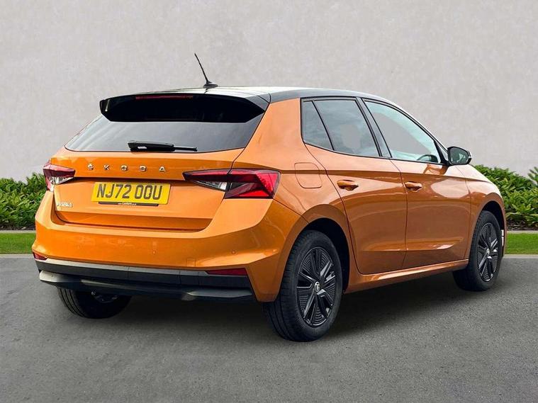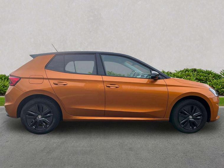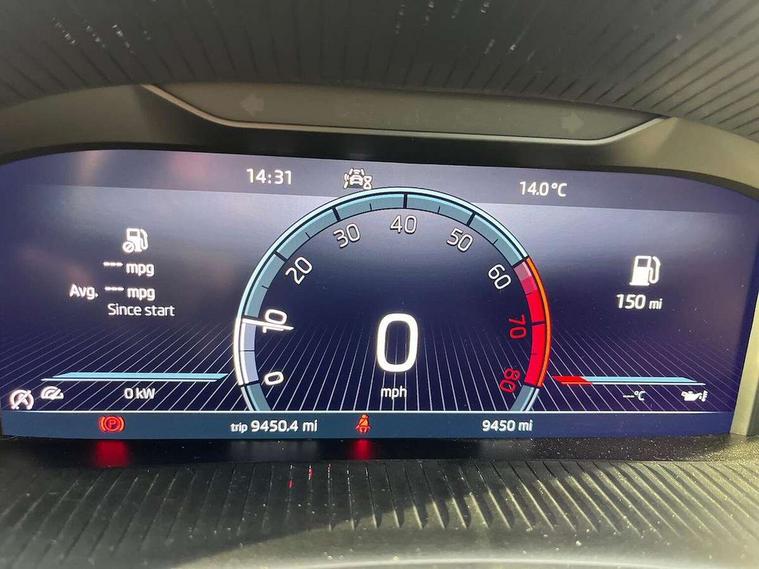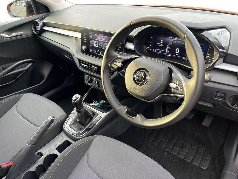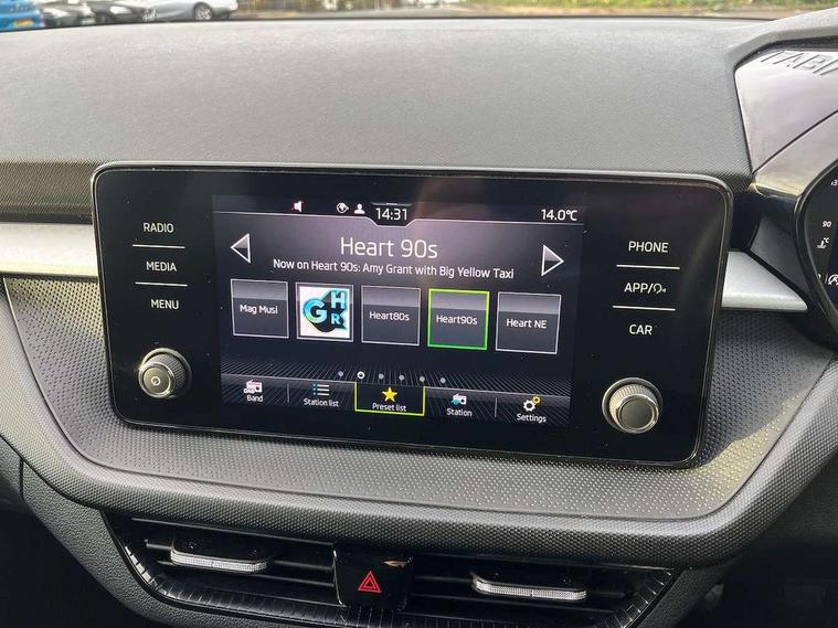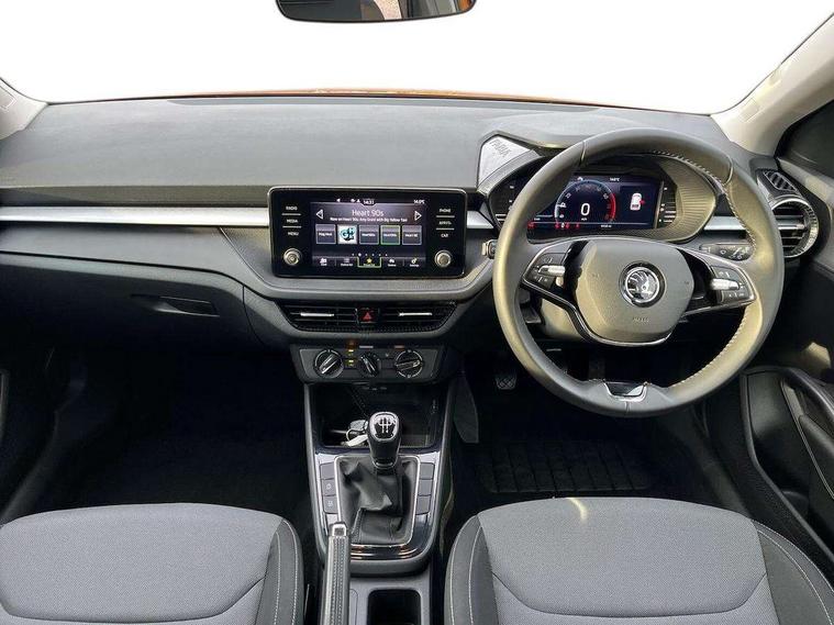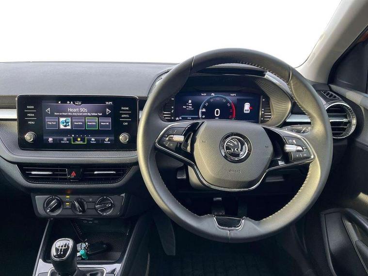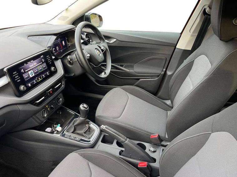 Bluetooth connection, Driver alert system - DAS, Electromechanical power steering, Exterior temperature gauge, Lane assist including road edge detection, Service interval indicator, Virtual cockpit with 10.25" colour display, 2x USB-C in the front (for data transmission and charging), 6 Speakers (4 in front and 2 in rear), Auxiliary socket for external MP3 player, Bolero radio with 8" colour display, DAB digital radio reception, Basic rear lights, Body coloured bumpers, Dimming rear view mirror with black frame, Door mirror integrated indicators, Electrically adjustable and heated door mirrors, Electrically adjustable front windows with function auto up/down, Front window wiper intermittent control, Headlight range control - Automatic, Ice scraper in fuel cap, LED daytime running lights with coming and leaving home feature, Mechanical adjustable rear windows, Privacy glass, Rear LED fog light, Rear side wing doors, Rear window wiper with washing nozzles, Roof mounted spoiler, SKODA tailgate lettering in chrome, Third brake light, 3 rear headrests, Backrest split and folding, Central console with fixed cup holder and storage box, Chrome handbrake release button, Fabric upholstery, Gearshift knob/handle in leather, Grain satin black interior door handles, Hand brake lever handle in leather, Height adjustable front headrests, Height adjustable steering wheel, ISOFIX and TopTether anchorage points to the outer rear seats, ISOFIX and TopTether on the front passenger seat, Luggage compartment lighting, Pollen filter, Rear seat bench unsplit, Single front passenger seat, Storm grey headlining, Sun visors with mirror and airbag label on passenger side, Ticket holder, Umbrella in drivers door, 3-point height adjustable front seats belts with pretensioner and force limiter, Automatic warning lights in case of crash, Driver and passengers airbag with switch off function, e-Call+, ESC including ABS, MSR, ASR, EDS, HBA and XDS, Front and rear seat belt warning, FRONT ASSIST (AEB City and AEB Inter Urban), Front side airbags, Head airbags, One tone horn, Pedestrian protection, Three rear 3-points safety seat belts with pretensioner and force limiter including stop function for outer rear seat belts, Tyre pressure monitoring system, Anti-theft alarm system including immobiliser, interior monitoring, backup horn, and towing protection, Anodized cross line upper decorative trim, Colour Edition air vents, Grain satin black central console cover, Grain satin black lower decorative trim, Satin black door and side trim panel in front, Anti-theft wheel bolts protection, Super-low rolling resistance tyres,