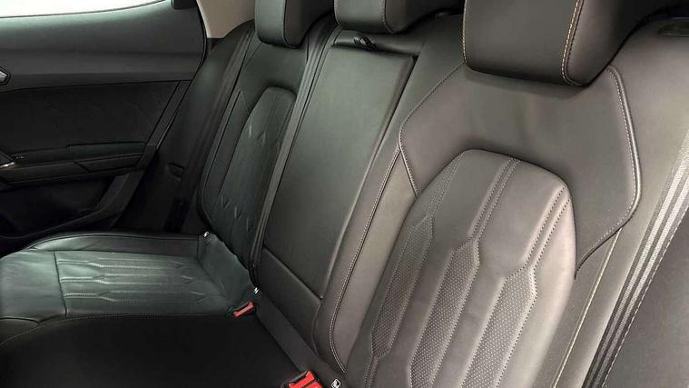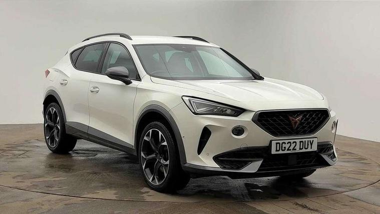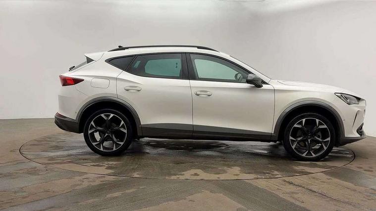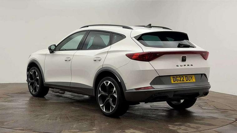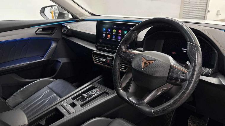Digital cockpit and configurable dashboard, Driver alert system, Driving profile selection, E-call, Forward collision warning with automatic braking, Lane assist, Park assist (inc front/rear parking sensors), PAS, Predictive adaptive cruise control with speed limiter, Rear view camera, RPM, trip computer, outside temp gauge, instrument light brightness, low fuel warning light, lights on reminder, gearshift indicator, Service interval indicator, Start/stop system with regenerative braking, Wireless apple carplay, Wireless phone charger, Electronic locking differential and dynamic traction support, Standard suspension, 2 front and 2 rear USB type C sockets, Auxiliary input socket, DAB radio, Auto dimming rear view mirror, Body colour door handles, Body coloured bumpers, Dark grey wing mirror, Daytime running light with automatic headlight control and coming home feature, Dynamic headlight range control, Electric front/rear windows, Electrically adjustable heated and folding door mirrors with memory function, Front fog lamps with cornering function, Gloss black roof rails and window surrounds, LED Headlights, LED Taillights with dynamic indicator, Rain sensing wipers, Rear diffuser with black simulated exhaust pipes, Rear side wing doors, Rear wash/wipe, Third brake light, Tinted rear windows, Welcome lights, 12v power supply in centre console, 12V socket, 12v socket in loadspace, 2 front and 2 rear reading lights, 230V socket, 3 seat bench in 2nd row, 60/40 split rear bench seat with armrest and mechanical seat release, Dust/pollen filter, Front and rear head restraints, Front centre armrest, Height/reach adjust steering wheel, Illuminated interior front door sills, Illuminated sunvisor with mirror, Isofix, Leather multi function heated steering wheel with gear shift paddles, Luggage tie-down hooks, Single front passenger seat, Three zone climate control with control panel in rear, Variable luggage/load compartment floor, Wraparound lighting, Genuine Nappa leather Pack - Cupra, Navigation system pack with 10" navigation system - Formentor, 3 point seatbelts on all rear seats, ABS, Brake control system - ESC and brake booster, Child proof door locks, Driver and front passenger airbags with front passenger airbag de-activation, Electronic parking brake, Front and rear disc brakes, Front side curtain airbags, Hill hold control, Seat belt reminder for front and rear seats, Tyre pressure monitoring system, Anti theft alarm system, Keyless entry and start system (KESSY), Locking wheel bolts, Copper and aluminium interior detailing, 19" 'Exclusive' machined sport matte black and silver alloy wheels,