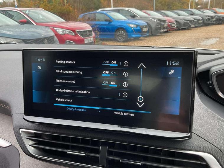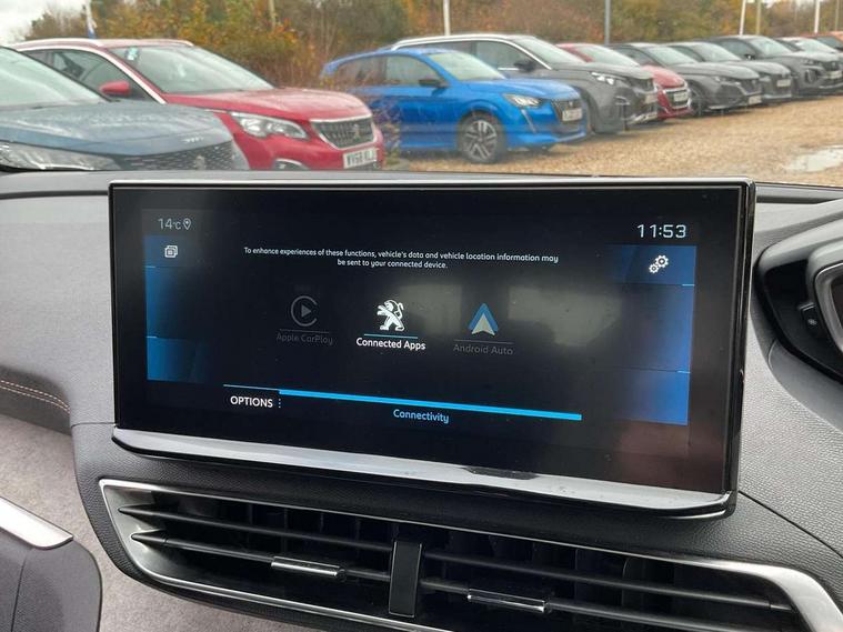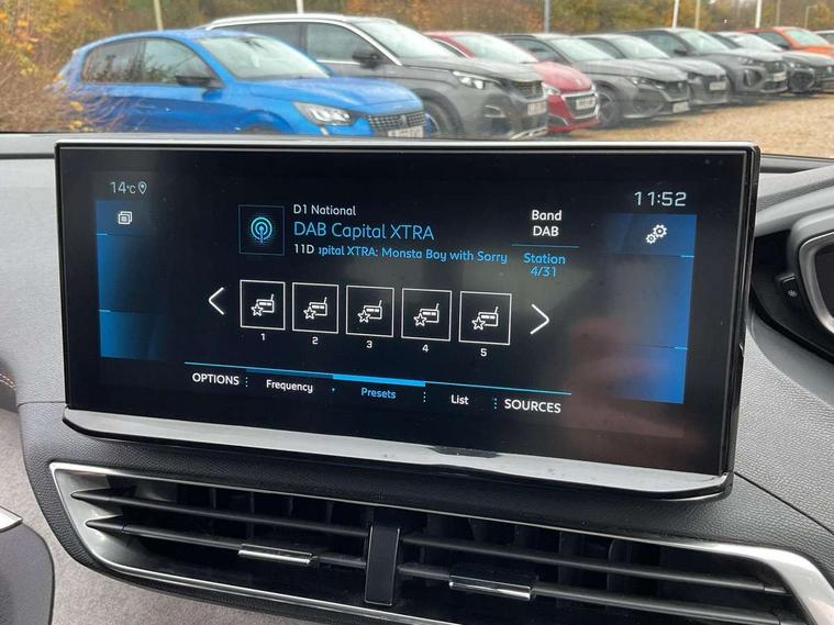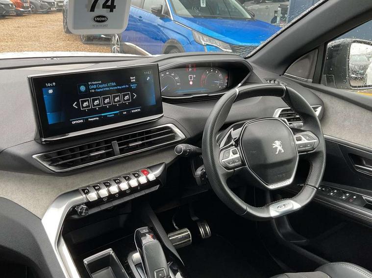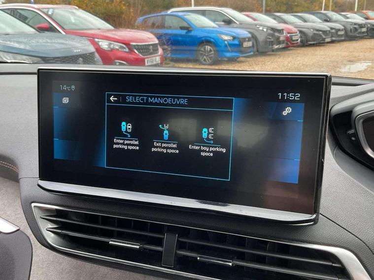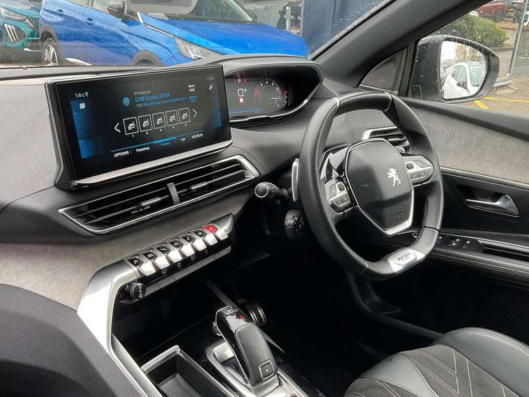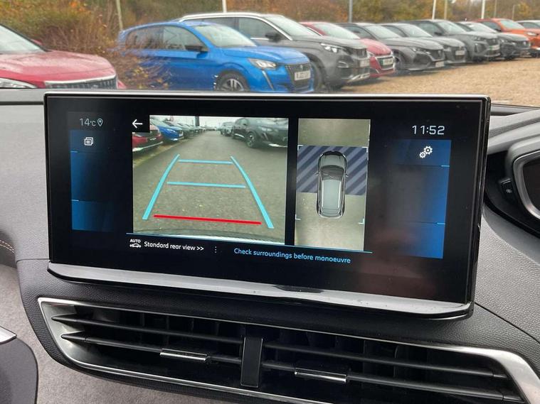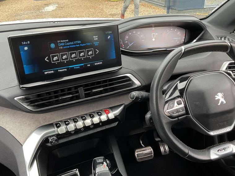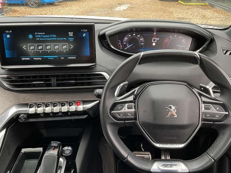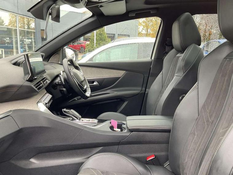 3D connected navigation with 10" HD touchscreen, Bluetooth telephone facility, Drive modes select (Eco, normal and sport), Driving Time Warning (DAA1), Emergency services call system, Extended traffic sign recognition, Exterior temperature indicator with ice warning, Front and rear parking sensors, Mirror screen with mirror link, apple carplay and android auto, Multi function trip computer, Passive blind spot monitoring without Steering correction, PEUGEOT i-Cockpit with 10" high definition capacitive touchscreen, Peugeot i-cockpit with compact multi-function sports steering wheel, PEUGEOT i-Cockpit with configurable 12.3" Head-up digital instrument panel, PEUGEOT SOS and assistance, Rear passenger USB charging sockets (x2) (type A), Speed limit recognition and recommendation, Visio park assist 360 with colour camera system + automatic parking assist, Voice recognition, Dynamic stability control and electronic anti-skid system, Stop/start function, DAB Digital radio, Focal premium HiFi sound system, USB socket, Auto self levelling headlights, Automatic hazard light activation upon heavy brake application, Automatic triggered rear windscreen wiper in reverse gear, Black with chrome detailed front wing trim, Body colour door handles, Body colour rear roof spoiler with stainless steel edging trim, Body protectors (bottom of front and rear bumpers + wheel arches + protection at bottom of doors) in black, Dark tinted rear side windows + tailgate window, Diamond Black door mirror shells, Door mirror mounted LED courtesy floor lighting, Electric folding door mirrors with exterior courtesy LED lighting, Electric operated/heated door mirrors, Fog Mode, Front windscreen wiper with magic wash cleaning system, Full LED headlights with LED fog lights with static cornering function, Gloss black B and C pillar and aerodynamic deflector trim, Gloss black front bumper air scoops, Gloss black rear cluster connecting strip, Gloss black windscreen trim, GT emblem in satin copper (front wings and tailgate), Headlights left on audible warning, Heated rear windscreen with integrated antenna, LED daytime running lights, LED front indicator, LED rear number plate lighting, LED side indicator lights integrated into door mirrors, LED third brake light, One touch electric front/rear windows with pinch protection, Rear LED Peugeot signature 'Claw Effect' lights, Rear side wing doors, Stainless steel roof arches, Twin exhaust tailpipe, 1/3 to 2/3 split folding rear seats, 12V Sockets in dashboard, rear cabin and load area, 2 cupholders in front centre console, 2 cupholders in rear armrest, 2 x Rear reading spotlights, 2x Rear coat hooks, 3x Isofix child seat fittings in the front passenger and outer rear seats, 4 Grab handles retractable and damped, Aikinite stitching in armrest, gear lever and dashboard facia, Aluminium pedals, Blue ambient lighting for connecting zone, Blue ambient lighting to front door panels, central storage and cupholders, Blue ambient lighting to headup instrument panel, Centre front armrest with butterfly wing opening and illuminated storage compartment, Dual zone automatic climate control, Electric power steering with reach and rake adjustable steering column, Flocked front door pocket interior with blue ambient lighting, Flocked glovebox interior, Focal tweeter speaker grilles in Belem bronze metal effect finish, Foldable front passenger seat with picnic table, Footwell illumination, Front interior light with 2 reading spotlights and rear interior light with timer, Front passenger seat manual adjustment (longitudinal and back rest angle), Front seat back map pockets, Gear shift indicator, Illuminated glovebox, Individual left and right controls in boot for seat folding, LED interior lighting in storage spaces and load area, LED roof interior lighting, Mistral floor mats with Aikinite contrast stitching, Mistral full grain perforated leather steering wheel with aikinite stitch detail and satin chrome 'GT' emblem, Rear bench seat with central armrest and ski hatch, Rear centre console ventilation system, Roof lining - Mistral black, Satin chrome dashboard trim, Satin chrome digital instrument panel and touchscreen trim, Satin chrome front door panel recess trim, Satin chrome interior door handles, Satin chrome scorpion's tail and toggle switch trim, Seatbelt not fastened audible and visual alert for front seats, Seatbelt unfastened on the move audible and visual alert for front and rear seats, Sunvisors with illuminated vanity mirrors, Two position boot floor, Drive assist plus pack - 3008, Driver sport pack - 3008 Auto, Safety plus pack with high beam assist - 3008, Visibility pack - 3008, 3x Rear three-point retractable seatbelts with force limiters in the outer rear seats, ABS (Anti-lock Braking System) with EBD (Electronic Brakeforce Distribution) and EBA (Emergency Braking Assistance), Adaptive driver and front passenger airbags with passenger airbag deactivation function, Driver and front passenger side airbags, Electric child locking functionality on rear windows and doors, Electric parking brake, Front and rear curtain airbags, Front optimised safety headrests and 3 x rear retractable headrests with height adjustable, Front three point retractable seatbelts with pre tensioners and force limiters, Front ventilated disc brakes and rear disc brakes, Hill start assist, Two tone horn, Automatic door locking when moving off, Electronic immobiliser, key operated exterior door lock from the left hand door, Perimetric and volumetric alarm with lift and tilt sensor, Peugeot Open and Go System, Remote control central locking with two plip keys, Puncture repair kit including compressor, sealant cartridge and towing eye,