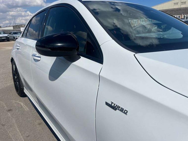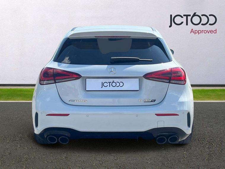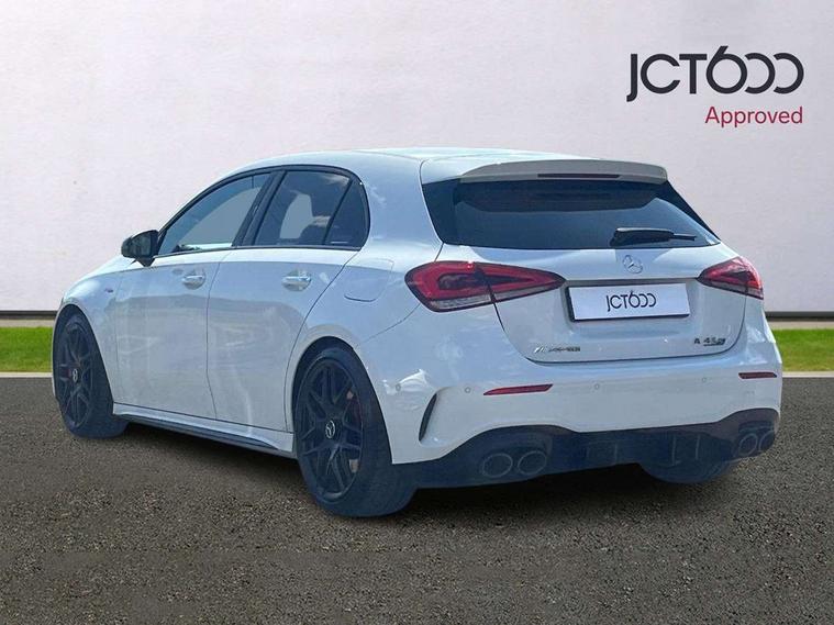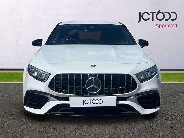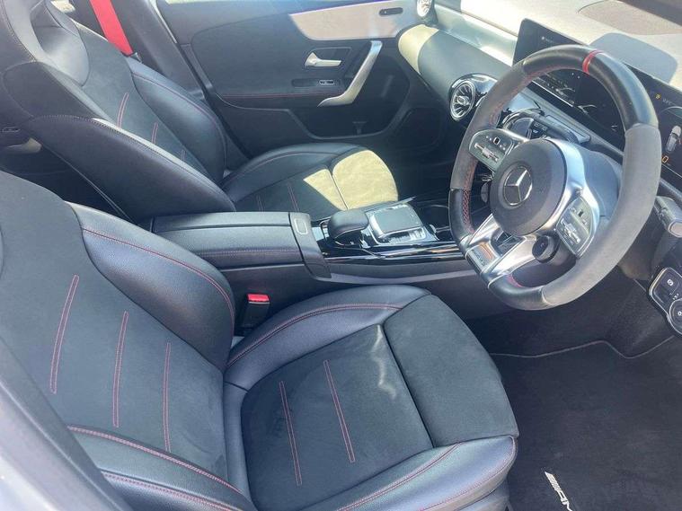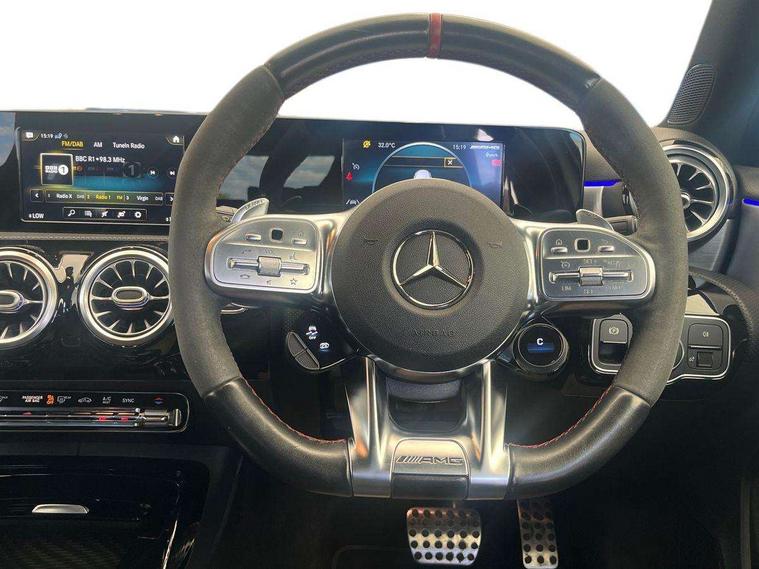 10.25 inch touchscreen central media display with AMG specific, AMG start up logo, visualisation of the AMG drive programs, vehicle and engine data, 10.25" Digital instrument cluster display screen, 180 degree rear view camera with parking guidelines, Active lane keep assist, Active park assist with parktronic system including front and rear parking sensors, AMG DYNAMIC SELECT with driving programs (Slippery, Comfort, Sport, Sport+, Individual and Race) including drift mode via steering wheel shift paddles, AMG speed sensitive steering with two sets of steering characteristics, AMG track pace, Attention assist, Brake pad wear indicator warning light, Car wash mode, Cruise control + speed limiter, Direct steering, Dual bluetooth interfaces, ECO start/stop function, Fluid level warning indicator for fuel, oil, coolant and washer fluid, Hard-disk navigation, Hey Mercedes Voice activation, Lamp failure indicator, MBUX augmented reality for navigation, Mercedes me connect including emergency call system, accident recovery, breakdown and maintenance management, Outside temperature gauge, Owners manual in English, Pre-installation for private car sharing, Pre-installation for Vehicle Monitoring, Pre-installation for Vehicle Setup, Preinstallation for Mercedes Benz link, Service indicator (ASSYST), Smartphone integration with Apple CarPlay and Android auto, Trip computer, Wireless charging, AMG performance 4MATIC+ with torque control, AMG suspension including AMG specific axles and sporty spring/damper setup, Rear axle multi-link, 10 speakers, 2 USB ports (type C) in rear stowage compartment and one in front of center console, DAB Digital radio, MBUX multimedia system with DAB digital radio and touchpad including satellite navigation, Mercedes-Benz advanced sound system - 225W, 4 Electric Front and Rear windows, Adaptive brake lights, AMG A45 S bodystyling -rear apron, four vertical fins, side sill panels, roof spoiler lip, specific front apron, diffuser look and S label on boot lid, AMG bodystyling - Front apron with splitter in chrome, rear apron with chrome trim and chrome visible trim elements in tailpipe, AMG real performance exhaust sound system, AMG specific radiator grille in high gloss chrome with AMG lettering, Black weather strip, Body colour bumpers, Body colour door handles, Body colour side skirt, Electric adjustable and heated door mirrors with integrated LED side indicators, Headlamp assist automatic headlamp activation, Heated glass rear windscreen + timer control, High gloss black beltline, Illuminated front door sill panels with Mercedes-Benz lettering, LED high performance headlamps with integrated LED daytime running lights, LED tail lamp, LED third brake light, Privacy glass, Radio aerial, Rain sensing windscreen wipers with two sensitivity settings, Rear fog lights, Rear wiper, Two round twin tailpipe trim elements each measuring 90 mm in diameter and AMG lettering plus ribbing on the inside of the pipe, Valve control dependent on drive program, Wider wheel arches for AMG wheels, Window line trim strip in high gloss black, 3 Spoke flattened lower section sporty design AMG Performance steering wheel in nappa leather/Dinamic microfibre, 40:20:40 split folding rear seats, AMG brushed stainless steel sports pedals with rubber studs, AMG floor mats, AMG performance seats, AMG sporty centre console with raised front section and integral control switched for manual transmission mode, AMG Steering wheel touch control buttons, Auto Mercedes-Benz child seat recognition sensor, Black air vents with surround in silver chrome, Black roof lining, Front centre armrest with storage compartment, Front head restraints, Front seat cushion length adjustment, Heated front seats, Height/reach adjustable steering column, Interior lighting - 64 colour Ambient lighting, Interior mirror with reading lamps in black and frameless, Rear armrest with 2 cupholders, Rear head restraints, Seat occupancy sensor for front passenger seat, Silver coloured aluminium gear shift paddles on steering wheel, Stowage compartment in centre console with retractable cover, Sunvisors with illuminated vanity mirrors, Touchpad on center console, Twin front cupholders, Two zone thermotronic luxury automatic climate control, AMG Driver's pack - A Class, AMG night pack - A Class, AMG performance seat pack - A Class, Light and sight pack - A Class, Mirror package - A Class, Seat comfort pack - A Class, 3 rear 3 point seatbelts, 3 stage electronic stability programme, ABS with Brake Assist, Active bonnet, Active brake assist includes forward collision warning system with autonomous braking, Adaptive brake assist with hold function and hill start assist, AMG high performance brake system with red painted brake callipers and black AMG lettering at the front, ventilated and perforated brake discs, Black seatbelts, Bonnet with power domes, Childproof locks manually operated for rear doors and electrically operated for rear power windows, Crash responsive emergency lighting, Driver and passenger head and side airbags, Drivers knee airbag, Dual stage driver/passenger airbags, Electronic parking brake, ESP curve dynamic assist, ESP with ASR, Front and rear seatbelt reminder, ISOFIX and top tether child seat fixing points in two outer rear seats, Tyre pressure monitoring system, Warning triangle and first aid kit, Window airbags, Alarm system/interior protection/immobiliser, Keyless entry lock/unlock, Keyless Go, Remote central locking and crash sensor with emergency opening function, Urban guard vehicle protection system with immobiliser and interior protection, Light aluminium with longitudinal grain interior trim, 19" AMG 5 twin spoke light alloy wheels, Summer tyres, Tirefit sealant kit, Wheel arches with flared AMG wings with TURBO 4MATIC+ lettering,