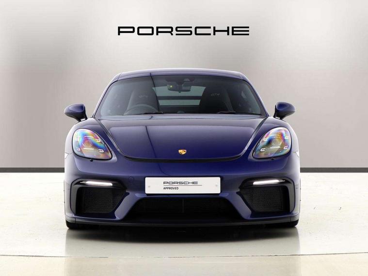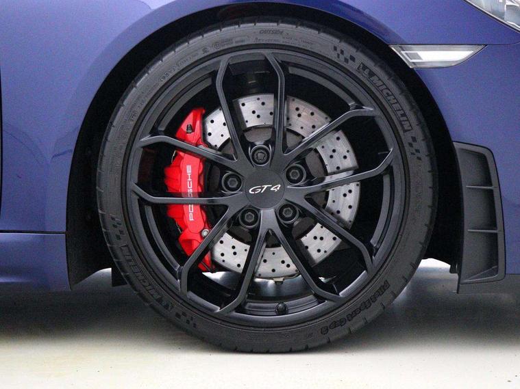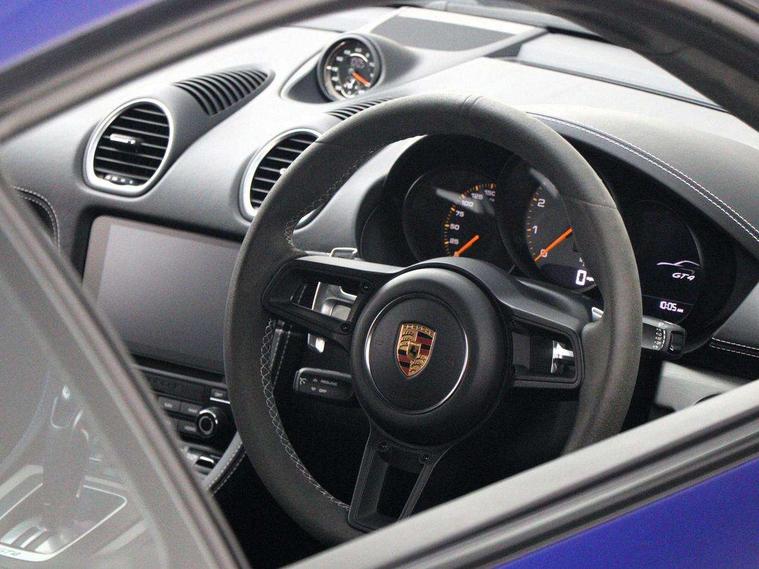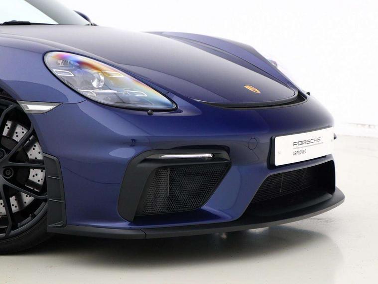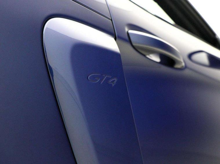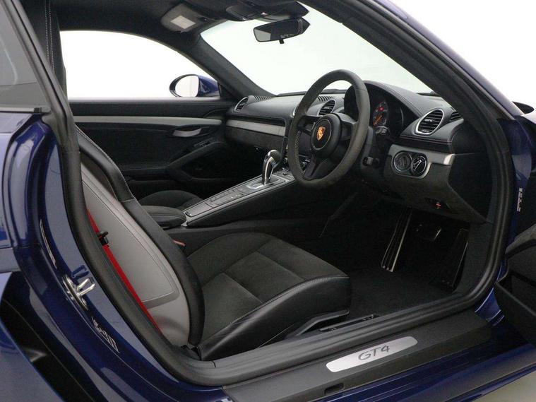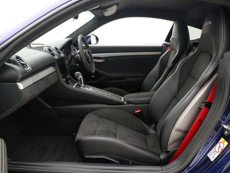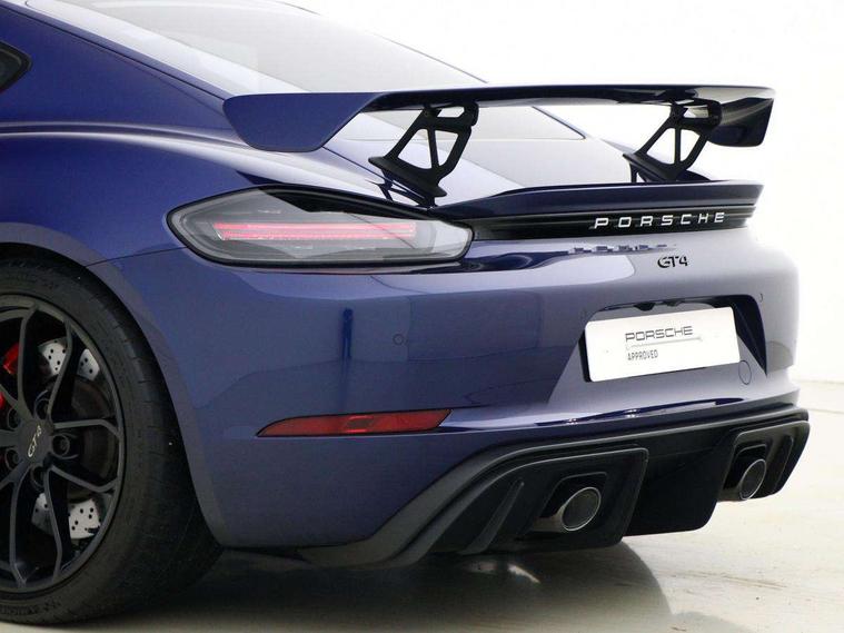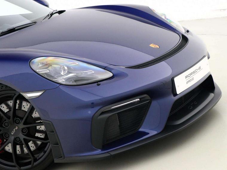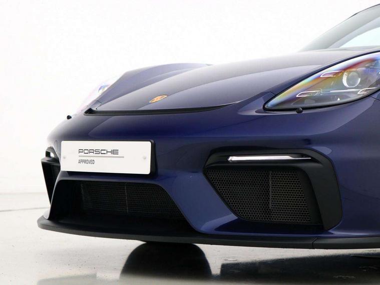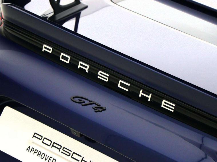 Auto blip button to activate automatic throttle-blipping for downshifts, Auto start and stop system, Digital displays for vehicle speed, chosen gear, odometer, trip odometer and clock, eCall emergency call system, Electromechanical direct steering with variable steering ratio and steering pulse generator, Instrument cluster with central rev counter and high-resolution 4.6 inch colour display, Porsche track precision app, 64 litre fuel tank, Adjustable chassis for race track use (toe, camber, anti-roll bars), Aluminium block and cylinder heads, Central cooler, Direct fuel injection (DFI), Dynamic gearbox mount system, Gasoline particulate filter, Integrated dry-sump lubrication with an on-demand oil pump, Porsche Active Suspension Management (PASM) sport suspension with lowered 30mm ride height, Porsche Doppelkupplung (PDK), Porsche stability management (PSM) including ABS with two switchable stages (ESC OFF and ESC+TC OFF), Porsche TORQUE Vectoring (PTV) with mechanical rear differential lock, Rear wheel drive, Shortened gear lever, Two seater vehicle with mid mounted engine, Two three-way catalytic converters and on-board diagnostics for monitoring emission control system and coated particulate filter, Variable intake manifold with two switchable resonance valves, VarioCam (camshaft control for inlet and exhaust valves) and adaptive cylinder management, Water cooled with thermal management, DAB Digital radio, Integrated 4G/LTE compatible SIM including data for the Porsche Connect Services, Integrated compatible SIM including Porsche Connect Services, Navigation incl porsche + Apple Carplay, connect module, wireless internet access, carfinder, remote vehicle status, remote service and vehicle track, Wifi and music streaming, 3rd brake light, Automatic headlight activation including welcome home lighting, Black side window trim, Body colour bumpers, Body colour door handles, Closed underbody panel with two additional ventilation openings (NACA) for exhaust system, Door opening loops in silver, Electrically adjustable heated exterior mirrors on door waist rails, aspherical on driver's side, Fixed GT4 rear wing in exterior colour with integrated sideplates, wing uprights in black aluminium, Fixed rear spoiler, Front apron with large cooling intakes with grilles and spoiler lip with recessed GT4 logo in black and central air outlet, Green tinted heat insulating glass, Grey top tinted windscreen, Heated rear windscreen, Intelligent lightweight body in Aluminium/Steel composite construction, LED tail lights and integral 4 point brake lights and reversing lights, Power windows with one touch operation and door seal protection, Rain sensor, Rear apron lower part in black with integrated rear diffuser, Rear boot, Separate tinted auxiliary lights in the front end with LED indicators and position lights, Side air intakes with sideblades embossed with 'GT4' logo painted in exterior colour, Twin tract sports exhaust system with two tailpipe in stainless steel high gloss black, Wide opening rear hatch with heated screen, Windscreen washer system with aero wiper blades and washer jets, 12V sockets in passenger footwell and centre console storage compartment, Additional smooth finish leather with door panel armrest and centre console main storage compartment, Adjustable fan with air recirculation and defroster functions, Ascending centre console with uncovered storage compartment and closed storage compartment, Clothes hooks on front seat backrests, Footwell illumination, Front and rear luggage compartments, Front headrests, GT4 logo on gear lever, Heated seats, LED reading lights, orientation, ignition lock, additionally luggage compartment and glove compartment lighting, Lockable glovebox, Performance display in Porsche communication management (PCM), Race-Tex roof lining and A pillar trims, Seat centres in race tex, side bolsters, headrests in leather and headrests embroidered with GT4 logo in silver, Single front passenger seat, Storage compartments in each doors, Two individual cup holders (Passenger side, integrated into dashboard trim strip), 3 point automatic seatbelts, ASR, Electrically controlled parking brake, Front lightweight spring strut axle, Front seatbelt pretensioners + load limiters, Full size driver and passenger airbags, Lightweight spring strut rear axle, helper springs, anti roll bar, suspension mountings partly ball jointed, Passenger airbag deactivate switch, Porsche side impact protection doors with thorax airbag in outer backrest side bolster and head airbag for driver/passenger in door panel, Tyre pressure monitoring system (TPM) with track mode, Alarm system with interior surveillance, Anti-theft wheel bolts, Engine immobiliser with in key transponder, central locking and remote control, 20" 718 GT4 alloy wheels in satin platinum in sport tyre,