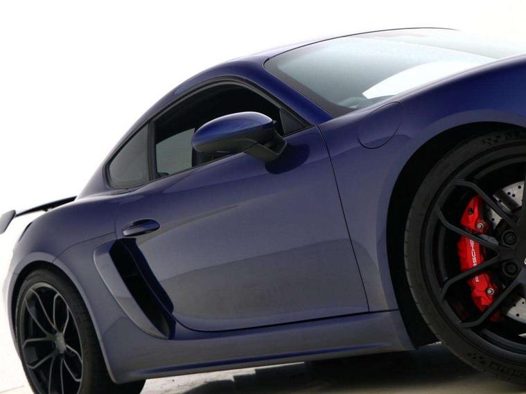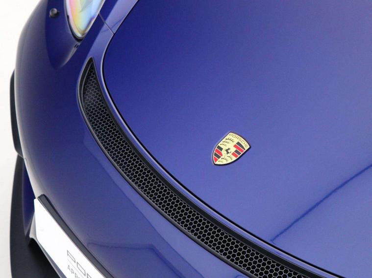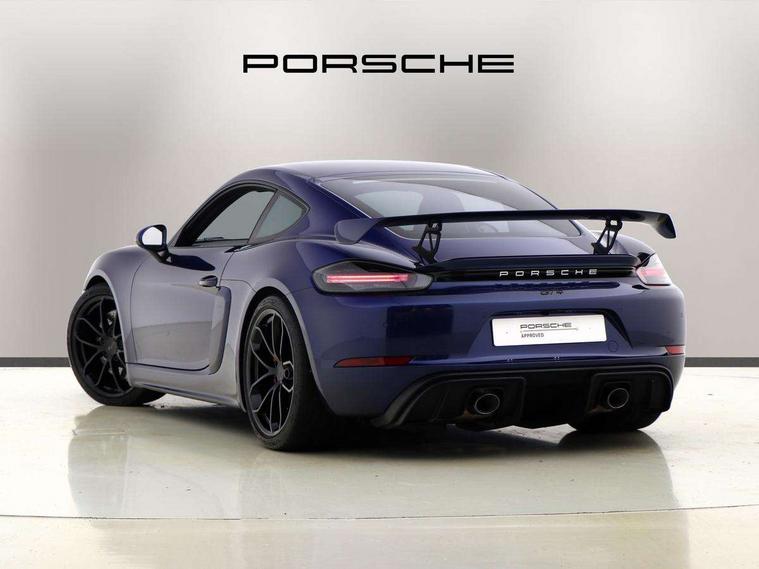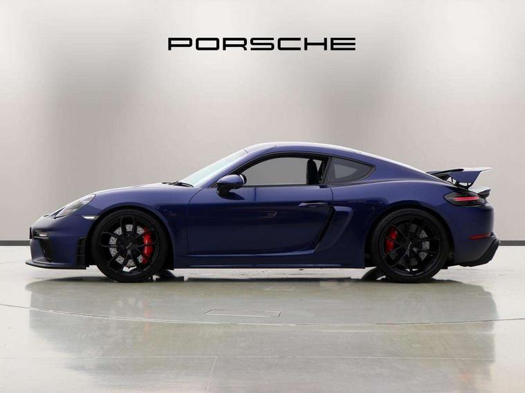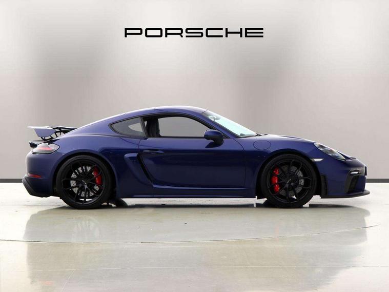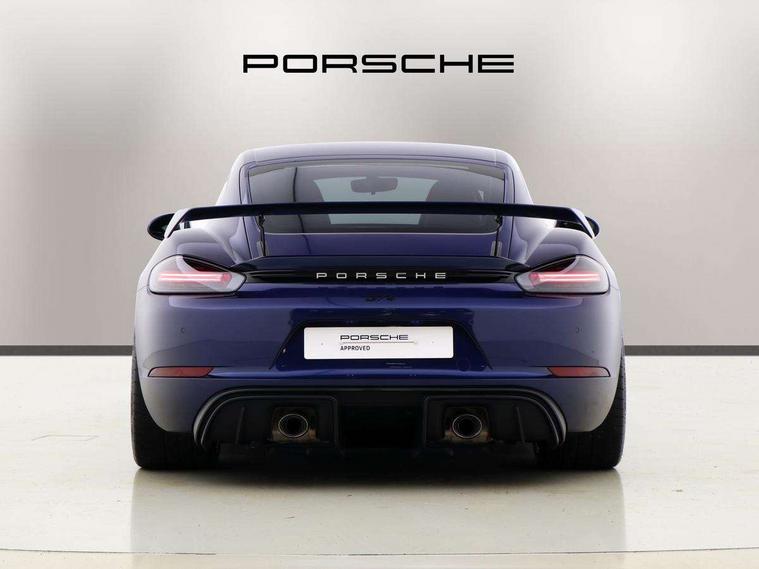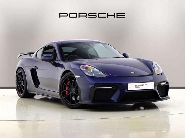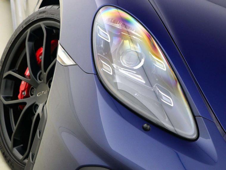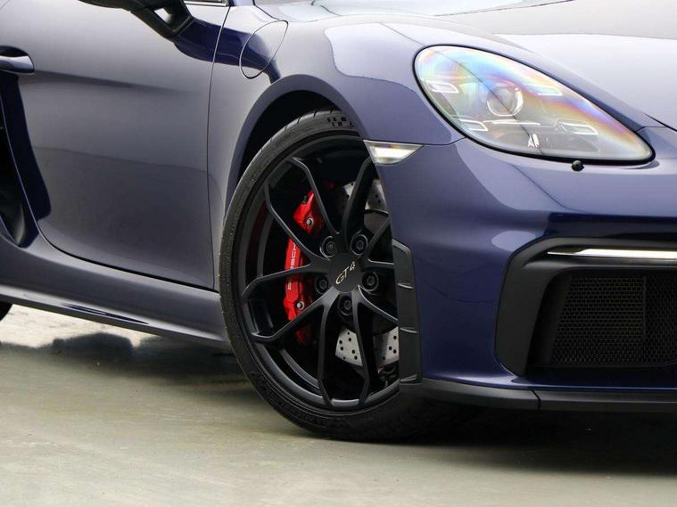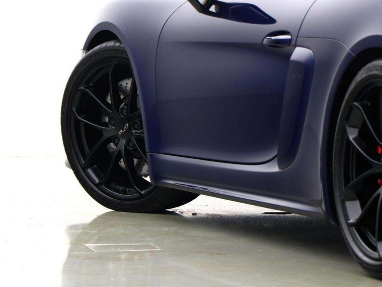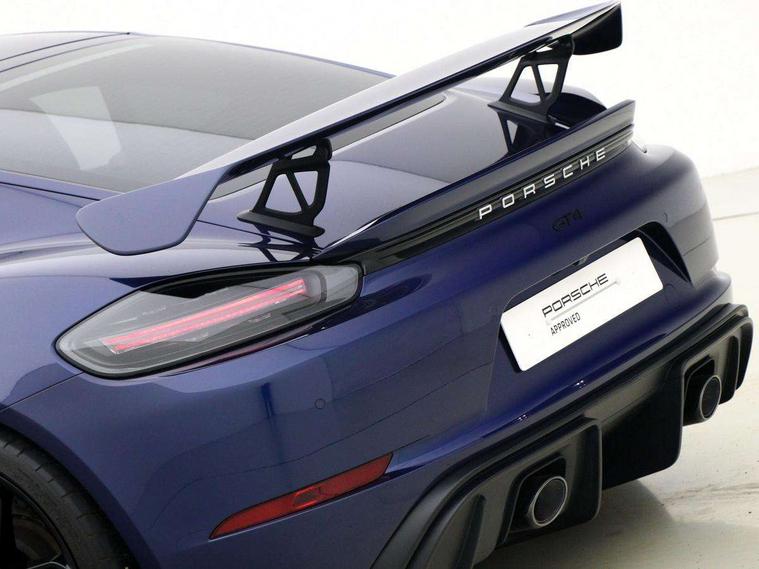 Auto blip button to activate automatic throttle-blipping for downshifts, Auto start and stop system, Digital displays for vehicle speed, chosen gear, odometer, trip odometer and clock, eCall emergency call system, Electromechanical direct steering with variable steering ratio and steering pulse generator, Instrument cluster with central rev counter and high-resolution 4.6 inch colour display, Porsche track precision app, 64 litre fuel tank, Adjustable chassis for race track use (toe, camber, anti-roll bars), Aluminium block and cylinder heads, Central cooler, Direct fuel injection (DFI), Dynamic gearbox mount system, Gasoline particulate filter, Integrated dry-sump lubrication with an on-demand oil pump, Porsche Active Suspension Management (PASM) sport suspension with lowered 30mm ride height, Porsche Doppelkupplung (PDK), Porsche stability management (PSM) including ABS with two switchable stages (ESC OFF and ESC+TC OFF), Porsche TORQUE Vectoring (PTV) with mechanical rear differential lock, Rear wheel drive, Shortened gear lever, Two seater vehicle with mid mounted engine, Two three-way catalytic converters and on-board diagnostics for monitoring emission control system and coated particulate filter, Variable intake manifold with two switchable resonance valves, VarioCam (camshaft control for inlet and exhaust valves) and adaptive cylinder management, Water cooled with thermal management, DAB Digital radio, Integrated 4G/LTE compatible SIM including data for the Porsche Connect Services, Integrated compatible SIM including Porsche Connect Services, Navigation incl porsche + Apple Carplay, connect module, wireless internet access, carfinder, remote vehicle status, remote service and vehicle track, Wifi and music streaming, 3rd brake light, Automatic headlight activation including welcome home lighting, Black side window trim, Body colour bumpers, Body colour door handles, Closed underbody panel with two additional ventilation openings (NACA) for exhaust system, Door opening loops in silver, Electrically adjustable heated exterior mirrors on door waist rails, aspherical on driver's side, Fixed GT4 rear wing in exterior colour with integrated sideplates, wing uprights in black aluminium, Fixed rear spoiler, Front apron with large cooling intakes with grilles and spoiler lip with recessed GT4 logo in black and central air outlet, Green tinted heat insulating glass, Grey top tinted windscreen, Heated rear windscreen, Intelligent lightweight body in Aluminium/Steel composite construction, LED tail lights and integral 4 point brake lights and reversing lights, Power windows with one touch operation and door seal protection, Rain sensor, Rear apron lower part in black with integrated rear diffuser, Rear boot, Separate tinted auxiliary lights in the front end with LED indicators and position lights, Side air intakes with sideblades embossed with 'GT4' logo painted in exterior colour, Twin tract sports exhaust system with two tailpipe in stainless steel high gloss black, Wide opening rear hatch with heated screen, Windscreen washer system with aero wiper blades and washer jets, 12V sockets in passenger footwell and centre console storage compartment, Additional smooth finish leather with door panel armrest and centre console main storage compartment, Adjustable fan with air recirculation and defroster functions, Ascending centre console with uncovered storage compartment and closed storage compartment, Clothes hooks on front seat backrests, Footwell illumination, Front and rear luggage compartments, Front headrests, GT4 logo on gear lever, Heated seats, LED reading lights, orientation, ignition lock, additionally luggage compartment and glove compartment lighting, Lockable glovebox, Performance display in Porsche communication management (PCM), Race-Tex roof lining and A pillar trims, Seat centres in race tex, side bolsters, headrests in leather and headrests embroidered with GT4 logo in silver, Single front passenger seat, Storage compartments in each doors, Two individual cup holders (Passenger side, integrated into dashboard trim strip), 3 point automatic seatbelts, ASR, Electrically controlled parking brake, Front lightweight spring strut axle, Front seatbelt pretensioners + load limiters, Full size driver and passenger airbags, Lightweight spring strut rear axle, helper springs, anti roll bar, suspension mountings partly ball jointed, Passenger airbag deactivate switch, Porsche side impact protection doors with thorax airbag in outer backrest side bolster and head airbag for driver/passenger in door panel, Tyre pressure monitoring system (TPM) with track mode, Alarm system with interior surveillance, Anti-theft wheel bolts, Engine immobiliser with in key transponder, central locking and remote control, 20" 718 GT4 alloy wheels in satin platinum in sport tyre,