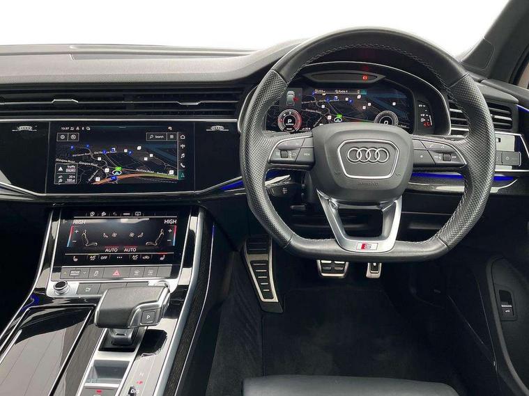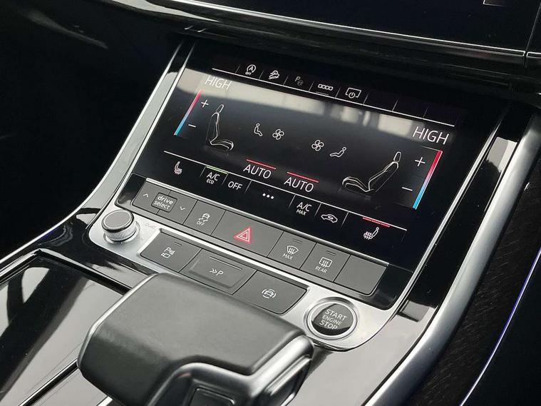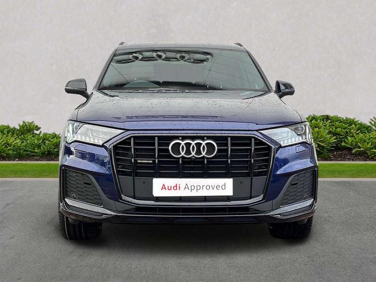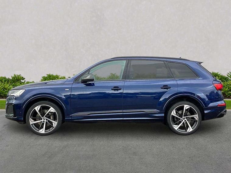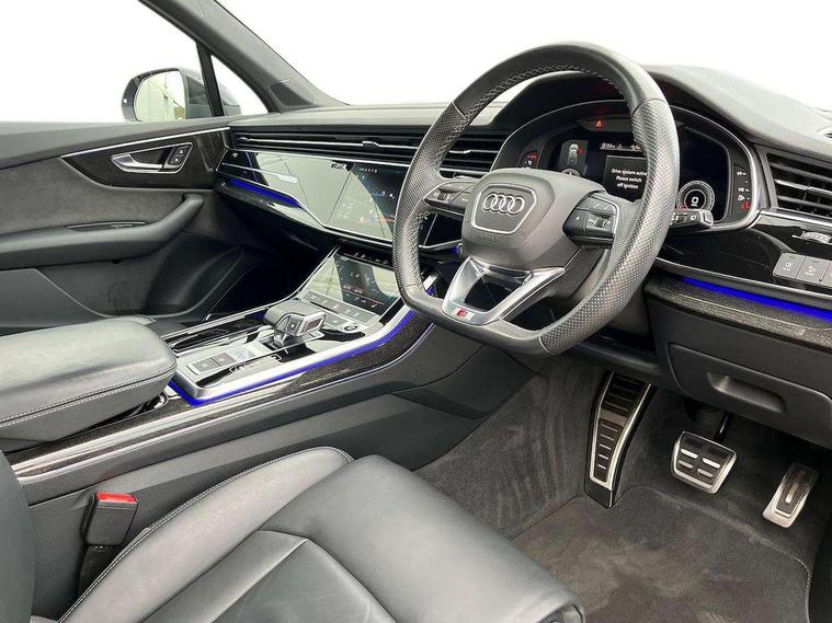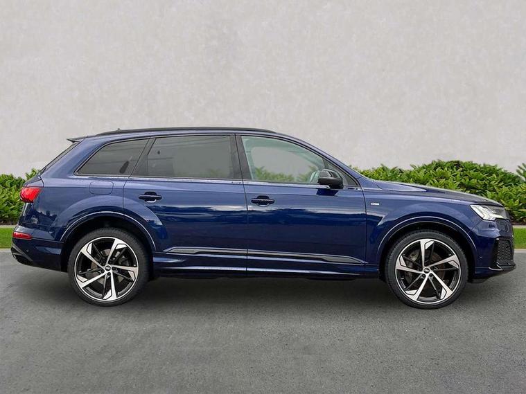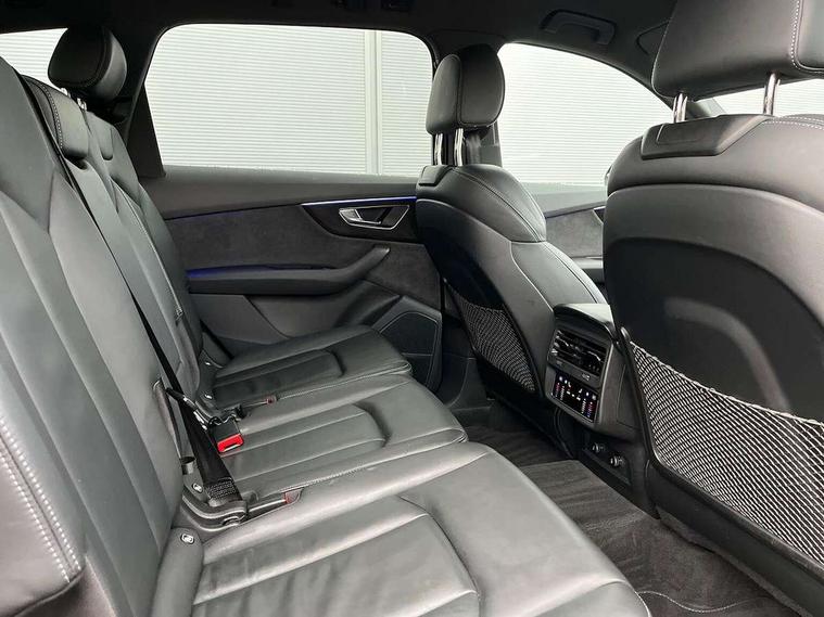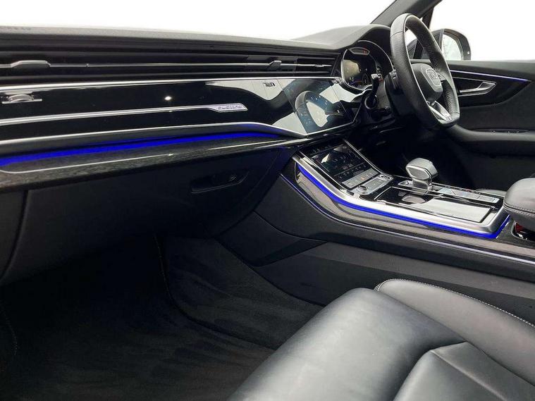 Audi connect safety and service (e-call), Audi connect with Amazon Alexa Integration, Audi drive select (Auto, Comfort, Dynamic, Efficiency, Individual, Off-road and All road), Bluetooth interface, Camera based traffic sign recognition, Electromechanical steering, MMI navigation plus with MMI touch screens includes 10.1" and 8.6" screens with haptic feedback, Natural voice recognition, Parking system plus with 360 degree display (front, rear and side sensors) - acoustic and visual park assist system, Power operated tailgate, Rear view camera, Smartphone interface includes wireless Apple carplay/Android Auto, Start/stop system, 48V Mild hybrid technology, Adaptive air sports suspension, Quattro all wheel drive with self locking centre differential, Audi music interface - front 2 USB-C ports with charger and data functions, Audi sound system with 6 channel amplifier, 180 watt amplifying capacity and 10 loudspeakers including subwoofer, DAB digital radio module, 3rd brake light, Auto dimming frameless rear view mirror, Black roof rails, Bumpers in contrast paint scandium grey finish includes door trim and wheel arch trim strips, inlays in door strip contain quattro embossing, Electrically adj heated/folding + automatically dimming exterior mirrors with memory + automatic kerb side function for passenger side exterior mirror, Heat insulating glass in windshield, Integrated LED indications in door mirrors, LED daytime running lights, LED headlights and high beam assist, LED rear tail lights, Privacy glass - dark tinted rear and rear side windows from B-pillar backwards, Rear side wing doors, Rear wiper, 2 seat bench in 3rd row, 3 seat bench in 2nd row, 4 zone deluxe automatic climate control, 7 seat layout with ISOFIX points for the front passenger seat and rear passenger seat, Black cloth headlining, Comfort front centre armrest, Electric adjustable front seat with 4 way lumbar support, driver memory functionality, Folding rear seats, Front head restraints, Front/rear floor mats, Heated front seats, Illuminated door sill trims with S logo, LED interior ambient lighting, Luggage compartment cover, Luggage compartment sill protection in stainless steel, Rear head restraints, Single front passenger seat, Stainless steel pedals, Sunvisors with illuminated vanity mirrors, Titanium black styling pack - Q7/SQ7, 3 point seatbelts on all rear seats, Audi pre sense front, Child locks on rear doors, Driver and front passenger, front side and curtain airbags, Electromechanical parking brake, Electronic Stabilisation Control (ESC) including ABS, ASR and EDL, Extended pedestrian protection measures, Hill hold assist, Seatbelt monitoring, Tyre pressure loss indicator, Warning triangle and first aid kit, Anti theft alarm, Anti-theft wheel bolts and wheel loosening detection, Keyless Go, Remote central locking, Polished oak trim with grey finish inlay, Tool kit, Tyre repair kit,