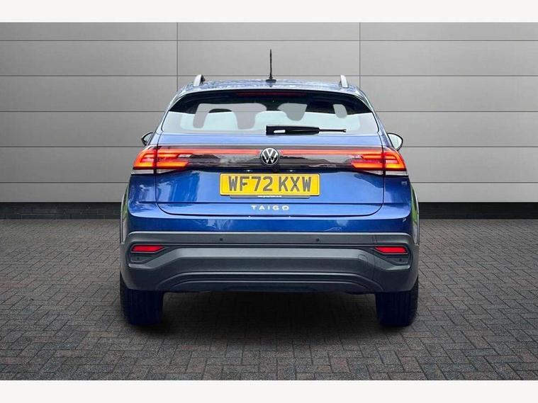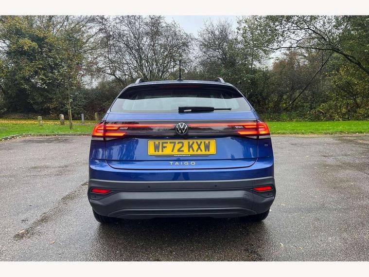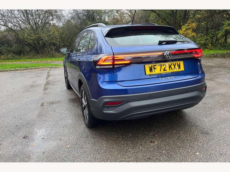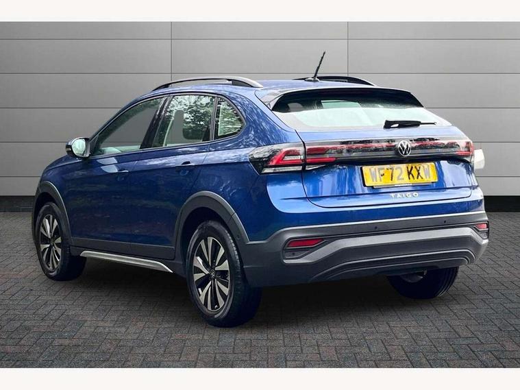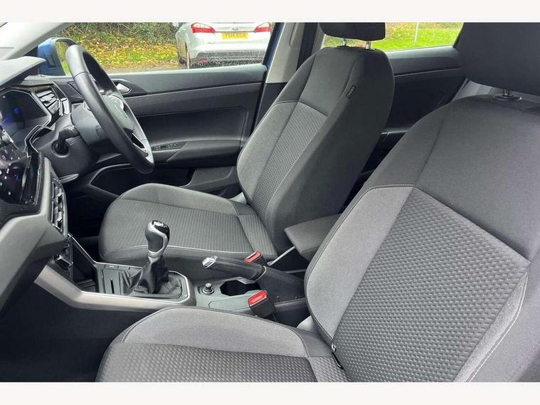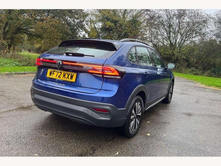 App-Connect including App-Connect Wireless, Driver alert system, e-Call (emergency call), Power Steering, Travel assist including emergency assist, Washer fluid level indicator, Wireless Charging including Bluetooth, Start-stop system with battery regeneration (recuperation - energy recovery during braking), Digital radio reception (DAB+), Diversity antenna for FM reception, WeConnect plus, Ambient lighting with logo projection, Aspherical driver's exterior mirror, Auto headlights, Body coloured bumpers, Body coloured exterior mirror housings and door handles, Electric windows, External USB type C socket and charging sockets, Front fog lamps with cornering function, Headlight range control, Heat insulating glass windscreen, LED headlamps, LED rear combination lamp, LED third brake light, Left convex exterior mirror, Power folding adjustable/heated exterior mirrors and front passenger exterior mirror lowering function, Rear fog light on one side, reversing light on both sides, Rear side wing doors, Rear wash/wipe with intermittent wipe setting, 'Slash/ Austin' Cloth upholstery, 12V socket in centre console, 2 front reading lights, 3 rear head restraints, 3 seat bench in 2nd row, Black carpets, Child seat anchor for child seat system i-Size, 2x top tether and child seat anchor in front on front passenger side, Door and side trim panels in titan black, Driver and front passenger seat height adjustment, Front centre armrest, Handbrake lever handle in leather, Height and reach adjustable steering wheel, Leather trimmed gear knob, Leather wrapped multifunction steering wheel, Luggage compartment floor, Luggage compartment light, Lumbar support for driver's and front passengers seat, Seat covers in titanium black, Single front passenger seat, Split folding backrest with centre armrest and unsplit rear seat bench, Storage compartment under front seats, Sun visors with illuminated vanity mirrors, Chrome Package - Taigo, Drivers assistance pack - Taigo, Light and Sight pack including High beam assist - Taigo, 2 x 3-point seatbelts/outer rear seats with ECE label, 3-point seat belts in front with pretensioner and height adjustment, 3-point seatbelt for centre rear seat, Driver and front passenger airbags with front passenger airbag de-activation, front side and curtain airbags, Driver and front passenger safety-optimised head restraints, Electronic stability control, Extended and predictive pedestrian/ cyclist protection, Front and rear disc brakes, Front curtain and side airbags with center airbag, Hill start assist, Manual rear child locks, Single tone horn, Tyre pressure loss indicator, Anti-theft alarm system with interior monitoring, backup horn, and towing protection, Anti-theft wheel bolts, Lava stone black gloss/matt decorative inserts in dash and front door panels, Low rolling resistance tyres,