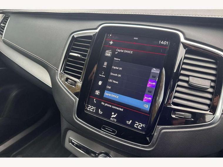 12.3" Active TFT crystal driver's instrument display, 9" centre console portrait touch screen, Adjustable steering wheel force, Bluetooth hands free telephone connection, Drive mode settings, Driver alert control with lane keeping aid, Driver assistance (pilot assist and adaptive cruise control), Driver awareness - Blind spot information system with steer assist, cross traffic alert with autobrake and rear collision warning and mitigation, Emergency call service, Front and rear park assist, Handsfree power tailgate opening and closing, Oncoming Lane Mitigation, Remote engine start, Sensus navigation with European mapping and traffic information, Service interval indicator, Speed limiter, Speed sensitive steering, Trip computer, Voice activated control for key functions, Volvo on call, 8 speed automatic transmission with start/stop + manual change functions, All wheel drive system, Touring chassis, DAB Radio (Digital Audio Broadcasting), Steering wheel remote infotainment controls, Adaptive brake lights with high level LED brake lights, Auto dimming interior + exterior mirrors, Automatic headlight levelling system, Automatic LED Headlights + Active high beam incorporating daytime running lights, Body colour bumpers, Dark tinted windows for rear side windows and cargo area, Dual integrated exhaust pipes with high gloss black surround, Electric folding and heated door mirrors, Front and rear power windows, Heated washer nozzles, High gloss black Deco lower front bumper, High gloss black door mirrors, High gloss black lower rear valance, High gloss black mesh front grille with surround, High gloss black window surround, Home safe and approach lighting, Integrated roof rails in high gloss black, Puddle lights, Rain sensor with automatic windscreen wiper activation, Rear side wing doors, Rear wash/wipe with intermittent wipe setting, Roof antenna, Roof spoiler, Visible VIN plate, 12V socket front tunnel console, rear passenger compartment and cargo area, 2 seat bench in 3rd row, 3 seat bench in 2nd row, A-pillar parking ticket holder, Ambient door and instrument panel lighting, B Pillar ventilation, Bright metal luggage threshold, Cargo divider with grocery bag holder, Centre console cupholders and storage, Charcoal headlining, Driver's side lower dashboard storage compartment, Front and rear door pocket and front cupholder illumination, Front footwell and side step illumination, Front headrests, Front seat cushion extensions, Heated front seats, Height/reach adjustable steering column, Illuminated front and rear tread plates, Illuminated luggage compartment, Illuminated tailgate, Illuminated vanity mirrors + ticket holder, Illumination lockable glovebox compartment, Integrated sun curtains in rear doors, Load protection net, Lower dashboard, tunnel console, Lower door panel in blond, Multicolour theatre lighting, Outboard armrest with cupholder and storage for third row passengers, Power driver seat with multi directional lumbar support and memory for seat and exterior mirrors, Power folding 2nd row headrests, Power passenger seat with multi directional lumbar support and memory, Rear footwell and side step illumination, Rear headrests, Semi automatic load cover, Single front passenger seat, Sports floor mats, Sports leather gear knob, Sports pedals, Underfloor cargo storage, 7 three point seatbelts, City safety includes pedestrian, cyclist and large animal detection and front collision warning with full auto brake, Drivers knee airbag, Dual stage driver/passenger airbags, First aid kit, Front seats SIPS airbags, Hill descent control, Hill start assist, IC (Inflatable Curtains) - Full Length, Passenger airbag cut-off switch, Power parking brake with auto hold function, Road sign information display, Run off Road Mitigation, Run off Road Protection, Seatbelt reminder and pretensioners for all seats, SIPS (Side Impact Protection System), Slippery road and hazard light alert, Stability and Traction Control with Spin control, Engine Drag Control and Corner Traction Control, Tyre pressure monitoring system, Vehicle deceleration control with Anti-lock Brake System, Electronic Brake Distribution and Emergency Brake Assist, Warning triangle, WHIPS whiplash protection system - front, Anti-theft alarm including immobiliser/volume sensor + level sensor, Care key with user defined top speed, Key integrated remote control central locking + fuel flap with deadlocking system and auto open/close power windows, Keyless drive (includes keyless entry and keyless start) with remote tag, Locking wheel nuts, Private locking for glovebox and tailgate, Metal mesh inlays, Tailored Instrument Panel and Door Tops with Contrast Stitching, Tempa spare wheel and jack,