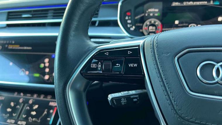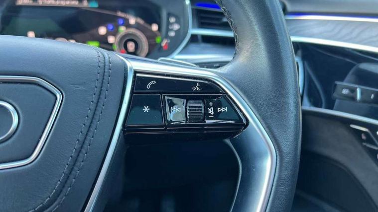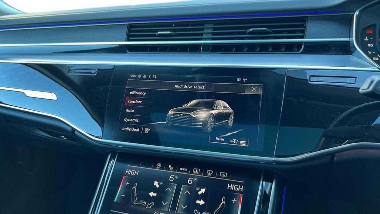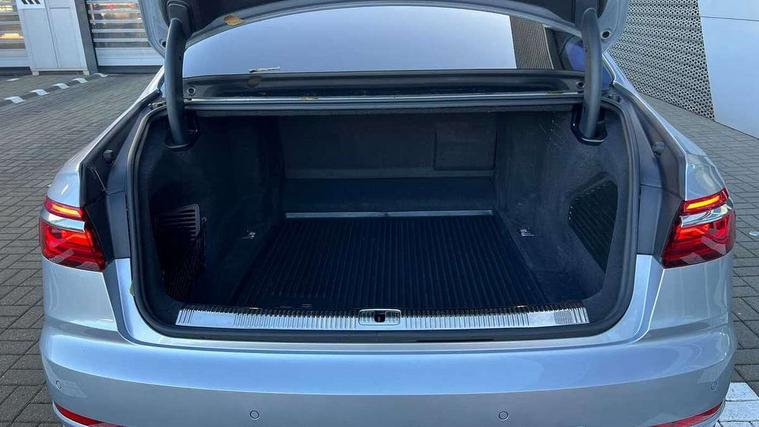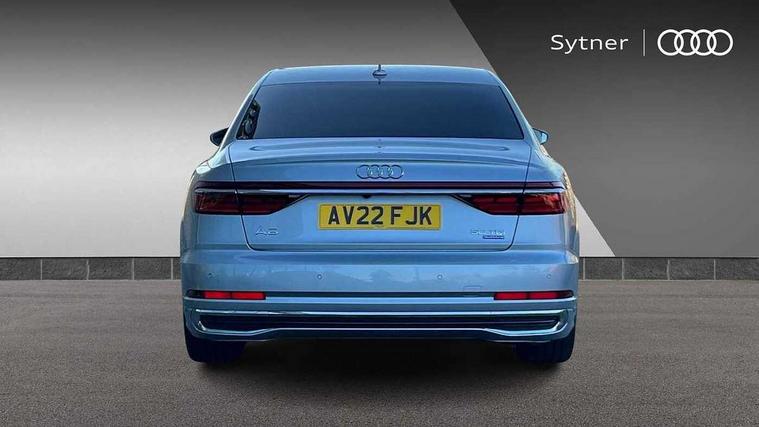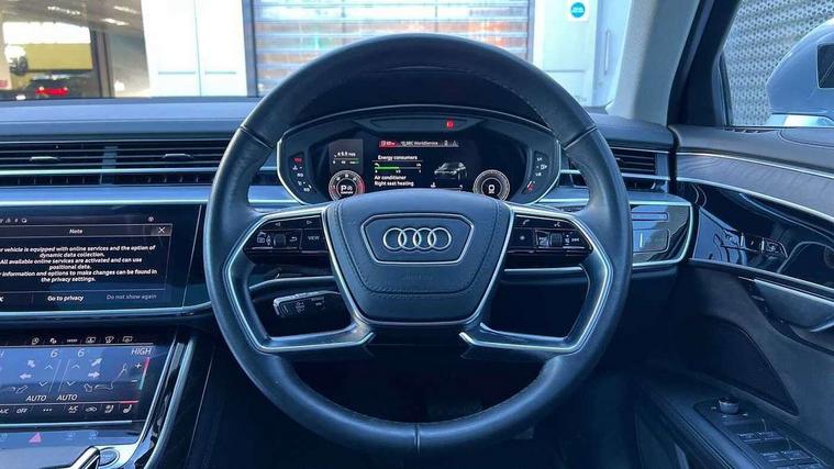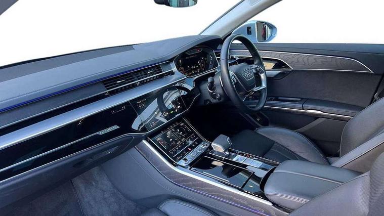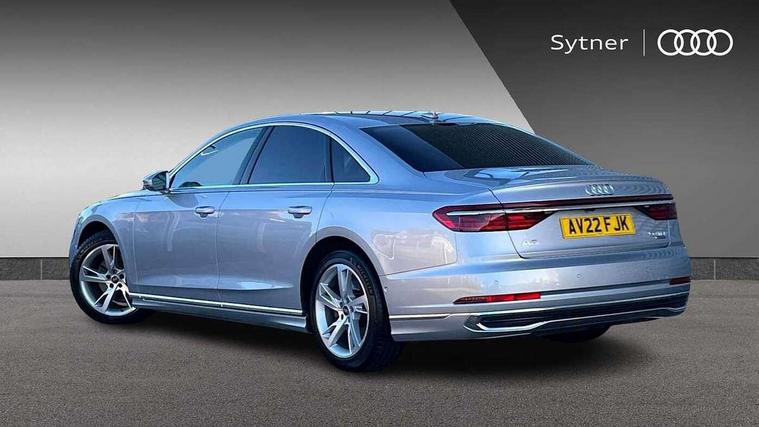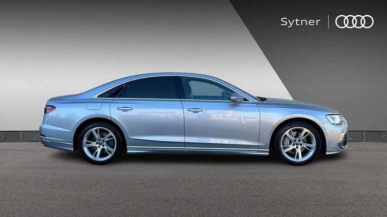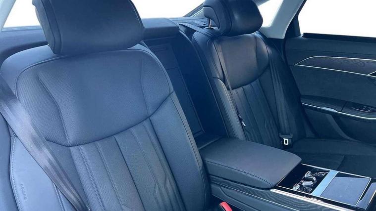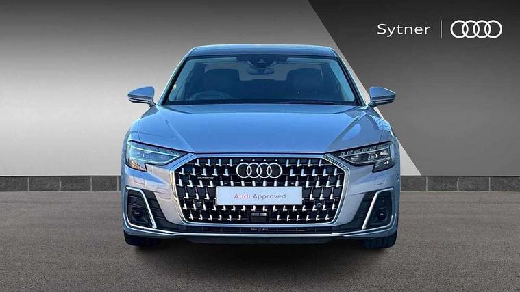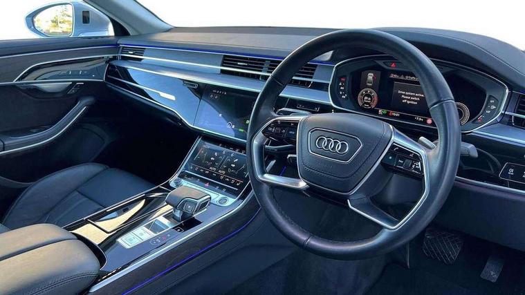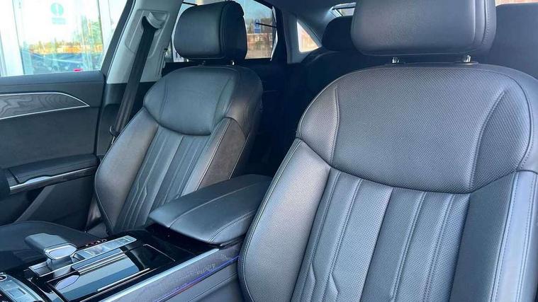 'Lights On' Reminder warning buzzer, 360 degree camera with top view, Adaptive cruise control with cruise assist, emergency assist, efficiency assist, swerve assist, turn assist and speed limiter, Audi connect safety and service (e-call), Audi drive select, Audi phone box with wireless charging, Audi virtual cockpit plus, Audi wireless smartphone interface, Bluetooth interface, Camera based traffic sign recognition, Convenience key, Electro - mechanical power assisted steering, Head up Display, MMI navigation plus with MMI touch + Twin touch screens with haptic feedback, Operating buttons in black, glass look with haptic feedback, Parking assist plus with remote parking, Power door closure, Power operated tailgate, Remote fuel filler release, Service interval indicator, 24 litre AdBlue tank, 48V Mild hybrid technology, 8 speed transmission with hill hold assist, 82 litre fuel tank, Adaptive air suspension, Diesel particulate filter, Quattro all wheel drive with self locking centre differential, Audi music interface, Bang & Olufsen 3D Premium Sound System, DAB digital radio module, DVD System, MMI radio plus, USB connection, Acoustic double glazing, Adaptive windscreen wipers with integrated washer jets, Audi space frame, Auto dimming rear view mirror, Body colour bumpers, Body colour door handles, Body colour exterior mirror housings, Body colour side protection with aluminium trim strips, Digital matrix LED headlights with highbeam assist, static cornering light, all weather lights, automatic dynamic headlight range control, Dynamic front and rear indicators, Electric front windows, Electric rear windows with isolation switch, Electrically adjustable heated folding + automatically dimming exterior mirrors with memory function and integrated LED indicators, Headlight cleaning system, Heat insulating glass in side and rear windows, Heat insulating glass windscreen, Heated rear window, Heated windscreen washer jets, High beam assist, LED brake lights, LED daytime running lights, OLED rear lights with specific rear light signature 1, Panoramic sunroof, Privacy glass, Rear boot, Rear side wing doors, Side skirts, Third brake light, 12V socket, 2 zone automatic air conditioning, 3 seat rear bench with centre armrest in 2nd row, 4 way electric lumbar support for driver and front passenger, Centre console with cupholders, Comfort centre armrest, Door armrest with storage, Door pockets with bottle holder, Driver and front passenger side sunvisors with illuminated vanity mirrors, Dust/pollen filters, Electric front seats with memory function, Front floor mats, Glove compartment cooling, Heated front seats, Height/reach electric steering column with easy exit function, Isofix child seat mounting points on outer rear seats, Leather gearknob, Massage and ventilation function for front seats, Passenger footwell storage net, Reading lights, Rear floor mats, Rear headrests, Roof mounted sunglasses holder, Silver cloth headlining, Single front passenger seat, Valcona leather upholstery with contour comfort front seats, Chrome exterior pack - A8, City assist pack - A8, Extended leather pack - A8, Extended LED Interior multi coloured light pack - A8, High gloss styling pack - A8, 3 point seatbelts on all rear seats, ABS/EBD, Active front headrest system, ASR traction control, Audi pre sense basic, Audi pre sense front, Driver/Front Passenger airbags, EDL traction control, Electromechanical parking brake, ESP, Extended pedestrian protection measures, Front and rear side airbags with head airbag system, Front brake discs, callipers painted black, Front passenger airbag deactivation, Rear brake discs, callipers painted black, Rear child proof door locks, Seatbelt reminder + electric contact in buckle + advanced safety equipment, Tyre pressure loss indicator, Warning triangle and first aid kit, Anti theft alarm tow away protection, Anti-theft wheel bolts and wheel loosening detection, Remote central locking, Dark matt brushed aluminium lower inlays, 19" 5 spoke blade design alloy wheels,