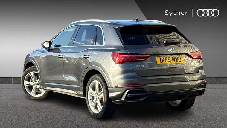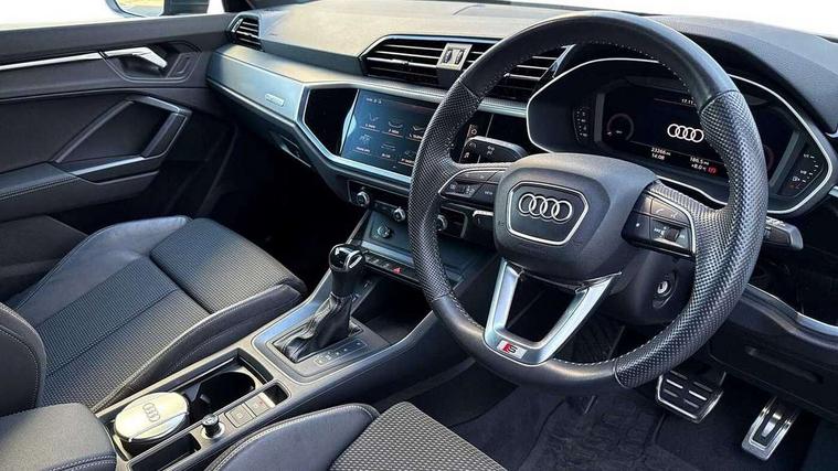 Audi connect safety and service (e-call), Audi drive select, Audi lane departure warning, Audi side assist, Audi smartphone interface, Audi Virtual Cockpit - 10.25" display, Bluetooth interface, Camera based traffic sign recognition, MMI navigation plus with MMI touch, Power opening/closing tailgate, Progressive steering, Rear parking sensors, Service interval indicator, Stop/start system, Voice control system, Sports suspension, 1 x USB type C and 1 USB type A charging points, 6 speakers, DAB digital radio module, Acoustic windscreen, Aluminium roof rails, Aluminium window trim, Auto dimming rear view mirror, Body coloured bumpers, Diffuser in matt Platinum grey, Electrically adjustable and heated door mirrors with integrated LED side indicators, Front and rear electric windows, Front fog lights, Front side air inlets in matt platinum grey, Front spoiler blade in matt platinum grey, Grille vertical bars in aluminium silver/Matt, High gloss black finish B and C pillars, LED headlights with LED daytime running lights and dynamic rear indicator, LED rear lights, Privacy glass, Rain and light sensors, Rear diffuser strip in matt titanium black, S Line badge on wings, S Line front and rear bumpers, Side skirt insert in matt Platinium grey, Titanium black radiator grille, 12V socket in rear centre console, 40:20:40 split folding rear bench seat, Adjustable rear seat bench/backrest with centre armrest and cupholder, Aluminium door sill trims, Black cloth headlining, Dual zone climate control, Front and rear black floor mats with contrast stitching in rock grey, Front and rear headrests, Front and rear roof module including reading lights, Front centre armrest with storage compartment and angle adjustment, Glove compartment lighting, Height and reach adjustable steering wheel, Illuminated door sill trims with S logo, ISOFIX child seat mounting and Top Tether with front passenger airbag deactivation, Luggage compartment light, Manual front seats with height adjustment, Perforated leather gearknob, Stainless steel luggage compartment sill finisher, Stainless steel pedals, Non smoking pack - Q3, 3x3 point rear seatbelts, 6 airbags - Driver, front passenger, curtain and side windows, Audi pre-sense front with pedestrain and cyclist recognition, Electrically operated child locks on rear doors, Electromechanical parking brake, Electronic stabilisation control including ABS, ASR and EDL, Hill descent control, Hill hold assist, Pre sense basic, Seatbelt monitoring, Tyre pressure warning, Warning triangle and first aid kit, Anti theft alarm, Anti theft wheel bolts, Remote central locking, Dark matt brushed aluminium inlay, MMI touch colour display in gloss black with aluminium surround, Tool kit, Tyre repair kit,
