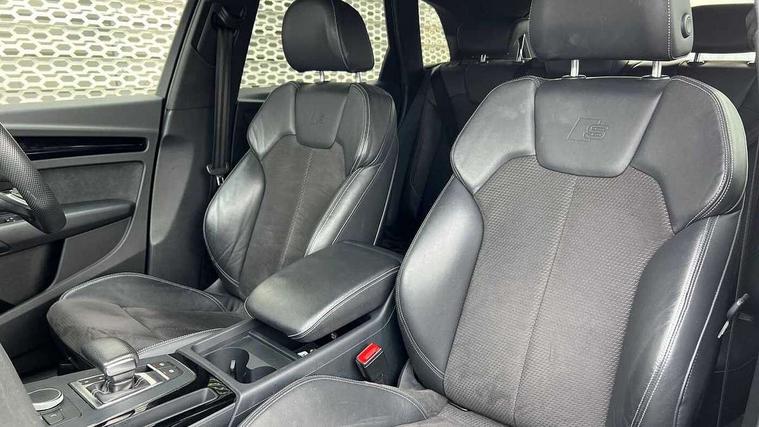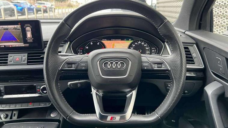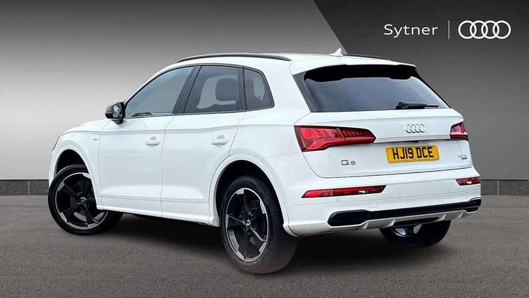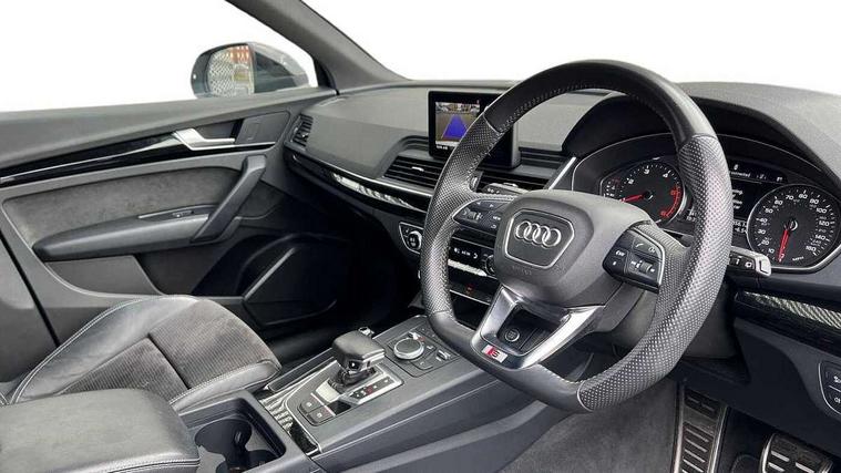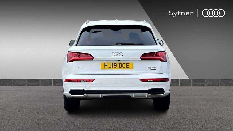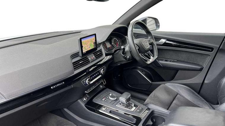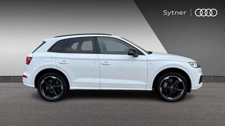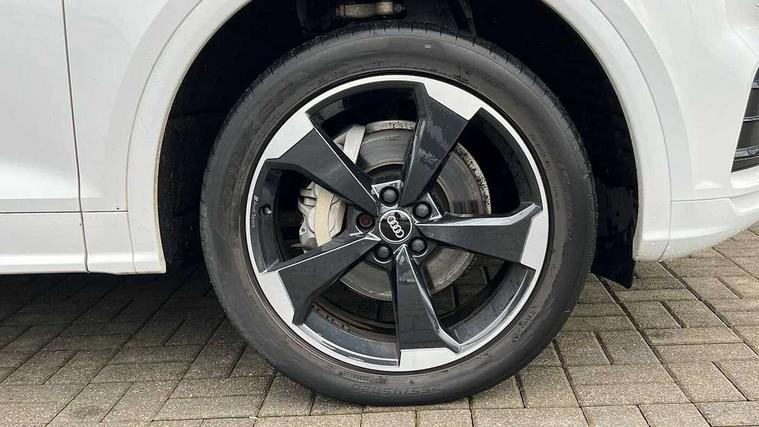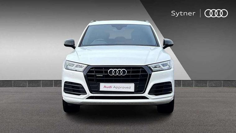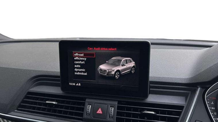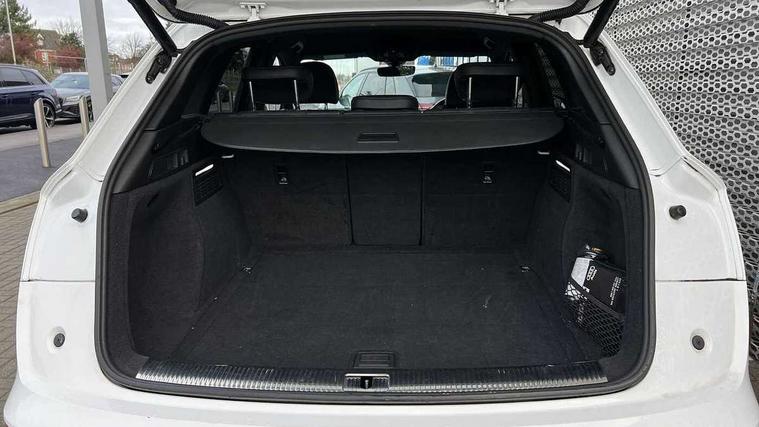 7" Colour driver information system, Audi connect infotainment services, Audi connect safety and service (e-call), Audi drive select, Audi parking system plus with front and rear sensors, Audi smartphone interface, Automatic start-stop system with coasting functionality and efficiency programme, Electro - mechanical power assisted steering, MMI Navigation, Mobile telephone preparation - bluetooth interface, Power tailgate, Service interval indicator, Voice control system, Diesel particulate filter, Dynamic suspension, Quattro on demand, 2x SD card slot, CD player, DAB Digital radio, MMI radio plus with 7" colour MMI screen and MMI controller, Acoustic windscreen, Air inlets in matt titanium black with blades in matt aluminium silver, Auto dimming rear view mirror, Automatic headlight levelling, Black roof rails, Body colour bumpers, Body colour rear diffuser with matt aluminium silver surrounds, Body colour underbody protection, Chrome exhaust tailpipe, Electric adjustable/heated/folding door mirrors, Front and rear electric windows, High beam assistant, LED headlights with LED rear lights + dynamic rear indicators, Light and rain sensor for auto activation of lights and windscreen wipers, Loading sill protector in stainless steel, Privacy glass with front acoustic glazing, Rear wiper, Titanium black door mirror housings, 2 x USB charging port with aux input socket, 3 rear headrests, 3 spoke flat bottom high multi-function leather steering wheel, 3 zone climate control, 40:20:40 split folding rear seat with rear centre armrest, Black cloth headlining, Contrast stitching on seats, steering wheel and gear lever gaiter, Front centre armrest, Front sports seats, Front/rear floor mats, Heated front seats, Height adjustable front head restraints, Height/reach adjustable steering column, ISOFIX child seat mounting and top tether, Luggage compartment carpet, Manual seat adjustment with 4-way electric lumbar support, Perforated leather gearknob, Removable luggage compartment floor, Stainless steel pedals, Sunvisors with vanity mirrors, Tool kit, Trunk roller cover, LED interior light pack - Q5, Non Smokers pack, Titanium black styling pack - Q5, 3 point seatbelts on all seats, 6 airbags - Driver, front passenger, curtain and side airbags, Electromechanical parking brake, Electronic stabilisation control including ABS, ASR and EDL, Front passenger airbag deactivation, Hill descent control, Hill hold assist, Multi collision brake assist, Pop-up bonnet for pedestrian protection, Pre sense city, Seat belt force limiter, Seatbelt monitoring, Tyre pressure warning, Warning triangle and first aid kit, Anti theft alarm, Anti-theft wheel bolts, Keyless Go access/ignition system, Remote central locking, Black piano finish inlays, 20" 5 arm rotor design sport alloy wheels in gloss anthracite black, diamond cut finish,