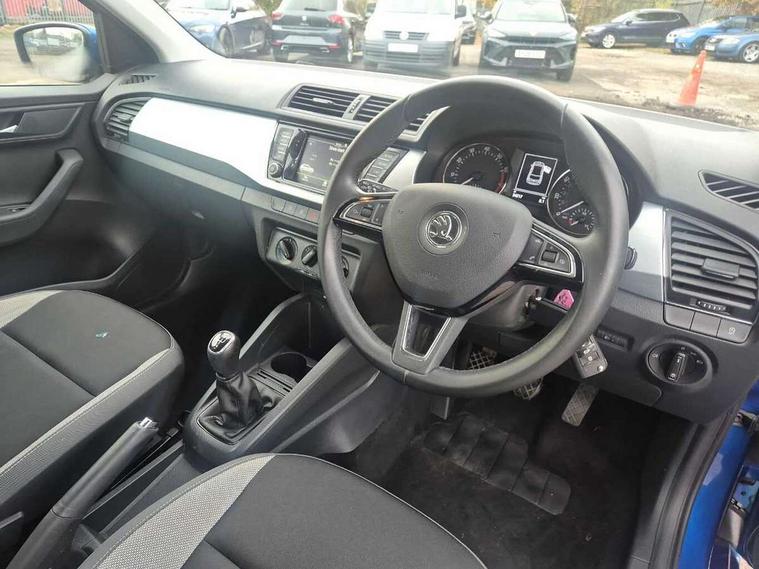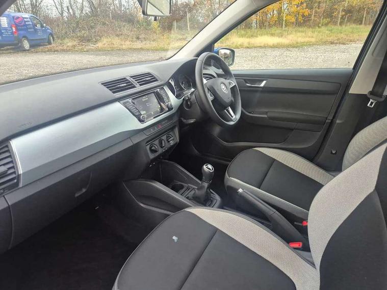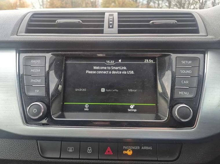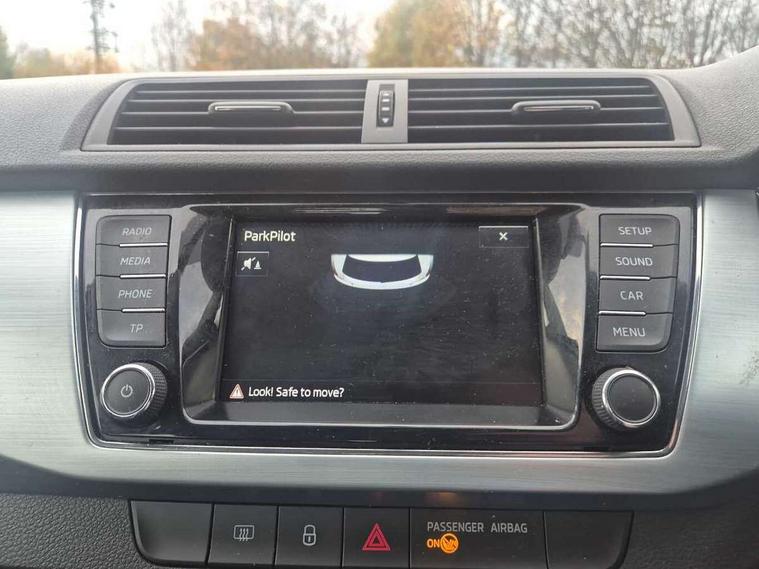 Bluetooth system, Exterior temperature gauge, Front assistant collision mitigation, Maxi dot trip computer, PAS, Service interval indicator, SmartLink, Auxiliary socket for external MP3 player, Bolero radio with telephone control, Mirror Link, USB and SD card, DAB Digital radio, Body colour bumpers, Body colour door handles, Chrome grille surround, Electric front windows, Electrically adjustable and heated door mirrors, Heated rear window, Height adjustable headlamps, Intermittent rear wash/wipe, Tinted rear windows, Tinted windscreen, 1.5L bottle holder in front door panels, 2 height adjustable rear headrests, 60/40 split folding rear seat, Boot stowage box, Cargo area storage tray, Driver + passenger vanity mirrors, Folding grab handles, Front reading lights, Height adjustable driver's seat, Height adjustable front headrests, Height adjustable passenger seat, Height/reach adjust steering wheel, Interior light with delay, Leather gearshift, Leather handbrake, Lower glovebox cover, Luggage load hooks, Parcel shelf, Pollen filter, Rear courtesy light, Rear storage trays, Storage compartment under front seats, Ticket holder, Two rear outer seat isofix location points, Arkamys surround sound pack - Fabia, Chrome Pack - Fabia, 3x3 point rear seatbelts, ABS, Curtain airbags, Driver and passenger airbags, Driver and passenger side airbags, EDS, ESC with ASR, Front seatbelt pretensioners, Hydraulic Brake Assist (HBA), Passenger airbag deactivate switch, Seatbelt warning, Tyre pressure monitor, Alarm with interior monitoring, Immobiliser, Locking wheel bolts, Remote central locking,