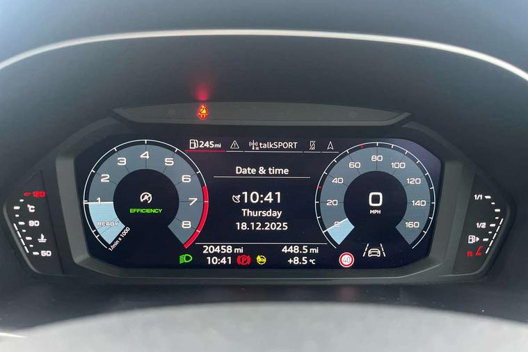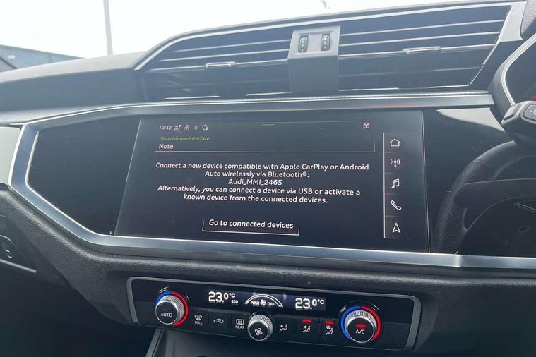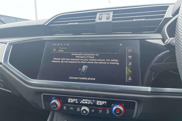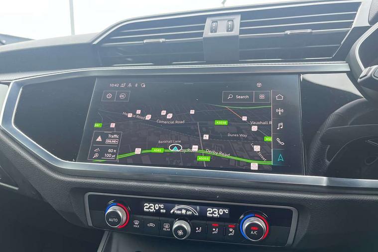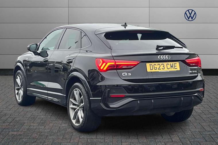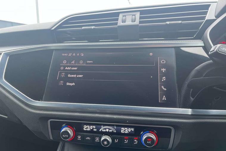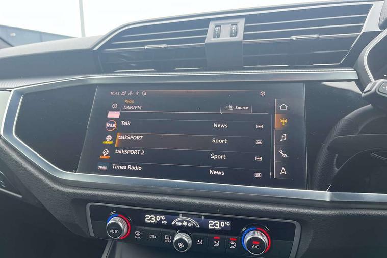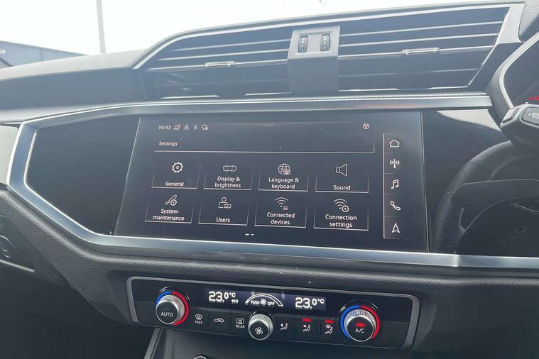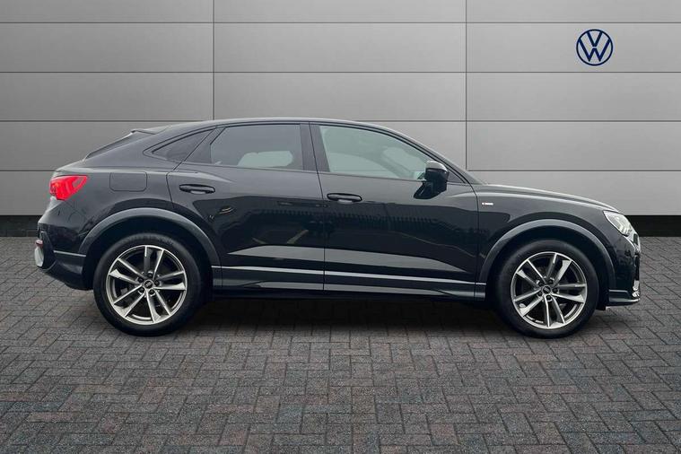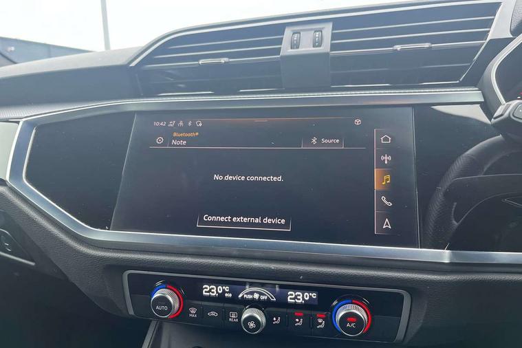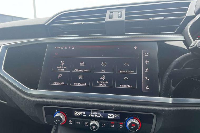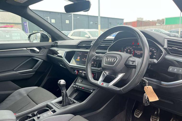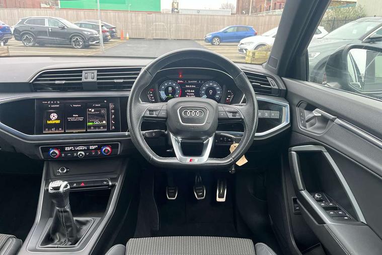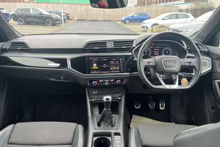 Amazon alexa Integration, Audi drive select, Audi lane departure warning, Audi Virtual Cockpit - 10.25" display, Bluetooth interface, Camera based traffic sign recognition, Cruise control + speed limiter, Legal emergency call, MMI Navigation Plus with high resolution 10.1 inch touchscreen colour display, Power operated tailgate, Progressive steering, Rear parking sensors, Service interval indicator, Smartphone interface includes wireless Apple carplay/Android Auto, Start stop system with recuperation, Voice control system with natural language interaction, Sports suspension, 2 USB-C ports with charge and data functions, 6 passive loudspeakers, DAB digital radio module, Acoustic windscreen, Auto dimming frameless rear view mirror, Black roof rails, Electrically folding, adjustable and heated door mirrors with integrated LED side indicators and kerb view function for passenger side, Front and rear electric windows, Front fog lights, Grille vertical bars in aluminium silver/Matt, High gloss black finish B and C pillars, LED Dynamic rear indicators, LED headlights with LED daytime running lights, LED rear lights, LED third brake light, Privacy glass dark tinted rear and rear-side windows (from B-pillar backwards), Rain and light sensors, Rear diffuser grille in grained matt black, Rear diffuser strip in matt anthracite black, Rear side wing doors, Rear wiper, S line bumpers in contrasting Manhattan grey, Variable front intermittent wipers, 12V socket in rear centre console, 3 seat bench in 2nd row, 3 spoke flat bottomed multi-function leather sport steering wheel, 40:20:40 folding with manual adjustment for 60:40 forwards/backwards position and backrest angle, Adjustable rear seat bench/backrest with centre armrest and cupholder, Black cloth headlining, Dual zone electronic climate control, Front and rear black floor mats with contrast stitching in rock grey, Front and rear headrests, Front and rear roof module including reading lights, Front centre armrest, Glove compartment lighting, Height and reach adjustable steering wheel, Illuminated door sill trims with S logo, ISOFIX child seat mounting for front passenger with airbag deactivation and outer rear seat including top tether attachment point for outer rear seats, Luggage compartment light, Manual front seats with height adjustment, Perforated leather gearknob, Single front passenger seat, Stainless steel luggage compartment sill finisher, Stainless steel pedals, Ambient lighting pack - Q3, Black styling pack - Q3, Non smoking pack - Q3, 3x3 point rear seatbelts, 6 airbags - Driver, front passenger, curtain and side windows, Audi pre-sense front with pedestrain and cyclist recognition, Electrically operated child locks on rear doors, Electromechanical parking brake, Electronic stabilisation control including ABS, ASR and EDL, Front seatbelt reminder, Hill descent control, Hill hold assist, Pre sense basic, Seatbelt monitoring, Tyre pressure warning, Warning triangle and first aid kit, Anti theft alarm, Anti theft wheel bolts, Immobiliser, Remote central locking, Aluminium look interior elements, Detail dashboard around MMI touch colour display in glass look, black with surround in aluminium look, Leatherette door armrest, Piano black inlay, 19" 5 twin arm design diamond cut audi sport alloy wheels in matt grey look,