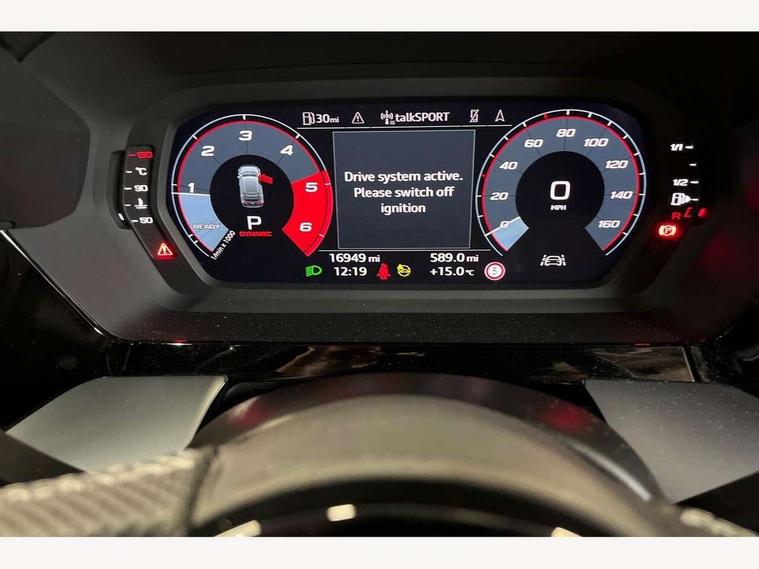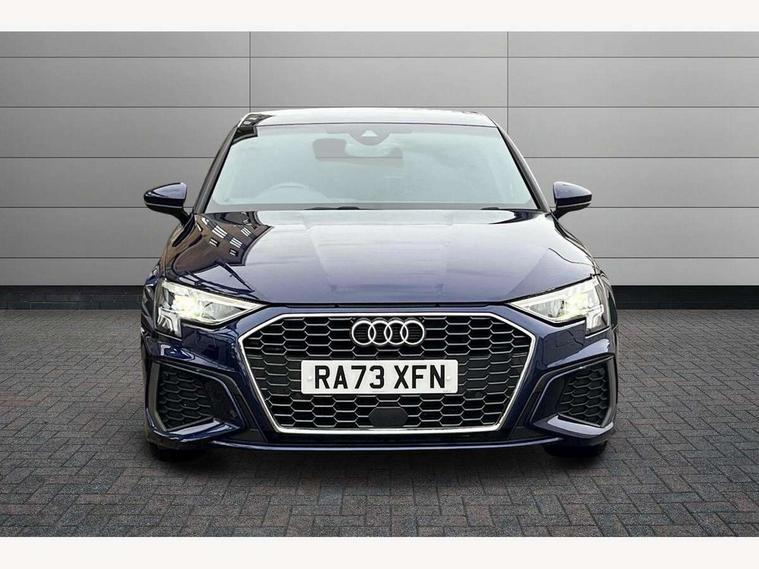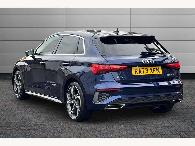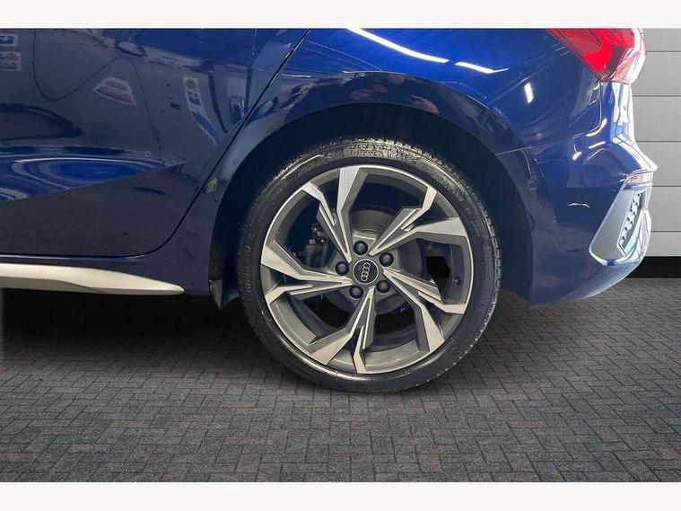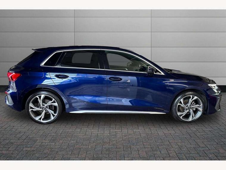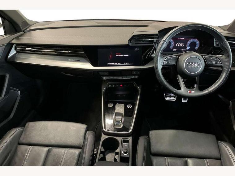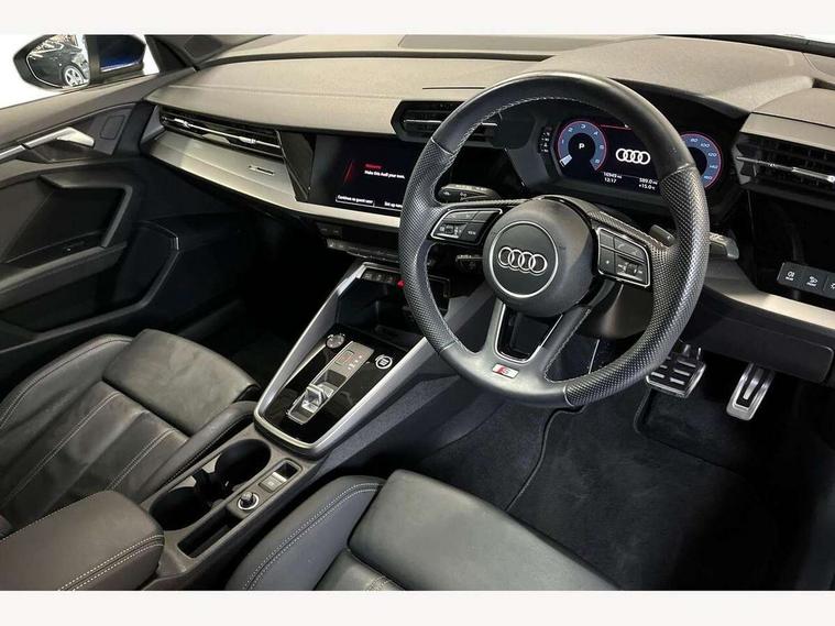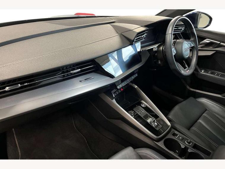 Audi drive select (Auto, Comfort, Dynamic, Efficiency and Individual), Audi smartphone interface, Audi Virtual Cockpit - 10.25" digital and colour instrument cluster, Automatic start/stop system with recuperation, Bluetooth interface, Camera based traffic sign recognition, Collision avoidance assistant, e-Call (emergency call), Electromechanical power speed sensitive steering, Lane departure warning system, MMI Navigation Plus with high resolution 10.1" colour touch screen display, Service indicator, Trip computer, Voice control system with natural language interaction, Sports suspension, 2xUSB-C connection with data and charging functions, 6 passive loudspeakers, DAB Digital radio, 3rd brake light, Acoustic glass windscreen, Aluminium window trim, Auto dimming frameless rear view mirror, Body colour exterior mirrors, Electrically adjustable/heated/folding/dimming door mirrors with kerb view includes integrated LED indications + kerb view function for passenger side, Front electric windows, Illuminated door sills with aluminium inserts at the front with S logo, LED daytime running lights, LED headlights with LED rear lights and dynamic rear indicators, Light and rain sensors, Privacy glass - dark tinted rear window, rear door and side windows, Rear electric windows, Rear side air outlets in grained matt black, Rear side wing doors, Rear wiper, S line bumpers, S roof spoiler, 12V socket and storage compartment in front centre console, 3 seat bench in 2nd row, 3 spoke leather multifunction steering wheel with paddle shift, 4 way electrically adjustable lumbar support for driver and front passenger, 60/40 split folding rear seat bench, Black cloth headlining, Dual zone electronic climate control, Front and rear centre armrest in artificial leather, Front and rear headrests, Front/rear floor mats, Height and reach adjustable steering wheel, Interior lighting - glove compartment light and right hand side, Luggage compartment floor covering, Manual boot compartment lid, Manually adjustable front seats, Seat side bolsters, Single front passenger seat, Stainless steel pedals and front footrest in black, Twin leather upholstery with front sports seats S embossed logo, Aluminium interior elements pack - A3 Sportback, LED interior lighting pack - A3 Sportback, S line styling pack - A3 Sportback, 3x3 point rear seat belts, Driver and front passenger airbag with passenger airbag deactivation, Electronic Stabilisation Control (ESC) including ABS, ASR and EDL, First aid kit with warning triangle and 2 safety vests, Front side airbags with head airbags and interaction airbag, Pre-sense front with pedestrian and cyclist detection, Seatbelt monitoring, Tyre pressure loss indicator, Anti theft alarm, Anti-theft wheel bolts, Electronically operated child locks, Immobiliser, Remote control central locking, Dark spectrum aluminium inlays, accent surfaces in the dashboard and centre console in platinum grey silk effect paint finish,