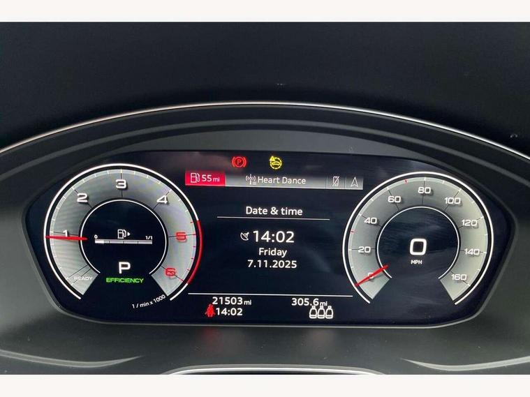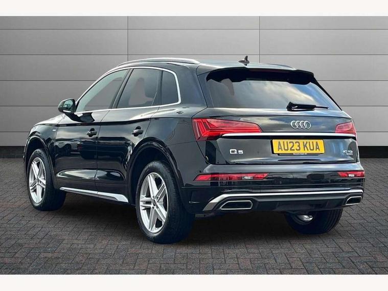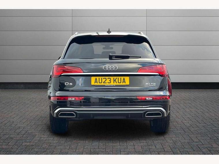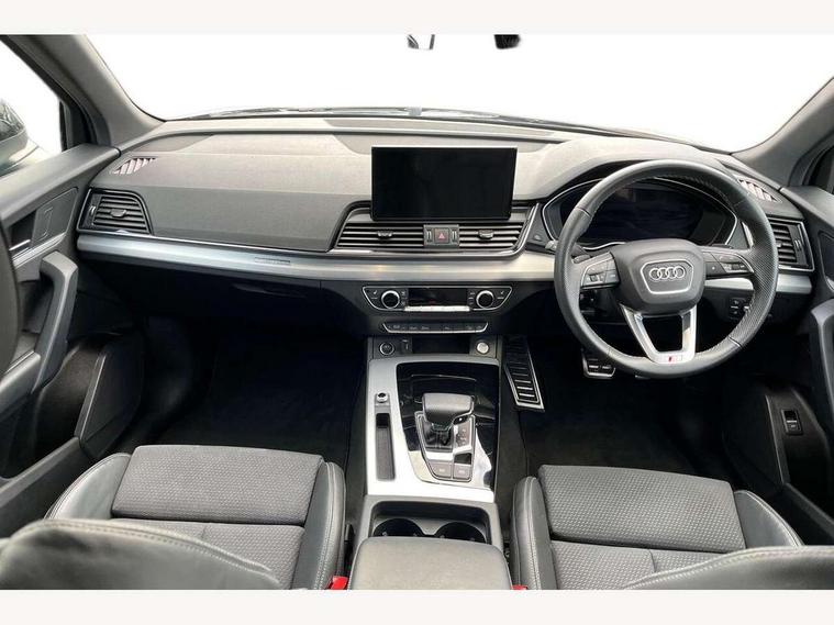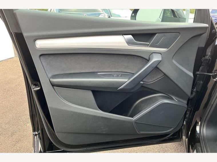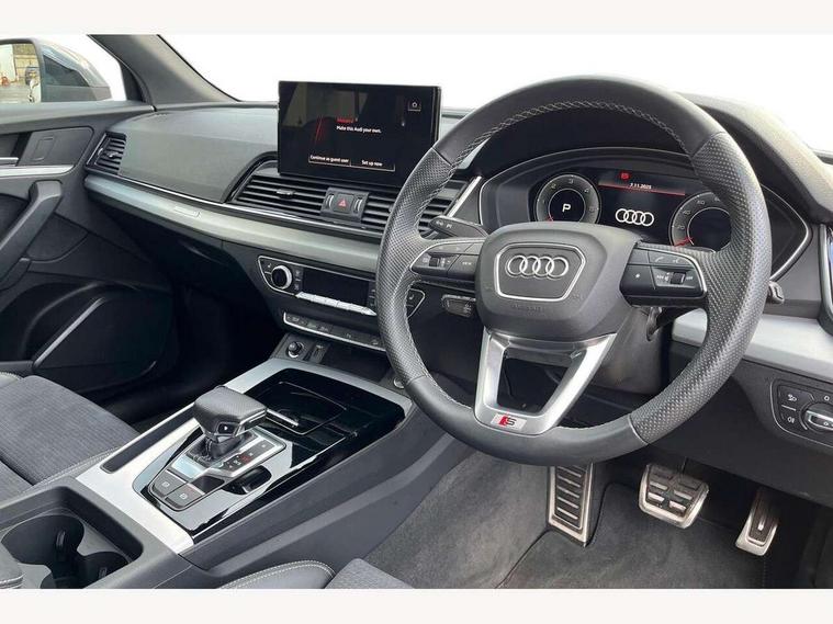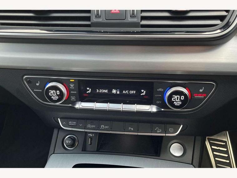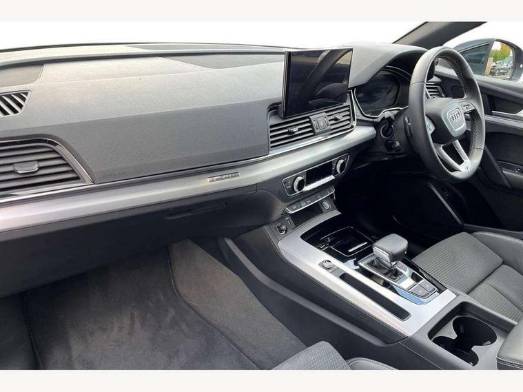 Acoustic front and rear parking sensor, Audi connect safety and service (e-call), Audi connect with Amazon Alexa Integration, Audi drive select, Audi virtual cockpit plus with 12.3" screen and three different layout designs, Audi wireless smartphone interface, Automatic start-stop system with coasting functionality and efficiency programme, Bluetooth interface, Electro - mechanical power assisted steering, MMI navigation plus with 10.1" touch screen, Power tailgate, Reversing camera, Service interval indicator, Voice control system with Audi hotword activation "Hey Audi", Diesel particulate filter, Quattro on demand, S line sports suspension, 2 x USB charging port with aux input socket, 8 loudspeakers, DAB Digital radio, Acoustic windscreen, Aluminium roof rails, Audi matrix LED headlights with dynamic front and rear indicators, Auto dimming door mirrors, Auto dimming frameless rear view mirror, Automatic headlight adjustment, Automatic headlights and windscreen wipers, Body colour bumpers, Body colour door mirrors, Body colour rear diffuser with matt aluminium silver surrounds, Body colour underbody protection, Chrome plated exhaust trims, Daytime running lights, Door sills in Selenite silver, Electric adjustable/heated/folding door mirrors, Front air inlet surrounds in aluminium, Front and rear electric windows, Front radiator grille in honeycomb design, Headlight washers, High level LED brake light, Lower bumpers painted in contrast Manhattan grey, Rear chrome trim strip below lights, Rear privacy glass and rear side windows, Rear side wing doors, Rear wiper, Roof bars, S Line badges on the front wings, S Line front and rear bumpers, S Line rear spoiler, S Line side skirts, 3 rear headrests, 3 spoke leather multifunction steering wheel with S badging perforated leather grips, 40:20:40 split folding 3 rear bench seat in 2nd row with rear centre armrest, Black cloth headlining, Comfort front centre armrest, Contrast stitching on seats, steering wheel and gear lever gaiter, Deluxe 3 zone electronic climate control, Front/rear floor mats, Gear lever in black leather, Heated front seats, Height adjustable front head restraints, Height/reach adjustable steering column, Illuminated door sill trims with S logo, Luggage compartment cover, Manual seat adjustment with 4-way electric lumbar support, Removable luggage compartment floor, Single front passenger seat, Stainless steel pedals, Sunvisors with vanity mirrors, High gloss pack - Q5, LED interior light pack - Q5, 3 point seatbelts on all seats, 6 airbags - Driver, front passenger, curtain and side airbags, Electrically operated child locks on rear doors, Electromechanical parking brake, Electronic stabilisation control including ABS, ASR and EDL, First aid kit with warning triangle and vests, Front passenger airbag deactivation, Hill descent control, Hill hold assist, ISOFIX child seat mounting for front passenger seat and ISOFIX child seat mounting with Top Tether for outer rear seats, Multi collision brake assist, Pop-up bonnet for pedestrian protection, Pre sense city, Seat belt force limiter, Seatbelt monitoring, Tyre pressure warning, Anti theft alarm, Anti-theft wheel bolts, Keyless Go access/ignition system, Remote central locking, Air vents inserts and centre console in gloss black, Matt brushed aluminium inlays,