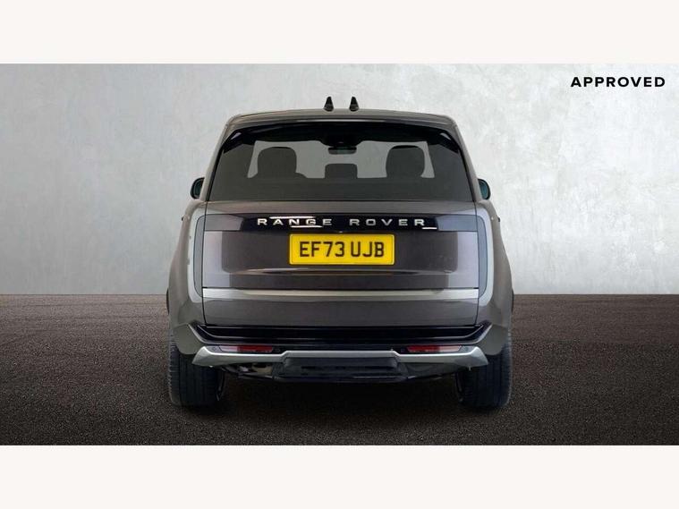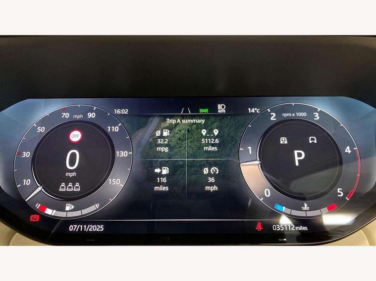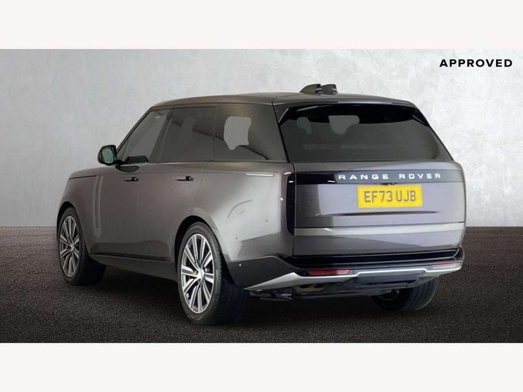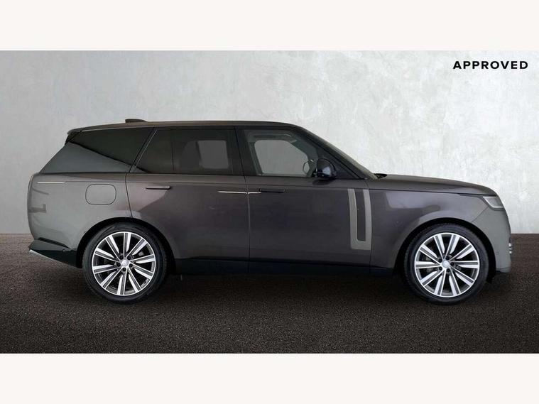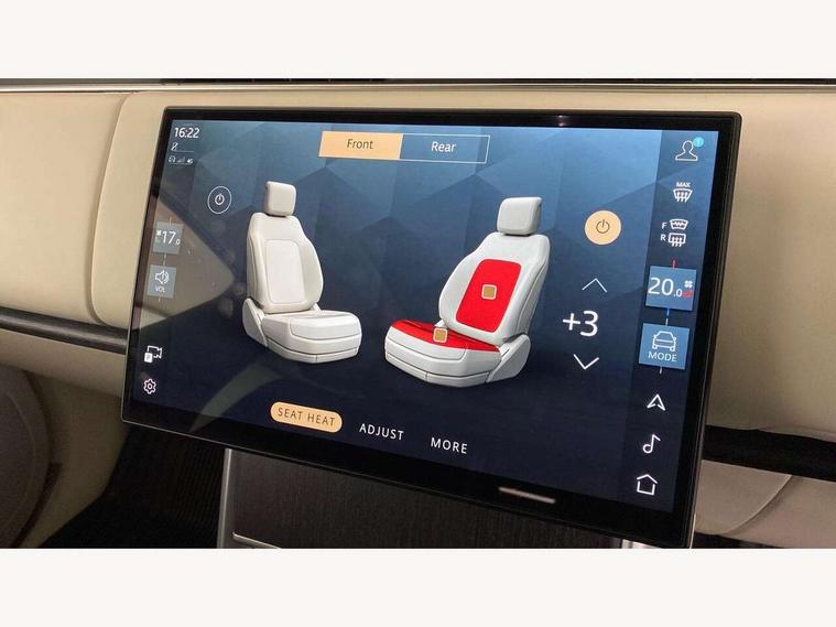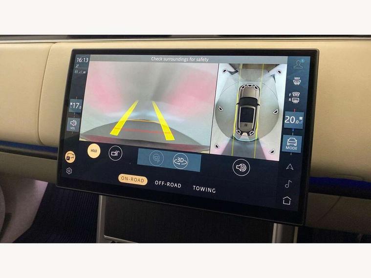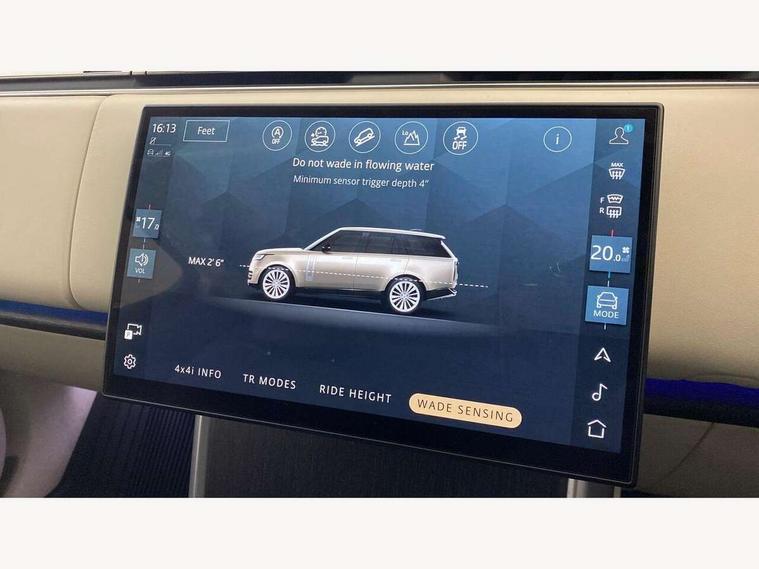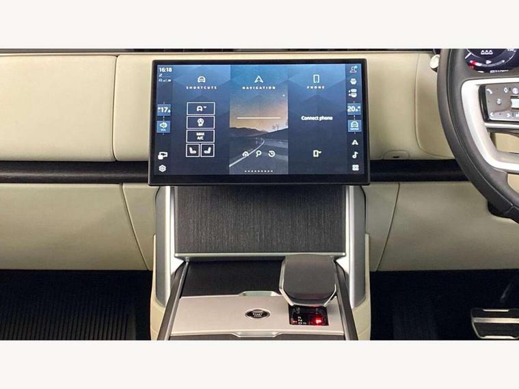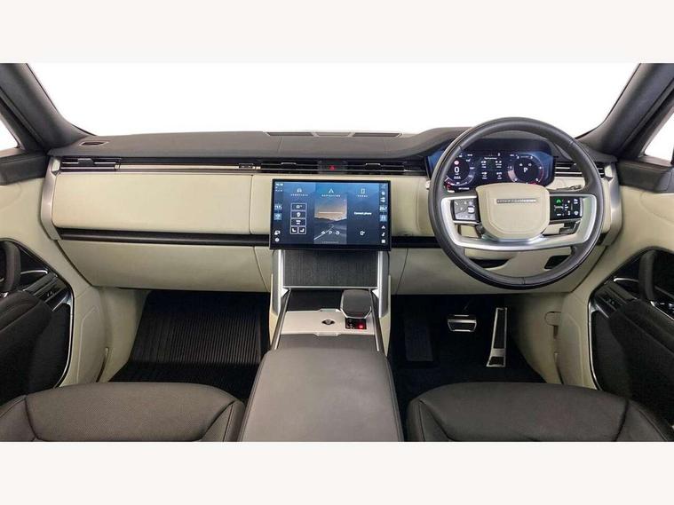 13.1" Touchscreen, 3D surround camera inc frwd traffic detection, vehicle clearance guidance, 3D view, clearsight ground view, manoevure light, 360 parking aid, wade sensing, All Terrain Info Centre, All wheel steering, Android Auto, Apple car play, Blind spot assist, Bluetooth connectivity streaming, Driver condition response, Eco mode, Electric power assisted steering (EPAS), Emergency call service, Front and rear parking aid, Interactive driver display, Lane keep assist, Rear collision monitor, Rear traffic monitor, Remote, Traffic sign recognition with adaptive speed limiter, Wi-Fi Enabled with data plan, Wireless device charging with phone signal booster, 8 speed automatic transmission, Active damper technology system, Adaptive dynamics, All terrain progress control, All Wheel Drive (AWD), Automatic access height, Terrain Response 2 Auto, Twin speed transfer box, Digital Audio Broadcast radio-DAB, Pivi pro including smart settings, Connected navigation pro, nuance speech, USB socket, Acoustic laminated windscreen, Animated directional indicators, Automatic headlights, Automatic levelling headlights, Centre high mounted stop light, Electric windows with one touch open/close and anti trap, Engine cover, Flush deployable exterior door handles, Front and rear recovery eyes, Front fog lights, Headlamp power wash, Heated rear window, Heated washer jets, LED tail lights, No badges, Power fold, auto-dimming, heated door mirrors with approach lights, Rain sensing windscreen wipers, Rear boot, Rear fog lights, Rear side wing doors, Side repeater indicators in mirror, Trailer stability assist, Winter wiper park position, 12V power sockets, 3 seat bench in 2nd row, Air quality sensor, Bright metal pedals, Cabin lighting, Customer configurable single point entry, Driver and passenger front seat armrests, Easy boot loading, Ebony Carpet, Front and rear cupholders, Front and rear grab handles, Front head restraints, Gearshift paddles, Heated steering wheel, Hook in load space, Loadspace light, Luggage tie down in loadspace, Multifunction steering wheel, Rear centre armrest, Rear head restraints, Rear ISOFIX, Single front passenger seat, Twin blade sunvisors with Illuminated vanity mirrors, Upper and lower glovebox, Online pack with data plan - Range Rover, 3x3 point rear seat belts, Anti-lock braking system (ABS), Brake hold function, Cornering brake control (CBC), Customer configurable autolock, DSC - Dynamic Stability Control, Electronic brake force distribution, Electronic parking brake, Electronic traction control, Emergency brake assist, Emergency braking, Front airbags with passenger seat occupant detector, Front side airbags, Hill descent control, Hill launch assist, Low traction launch, Occupant protection assist, Power operated child locks, Roll stability control, Tyre pressure monitoring system (TPMS), Immobiliser, Intrusion sensor and alarm, Keyless entry, Locking wheel nuts, Remote central locking, Noble chrome controls,