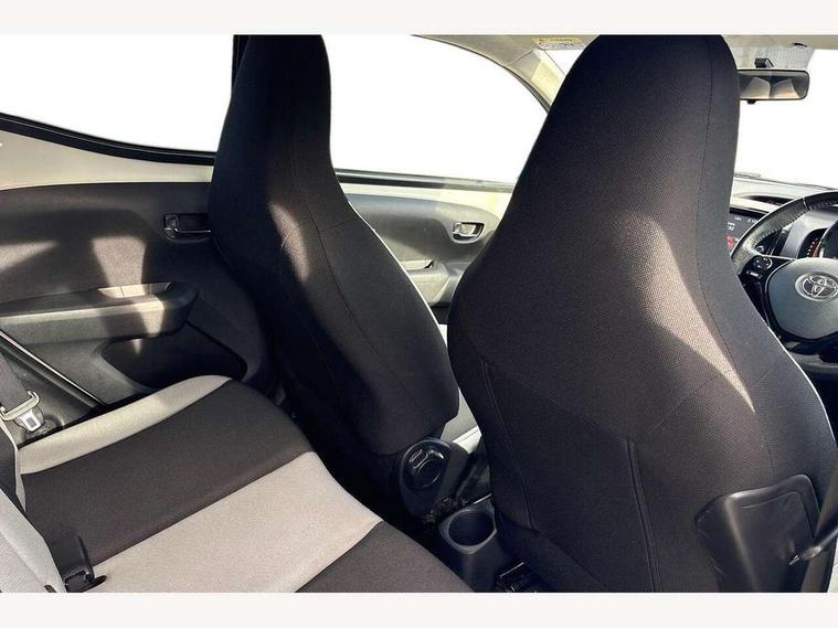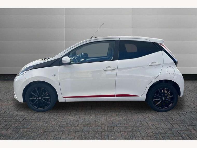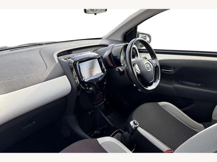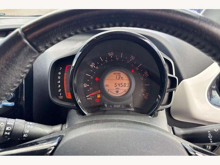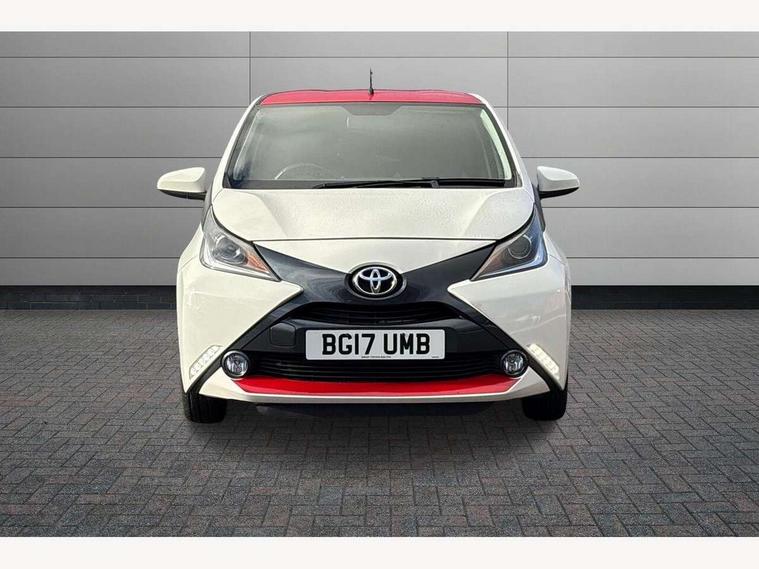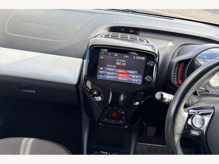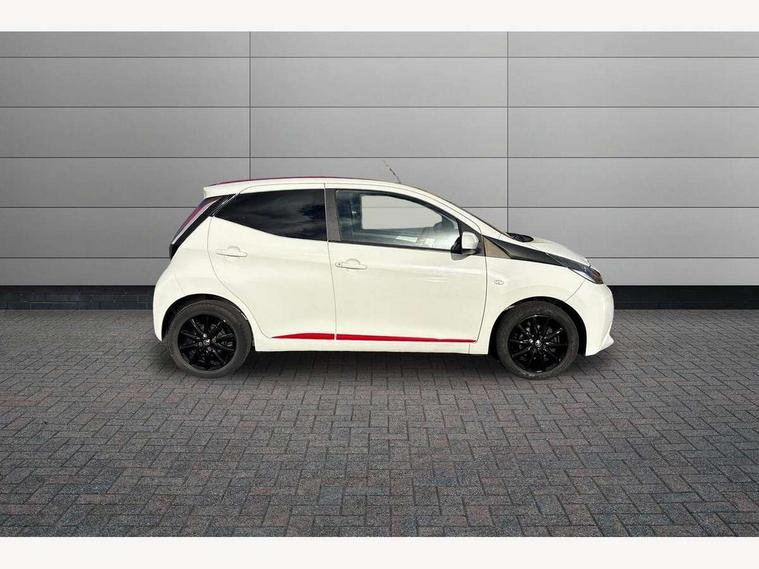 7" touch screen, Bluetooth system, Digital clock, Electric power steering, Fuel indicator with low level warning, Lights on warning, MirrorLink, Rear view camera, Speed limiter, Tachometer, Vehicle Stability Control (VSC), 4 speakers, Auxiliary input socket, Bluetooth audio streaming, DAB Digital radio, Multimedia System, Stereo radio, USB connection, 2 speed wipers/variable intermittent/mist function, Automatic headlights, Body colour bumpers, Body colour door handles, Body colour door mirrors, Electric adjustable door mirrors, Electric front windows, Front fog lights, Green tinted glass, Headlamp levelling, Heated door mirrors, Heated rear windscreen, LED daytime running lights, Privacy glass, Rear spoiler, Rear window demister, Rear wiper, Red front bumper accent, Red roof decal, Red side sills, Roof mounted aerial, 12V Accessory socket, 3 spoke leather steering wheel, 50/50 split folding rear seat, Air recirculation system, Auto air conditioning, Body colour instrument panel, Centre console storage, Chrome insert to gearknob, Chrome interior door handles, Driver and passenger sunvisors, Driver's seat height adjuster, Driver/passenger seat recline/slide adjust, Driver/passenger vanity mirrors with covers, Front and rear door pockets, Front cupholder, Front map reading lights, Front sports seats, Gleam cloth upholstery, Glovebox, Height adjustable front head restraints, Isofix system on outer rear seats, Leather gear knob, Pollen filter, Rear cupholders, Rear headrests, Steering wheel mounted radio/phone controls, Stepless tilt adjustable steering column, Storage bins on all doors, Tonneau cover, Outburst pack red pop - Aygo, ABS, Driver and passenger airbags, ESP, Fasten seatbelt reminder, Front side airbags, Height adjustable front seatbelts with pre-tensioners and load limiters, Hill start assist, Passenger airbag deactivate switch, Rear child proof door locks, Side curtain airbags, Tyre pressure warning, Engine immobiliser, Lockable fuel cap, Remote central locking, Body colour dashboard, Gloss black air vent surround, Gloss black centre console, Tyre repair kit,