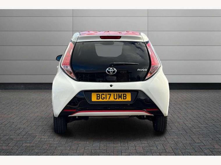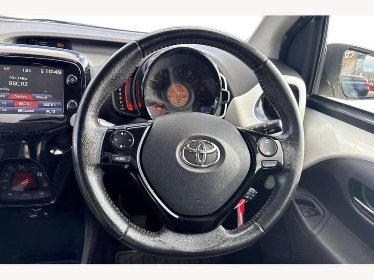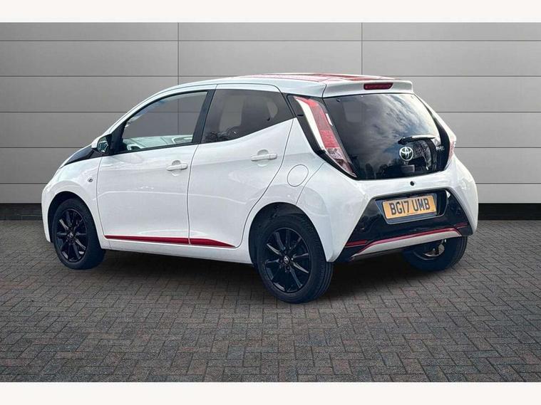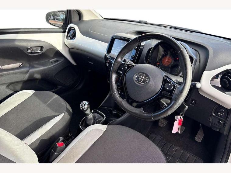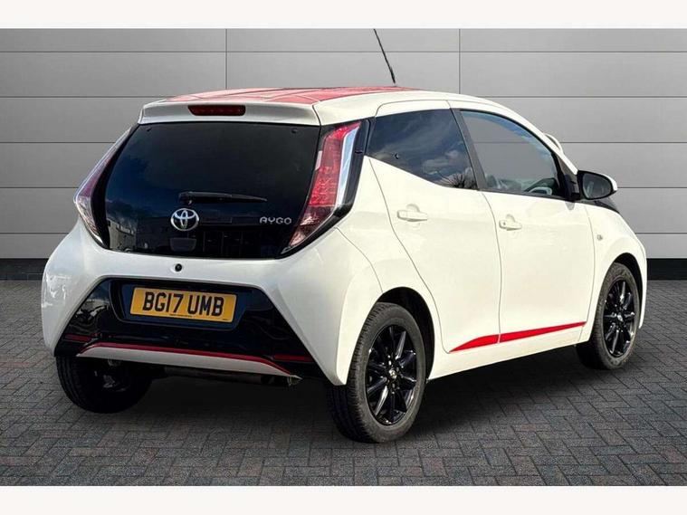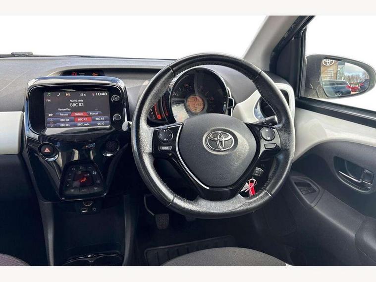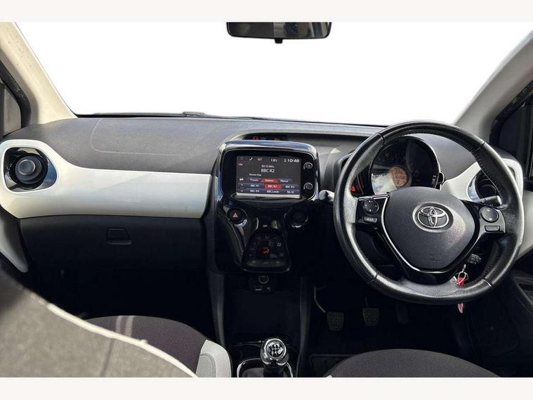7" touch screen, Bluetooth system, Digital clock, Electric power steering, Fuel indicator with low level warning, Lights on warning, MirrorLink, Rear view camera, Speed limiter, Tachometer, Vehicle Stability Control (VSC), 4 speakers, Auxiliary input socket, Bluetooth audio streaming, DAB Digital radio, Multimedia System, Stereo radio, USB connection, 2 speed wipers/variable intermittent/mist function, Automatic headlights, Body colour bumpers, Body colour door handles, Body colour door mirrors, Electric adjustable door mirrors, Electric front windows, Front fog lights, Green tinted glass, Headlamp levelling, Heated door mirrors, Heated rear windscreen, LED daytime running lights, Privacy glass, Rear spoiler, Rear window demister, Rear wiper, Red front bumper accent, Red roof decal, Red side sills, Roof mounted aerial, 12V Accessory socket, 3 spoke leather steering wheel, 50/50 split folding rear seat, Air recirculation system, Auto air conditioning, Body colour instrument panel, Centre console storage, Chrome insert to gearknob, Chrome interior door handles, Driver and passenger sunvisors, Driver's seat height adjuster, Driver/passenger seat recline/slide adjust, Driver/passenger vanity mirrors with covers, Front and rear door pockets, Front cupholder, Front map reading lights, Front sports seats, Gleam cloth upholstery, Glovebox, Height adjustable front head restraints, Isofix system on outer rear seats, Leather gear knob, Pollen filter, Rear cupholders, Rear headrests, Steering wheel mounted radio/phone controls, Stepless tilt adjustable steering column, Storage bins on all doors, Tonneau cover, Outburst pack red pop - Aygo, ABS, Driver and passenger airbags, ESP, Fasten seatbelt reminder, Front side airbags, Height adjustable front seatbelts with pre-tensioners and load limiters, Hill start assist, Passenger airbag deactivate switch, Rear child proof door locks, Side curtain airbags, Tyre pressure warning, Engine immobiliser, Lockable fuel cap, Remote central locking, Body colour dashboard, Gloss black air vent surround, Gloss black centre console, Tyre repair kit,