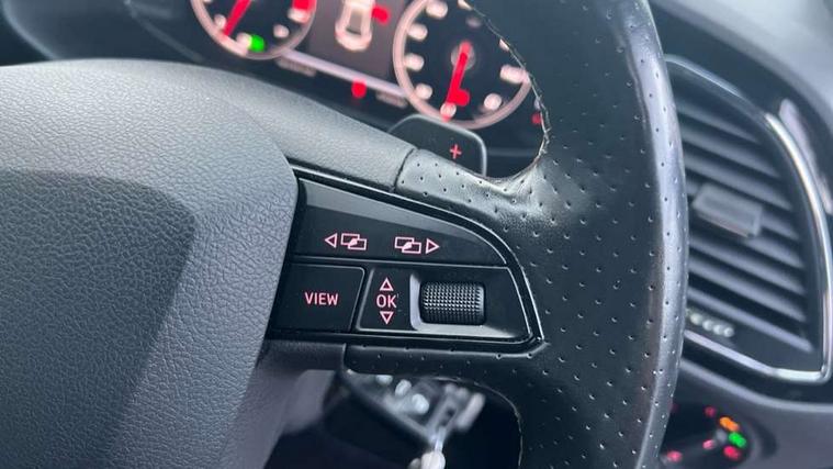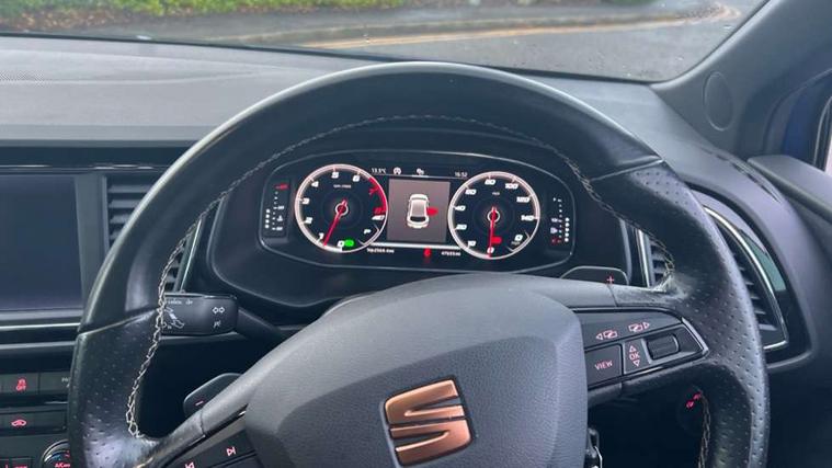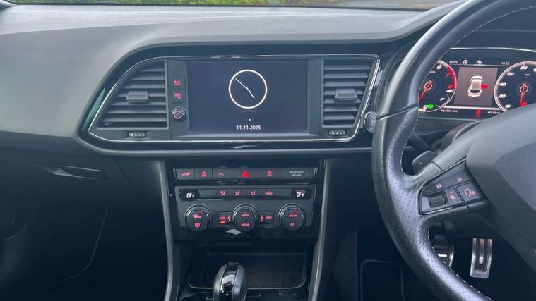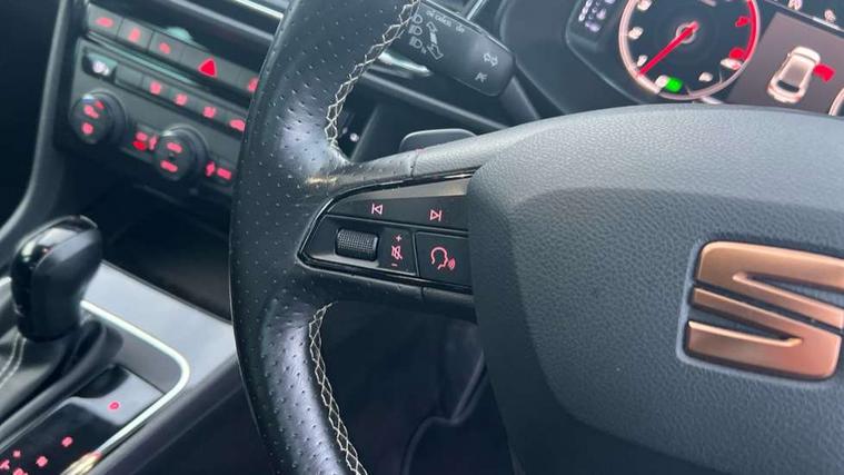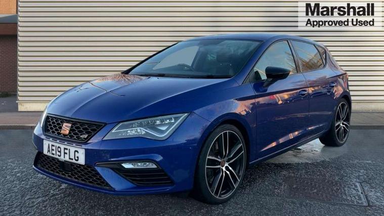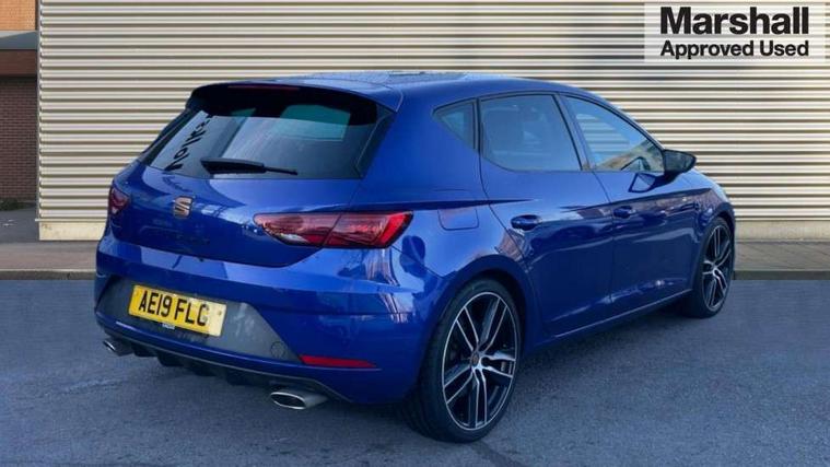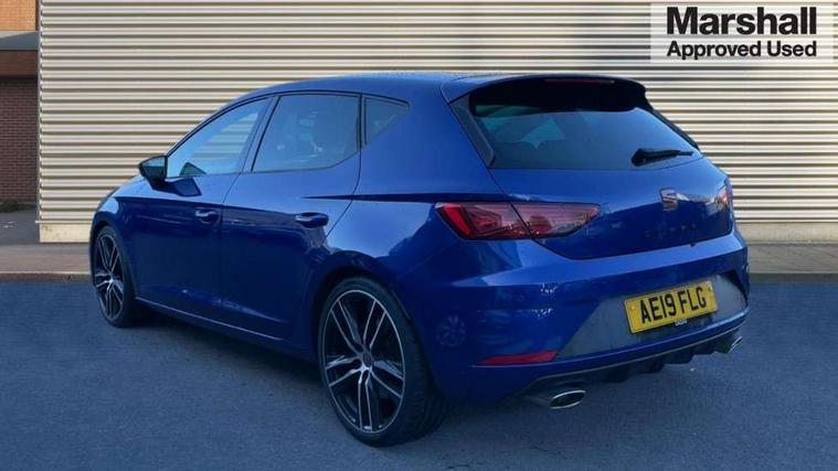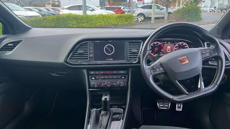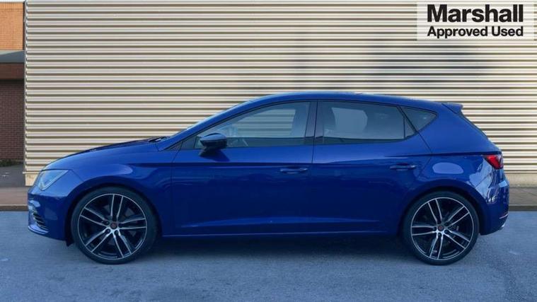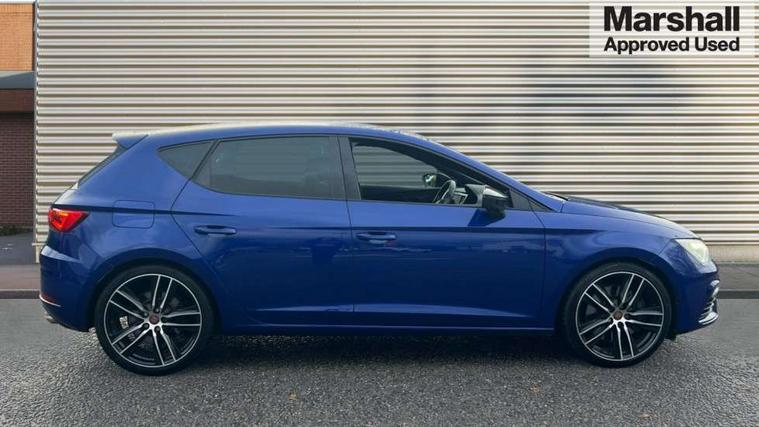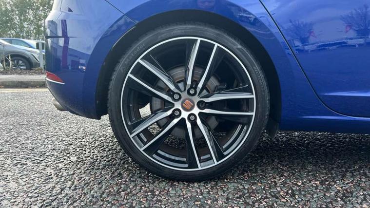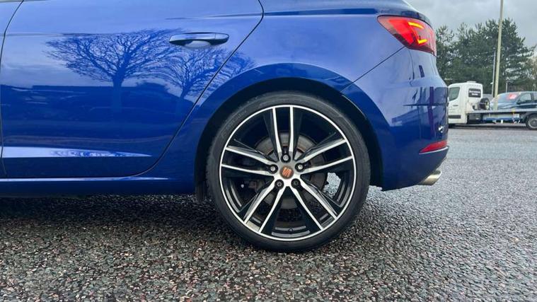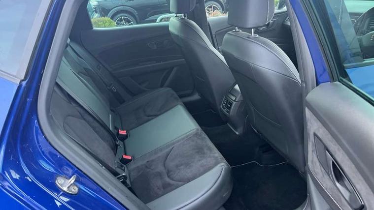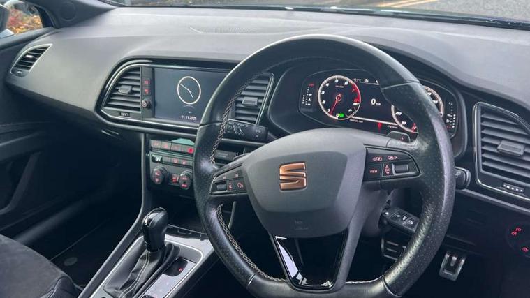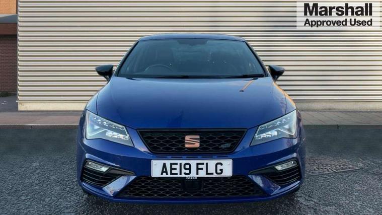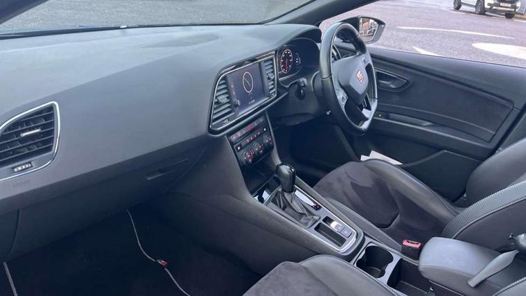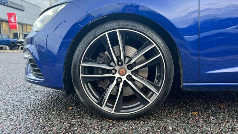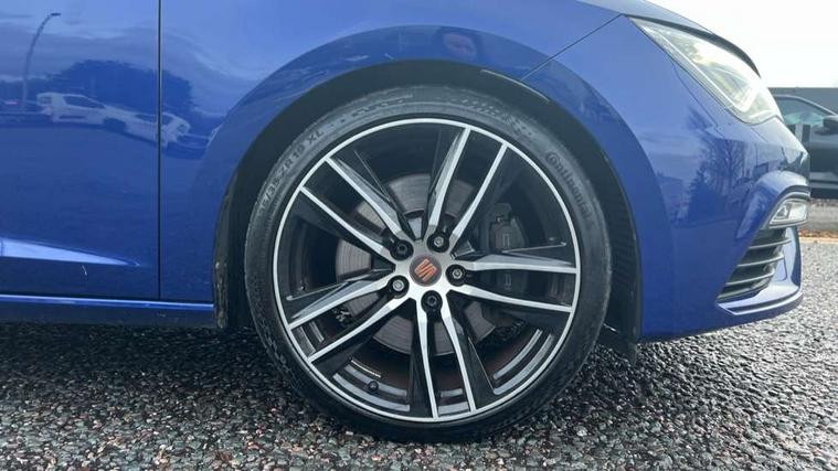 'Lights On' Reminder warning buzzer, 3D map display, 8" touch screen, Bluetooth Handsfree Phone Connection, CUPRA performance interface, Digital cockpit, Electro-mechanical progressive power assisted steering, Front and rear parking sensors, Front assist with pedestrian protection, Full Link Smartphone Integration with Mirror Link, Apple Car Play, Google Android Auto, Low fuel warning light, Navigation system (incl. media system plus), Outside temperature gauge, RPM counter, SEAT Drive profile CUPRA, SEAT logo boot release, Service interval indicator, Trip computer, Voice recognition, Dynamic chassis control, Lowered suspension, Mechanical limited slip differential, XDS electronic differential lock, 2x SD card slot, 4 USB, 8 speakers, Auxiliary input socket, Bluetooth audio streaming, CD player, DAB Digital radio, High resolution colour driver display, Media system plus (incl. media system colour), SEAT USB media cable, Steering wheel mounted audio/phone controls, Black radiator grille, Body colour door handles, Body coloured bumpers, Dark tinted rear windows, Electric front/rear windows, Electrically adjustable door mirrors, Electrically foldable exterior mirrors with parking position and passenger-side mirror with lowering function, Exclusive Cupra front and rear bumpers, Gloss black exterior mirrors with integrated LED indicators, Heated door mirrors, High gloss black finish B and C pillars, High gloss black front grille surround, Illuminated aluminium front door sill with CUPRA logo, LED front fog lights, LED headlights with LED day time running lights + LED rear lights + LED number plate lights, LED rear fog light, Rear wash/wipe, Visible dual exhaust pipes, 12v power point in centre console, 60/40 split folding rear seat with armrest, Active front headrests and 3 rear headrests, Additional heating and ventilation outlet in rear of centre console, Black roof lining, Boot storage net, Cargo rings in boot, Driver and passenger seat height adjust, Driver and passenger sun visor, covered and illuminated mirror, driver sun visor with card holder, Driver seat lumbar adjustment, Dual zone climate control, Dust/pollen filter, Flat bottomed perforated leather steering wheel with white stitching and CUPRA logo, Front adjustable head restraints, Front armrest with storage box, Front cupholders x 2, Front seatback storage pockets, Front sport seats in alcantara, Front/rear floor mats, Gear shift indicator, Height/reach adjust steering wheel, High centre console with integrated box & cup holder, rear air outlet, with armrest in front seats, Illuminated door sills, Instrument lighting with brightness control, Interior copper and black detailing, Luggage tie-down hooks, Multi-colour ambient interior lighting, Passenger seat lumbar adjust, Pedals with Aluminium Cover, Rear top tether child seat ISOFIX attachment, Steering wheel gearshift paddles, Storage box under drivers and passenger seat, 3 point seatbelts on all rear seats, 7 airbags - 2 front, 2 front side, 2 curtain, 1 knee, ABS + TCS, Child proof door locks, Electric handbrake, Electronic parking brake with auto hold, ESC with switch off key, ESC with tyre pressure warning indicator, ESP+EBA, Front and rear black brake calipers with cupra logo, Front seatbelt pretensioners, Front seatbelt reminder, Hill hold control, Multi-Collision braking, Passenger airbag deactivation system, 2 folding remote keys with window open/close function and boot opening/door mirror folding function, Central locking fuel filler cap, Engine immobiliser, Locking wheel bolts, Remote central locking + deadlocks, Volumetric alarm with back up horn, Gloss black interior detailing, 19" Cupra Machined alloy wheels 30/2,