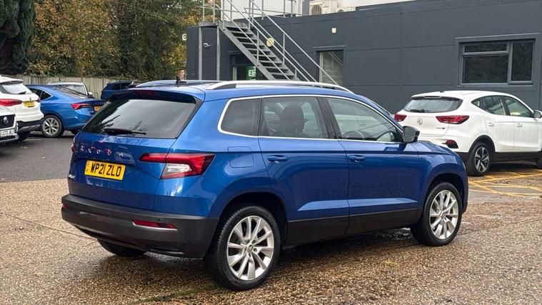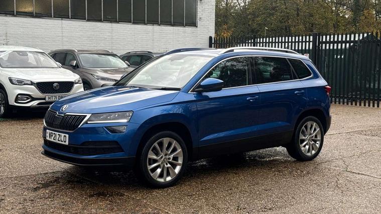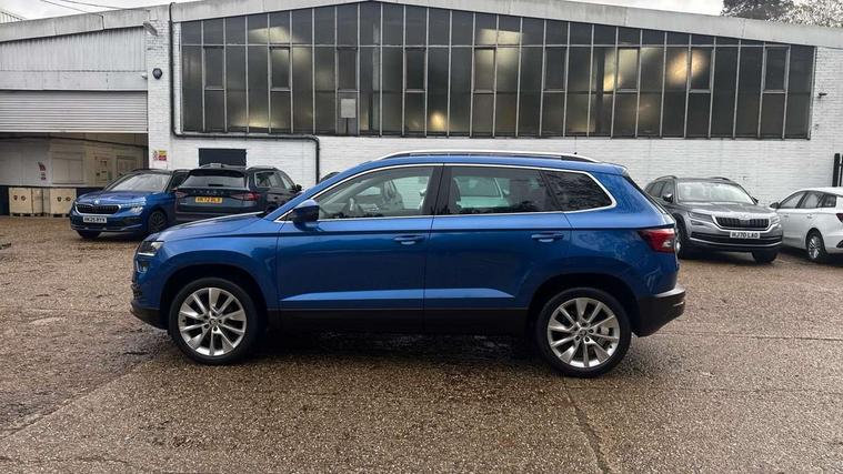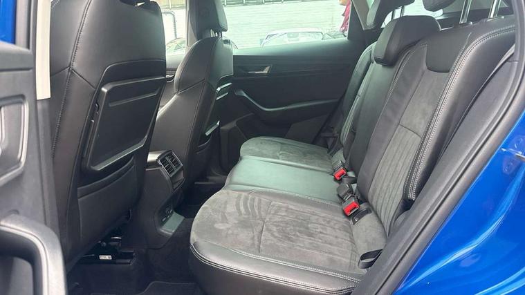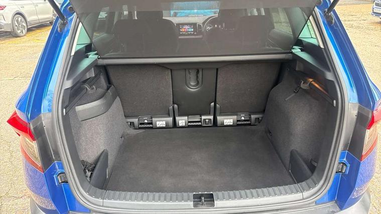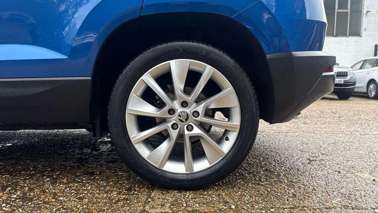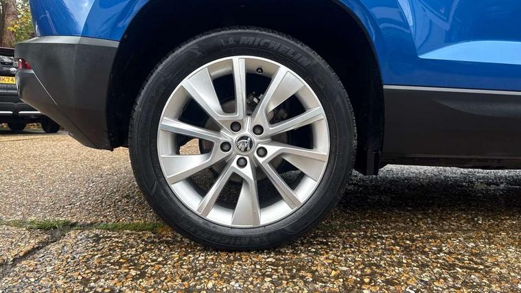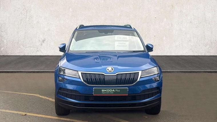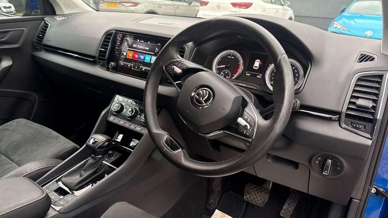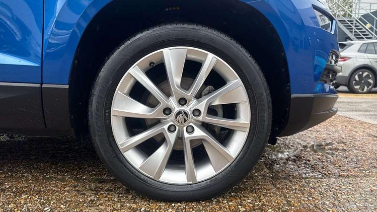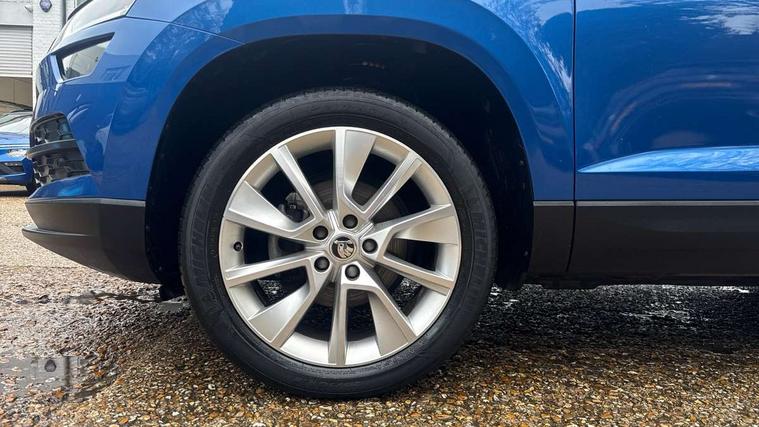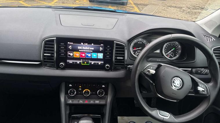 Care connect, Drive mode selector, Driver fatigue sensor, Multifunction colour trip computer, Outside temperature gauge, Service interval indicator, SmartLink wireless for Apple and wired for Android, Start/stop system with regenerative braking, USB C Port x 2 in front centre console, DAB radio with Bluetooth, USB connection, Acoustic glass, Aero front windscreen wipers with intermittent function, Automatic headlight control system, Black electric window control buttons, Body colour door mirrors and handles, Body coloured bumpers, Electric front and rear windows with child proof lock, Full LED headlights + adaptive front light system + LED daytime running lights and front cornering fog lights, Headlight washers, Heated rear windscreen, LED rear lights with high functionality, Light assistant (coming/leaving home/tunnel light), Privacy glass, Safety reflectors on front doors, Third brake light, 1.5 litre bottle holders in driver and front passenger door panels, 12V socket in boot, 12v socket in front centre armrest with storage compartment and rear air vents, 2 Folding hooks and nets in boot, 2 Front readings lights for driver and passenger, 3 rear height adjustable headrests, 4 foldable roof handles with rear coat hooks, 4 lashing points on luggage floor, Backrest release, Cargo elements in boot, Chrome inner door handles, Folding tables on the front seat backrests, Front head restraints, Front seat and rear pockets, Height adjustable front three point seats belts with tensioners, Height adjustable passenger seat, Height/reach adjust steering wheel, Ice scraper, Illuminated and cooled glovebox, Illuminated luggage compartment, Isofix child seat preparation outer rear, Net programme in boot, Pen holder, Pollen filter, Rear boot cover, Rear reading lights, Retractable parcel shelf attachable to tailgate, Safety vest holder, Storage box in upper central dashboard closed, Storage compartment below the passenger seat, Sunvisors with illuminated vanity mirrors, Textile floor mats, Umbrella under passenger seat, VarioFlex seats with retractable parcel shelf, Chrome roof rails + chrome pack - Karoq, Airbags - Front side, head, knee and curtain, Automatic door unlocking in case of crash, Automatic fuel cut off in case of crash, Driver airbag, Electronic parking brake with auto hold function, Emergency rear braking signal, ESC including ABS, MSR, ASR, EDS, HBA, DSR, RBS, MKB and traction control, Front assist radar scanning of the space in front of the car with automatic braking, Hill hold control, Passenger airbag with switch-off function, Pedestrian monitor, Seatbelt reminder signalisation and pretensioner for all seats, Three point seatbelts rear, Two tone horn, Tyre pressure display, Tyre pressure monitor, Alarm with interior monitoring, back up horn and tilt sensor with safe function, Electronic engine immobiliser, Keyless entry and keyless start with safe system, Remote central locking with 2 remote folding keys, Chrome framed air vents, Storage on wheel cover,
