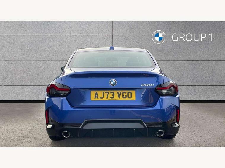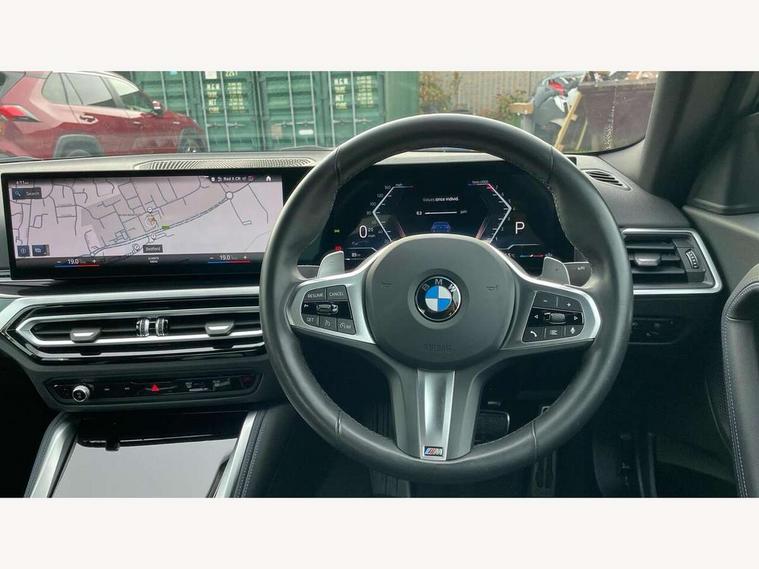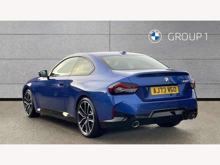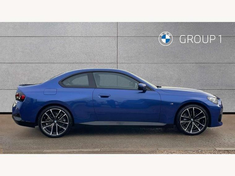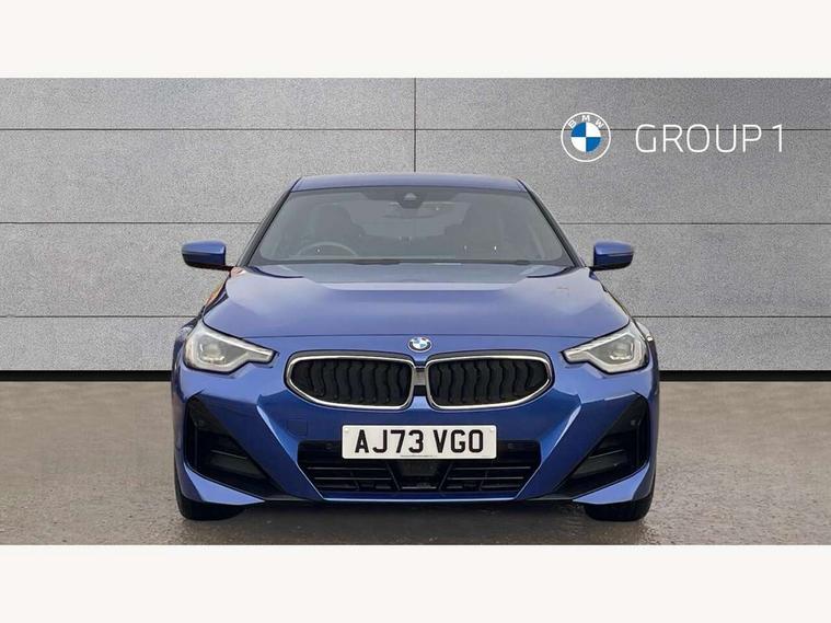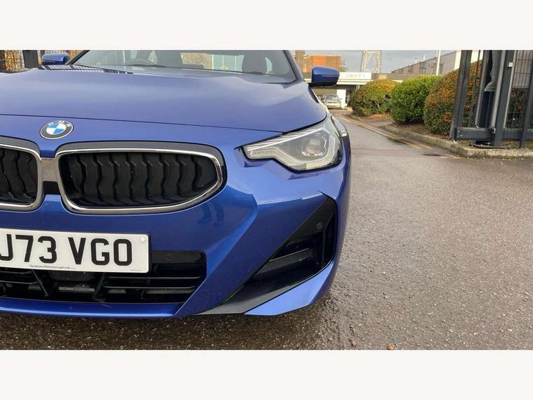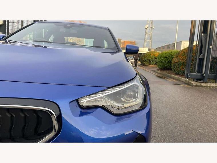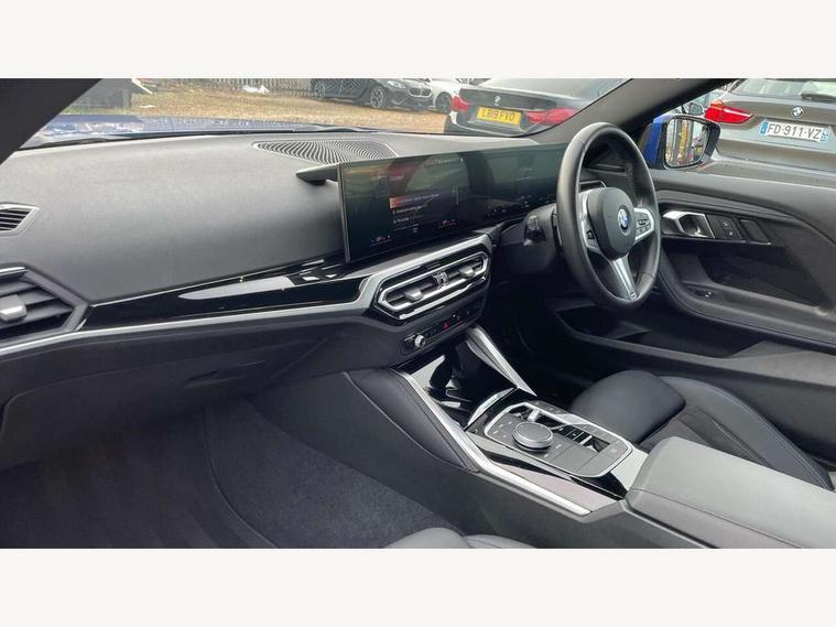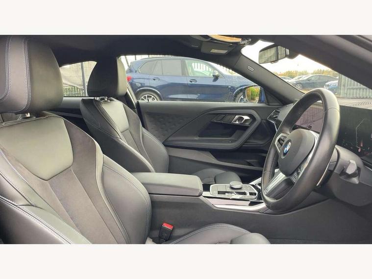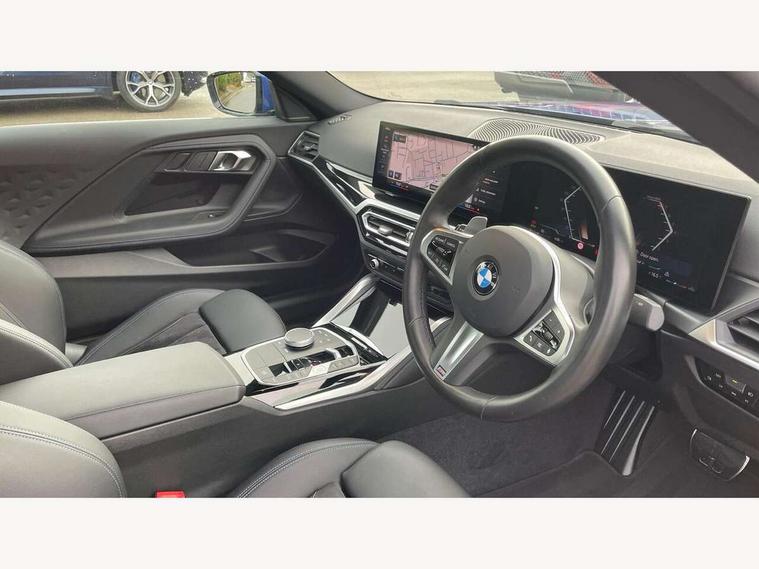 2 USB connections for charging and transferring data, 4G LTE connectivity with hard wired 4G network sim card, Attentiveness assist, Bluetooth with USB, BMW ConnectedDrive online services, BMW Intelligent Personal Assistant, BMW operating system 8 with variable, configurable widgets display information in real time, BMW Teleservices, Check Control warning system for monitoring of lights and door/luggage compartment open warning, Direct selection buttons, Drive off assistant, Eco pro mode, Electric power steering, Front and rear parking sensors, Front/rear Parking distance control, iDrive controller with turn and press function, Integrated owners handbook, Intelligent functions, Live cockpit plus with nav function 12.3" instrument cluster and 14.9" centre display, Oil sensor for level and grade, Optimum shift indicator, Personal Profile, Touch operation on control display, Variable sport steering, Widescreen multi-media display, WiFi interface for wireless connection of mobile terminal devices, Aluminium lightweight construction, Balancer shaft, BMW TwinPower Turbo four-cylinder petrol engine, Double VANOS, Drive performance control with ECO PRO comfort + sport mode, Electronic differential lock, High precision injection, M sport suspension, Petrol Particulate Filter, Sport automatic steptronic transmission with gearshift paddles, manual gearshift time display, launch control, coasting idle ECO PRO/COMFORT modes, Twin scroll turbocharger with Valvetronic, DAB tuner, Acoustic windscreen wipers for reduced driving noise, Adaptive LED Headlights, Automatic windscreen wipers and automatic headlight, Automatically dimming rear view mirror, Body colour door handles flush with door surface, Body colour door mirrors, Body colour front and rear bumpers, Daytime running lights, Electric windows - front and rear, with open/close fingertip control and trap release, Exhaust tailpipes x2 - 90mm in left and right, Fading support, Front and rear bumper system with replaceable deformation elements, Front door sill finishers in black plastic with BMW designation, Front windscreen wipers with integrated washer jets, Green tinted heat protection glazing, High beam assistant, High gloss black sill, bumper trim sides and diffuser insert, High gloss shadowline exterior trim in mirror triangle cover, mirror cover panel, mirror bezel and window border, High level third brake light, Indicators integrated int mirror housing, LED registration plate light, LED technology rear tail lights, brake lights and turn indicators, Lightweight engineering, Model designation on right side of tailgate, One piece kidney grille with hight gloss chrome surround, Rear boot, Rear fog lights, Reversing light in rear light cluster, Shark fin antenna, Single part LED rear lights with smoked glass components, Trailer stabilisation logic, Visible VIN plate, 12V power socket in front centre console with blanking plug, 2 cupholders in front centre console, 2 zone automatic air conditioning, Ambient lighting, Compartment in front of cupholder, Conditioned based service, Driver seat backrest width adjustment, Front and rear side armrests integrated into door trim, Front armrest, Front door pockets, Front head restraints, Front sport seats, Heated front seats, Illuminated glove compartment with separate small compartment, M headliner Anthracite, M sport leather steering wheel, Manually adjustment steering wheel column, Rear seat backrest with manual 40:20:40 split folding, Rear seat centre foldable armrest with integrated cup holder, Single front passenger seat, Storage compartment between rear seats, Storage tray and compartment with cover in centre console, Sun visors with vanity mirrors and insert tab, Through loading system with 40/20/40 split folding 2 rear seat in 2nd row, Two folding rear seat headrests, Velour floor mats, Additional storage compartment pack without USB - 2 Series Coupe, Connected pack professional - 2 Series Coupe, Interior and exterior mirror pack - 2 Series Coupe, M Sport exterior styling aerodynamics pack - 2 Series Coupe, 2 tone horn, Anti lock braking system (ABS) with cornering brake control, Automatic Stability Control (ASC), BMW emergency call, Brake drying, Child seat ISOFIX attachment for the two outer rear seats, Crash sensor activating of airbags, Unlocking doors, hazard warning lights, interior light, safety battery terminal, Deactivation of fuel pump in the event of a crash, Driver and front passenger airbags, Driver and front passenger side airbags, integrated in the door side seat backrest bolsters for all seat variants, Dynamic brake control, Dynamic stability control + (DSC+), Dynamic Traction Control - DTC, Electrically operated hand brake including automatic hold function and automatic release when driving off, Front and rear disc brakes, Head airbags for all 4 outer seats, Manual deactivation of front passenger airbag, Seat belt security check for driver and front passenger, Seatbelt warning, Side impact protection, Three point seat belts on 4 seats including front belt stopper, pyrotechnic belt tensioners and belt force limiters, Tyre pressure sensor, Warning triangle and first aid kit, Alarm system (Thatcham 1) with remote control and electronic engine immobiliser, Central locking switch for all doors, fuel filler cap and luggage compartment, Deadlocking function system to all doors, Drive away locking system on all doors and luggage compartment, Locking wheel bolts, Start/Stop button (illuminated) in centre console with keyless engine start and Auto Start-Stop deactivation button, Two remote control key with integrated key - one button for open and close doors/fuel flap/tailgate and separate button for unlock luggage compartment, BMW mobility tyre sealing system, Electrically powered 12V compressor, Reduced rolling resistance tyres,
