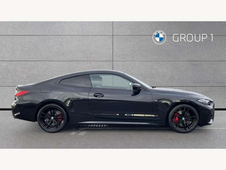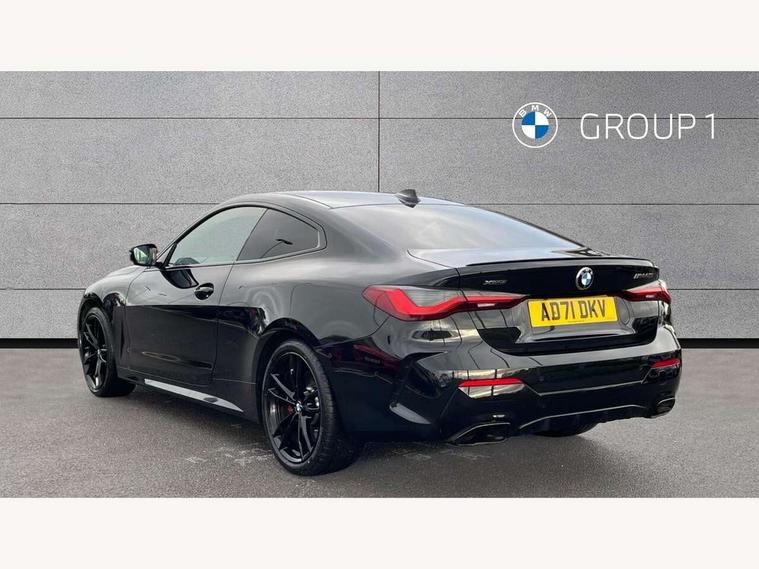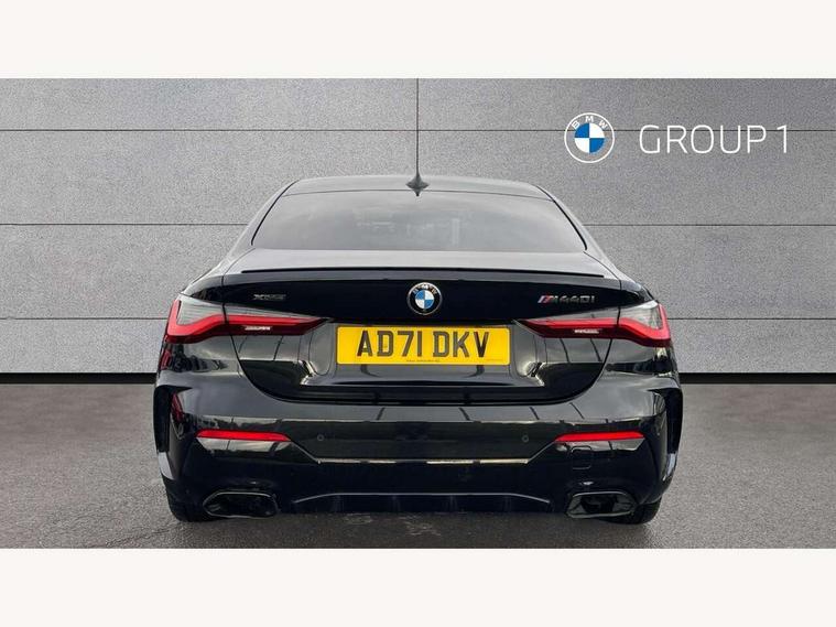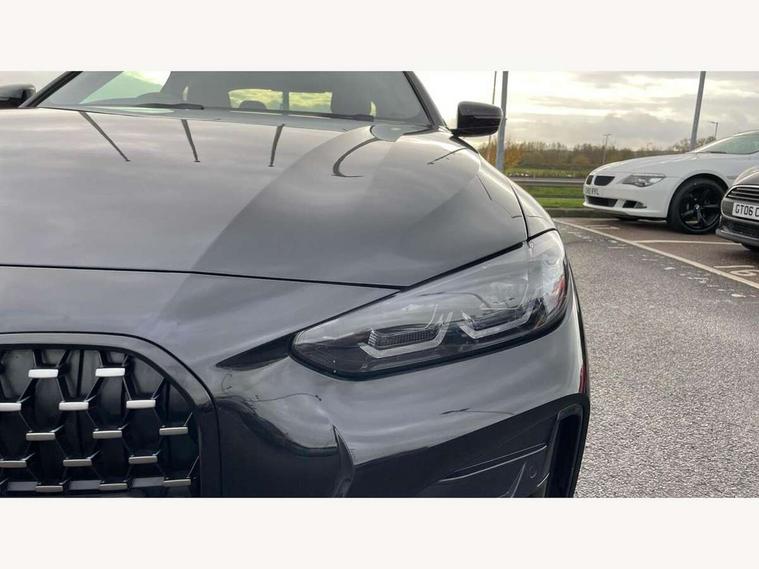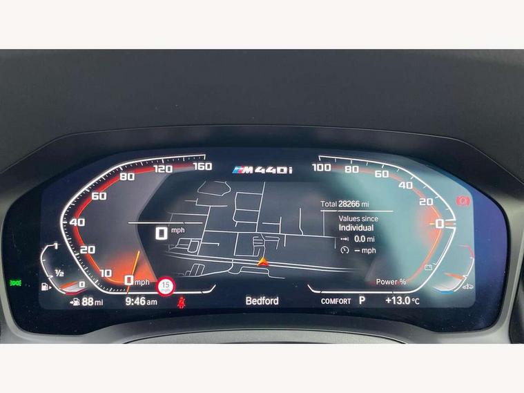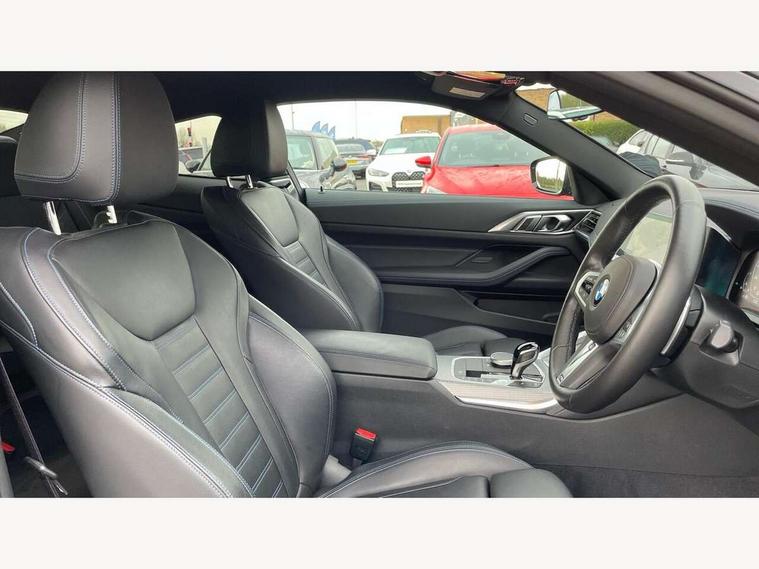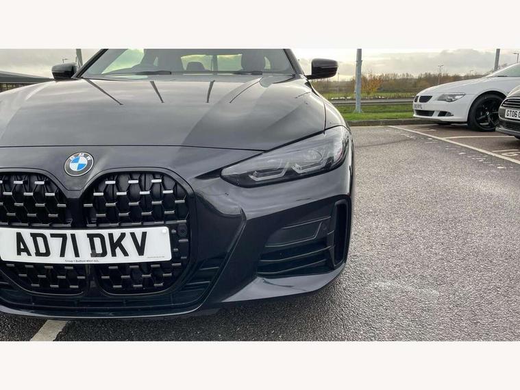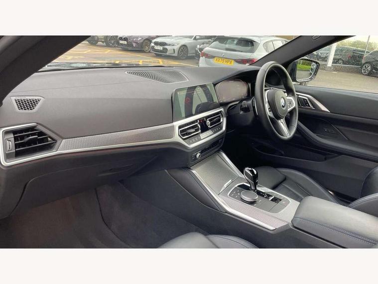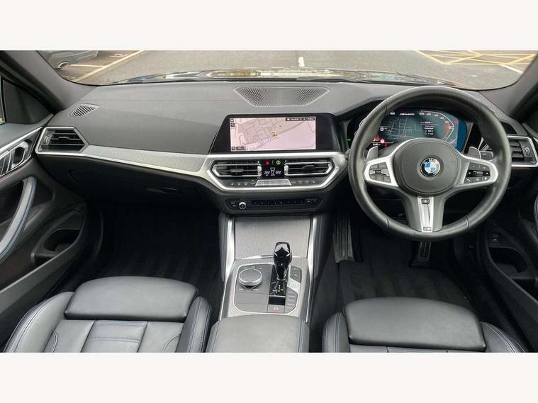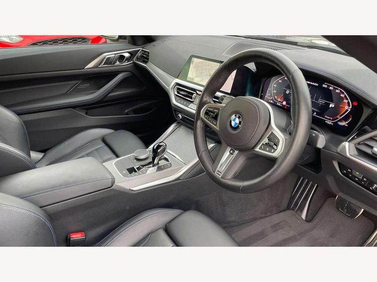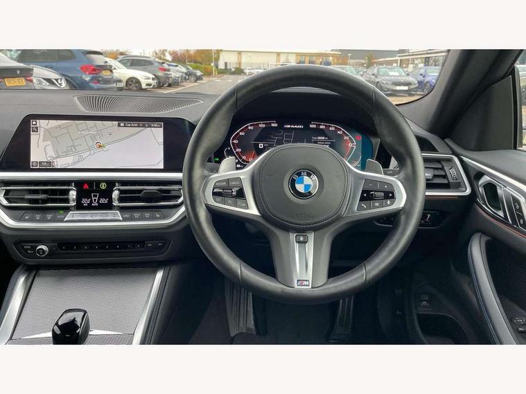 Active guard plus, Attentiveness assist, Auto start-stop, BMW ConnectedDrive online services, BMW iDrive controller on centre console, BMW Live Cockpit Professional Nav with 12.3" instrument display + 10.25" display, Intelligent Voice Assist, BMW OS 7, HDD, 2USB, 4G LTE connect, BMW service history, BMW Teleservices, Brake pad wear indicator in front and rear, Check Control warning system for monitoring of lights and door/luggage compartment open warning, Condition based service, Electric power steering with Servotronic steering optimised at all speed ranges, Gearshift time display in manual mode, Instrument cluster with speedometer with mph readout, tachometer, fuel gauge and oil temperature gauge, Integrated owners handbook, Oil sensor for level and grade, warning by check control system, On board computer - average speed, fuel consumption, outside temp display with acoustic warning, clock/date, service interval, odometer/trip meter, Optimum shift indicator, Touch control functionality for BMW Live Cockpit Professional Nav, Variable sport steering, 48V Mild hybrid technology, 8 speed automatic steptronic transmission with gearshift paddles, Adaptive M suspension, Balanced 50/50 weight distribution, Driving experience modes - Comfort, ECO PRO, Sport and Sport+ mode, Low centre of gravity, M Sport differential, Petrol Particulate Filter, Stroke dependent dampers, xDrive system permanent all-wheel drive variable torque distribution, DAB tuner, Electronic service booklet, 3rd brake light, Acoustic glazing, Automatic headlight beam throw control with load dependent regulating reaction, dynamic compensation of braking dive and acceleration squat, Automatic windscreen wipers and automatic headlight, Automatically dimming electrochromatic rear view mirror, BMW emblem on engine compartment lid and tailgate, Body colour fuel filler flap, Body colour roof fin, Brushed aluminium inserts in the front door sill finishers with BMW designation, Dynamic brake lights, Electric windows - front and rear, with open/close fingertip control, anti trap facility and comfort closing function all round, Exterior mirrors - electrically folding with anti-dazzle, Fading support, Front and rear bumper system, Front apron plastic in body colour, Green tinted heat protection glazing, Illuminated bow type door handles in body colour drivers side with door lock, Interior rear view electrochromatic mirror with automatic anti dazzle function, LED daytime running lights, Licence plate panel integrated into front bumper and tailgate, Lightweight engineering, M designation on front side panels, left and right, M rear boot spoiler, One piece front bumper cover including towing eye cover in body colour, Preparation for high beam assistant, Rear boot, Side frame decorative moulding black matt, Sun protection glass, Twin exhaust tailpipes x2, Two part LED tailights in L-shape with components in smoked glass, brake light, LED turn indicator and rear fog light, Visible VIN plate, Welcome lights in interior and door handle area, Widened track and increased camber values for max transverse dynamics, agility and steering precision, Window recess cover black high gloss, Windscreen wipers with integrated heated washing jets, xDrive designation on left tailgate, 12V power socket in front centre console, 2 front cupholder in centre console with clamping elements and matt black inlay, 2 Rear seat headrests, 2 seat bench in second row, 3 spoke M sport leather multifunction steering wheel, 3 zone automatic air conditioning, 4 pieces lashing eyelets in luggage compartment, 40:20:40 split folding rear seat and rear centre armrest with two cupholders, Ambient lighting with welcome carpet light, Anthracite headlining, Armrest integrated in front and rear door trim + front centre console armrest, Four grab handles integrated in roof lining, Front and rear door exit lighting (left / right), Front and rear door pockets, Front and rear footwell lights, Front and rear reading lights, Front headrests, Front passenger seat, Heated driver and front passenger seats, Height adjustable mechanically and infinitely variable steering column, Illuminated armrest storage compartment, Illuminated glove compartment with separate small compartment, Luggage compartment light, Make-up mirror lights, Storage compartment in rear centre console, Sunvisors with vanity mirrors and ticket pocket, Toolkit located in luggage compartment, USB type - C cable charging function in the rear centre console, Velour front floor mats, Connected professional package - 4 Series, M sport exterior styling pack - 4 Series M440i, 2 x 3-point rear seatbelts, Battery safety cut-off, BMW emergency call, Brake energy regeneration, Braking pre-tensioning, Child seat ISOFIX attachment for the two outer rear seats, Coasting in idle in ECO PRO mode, Cornering brake control (CBC), Crash sensor activating of airbags, Unlocking doors, hazard warning lights, interior light, safety battery terminal, Driver and front passenger side airbags, integrated in the door side seat backrest bolsters for all seat variants, Driver/Front Passenger airbags, Dry braking, Dynamic brake control, Dynamic stability control + (DSC+) - Anti-lock Braking System (ABS) with brake assist and cornering brake control + Automatic Stability Control (ASC), Dynamic Traction Control - DTC, Electric parking brake including automatic hold function and automatic release of the parking brake when driving off, Electronic differential lock control (EDLC), Front and rear ventilated brake disc, Front passenger manual airbag deactivation, Head airbags for all 4 outer seats, Hill start assistant, M Sport seatbelts, Seat belt security check for driver and front passenger, Seat belt with belt stopper, pyrotechnic belt tensioners and belt force limiters, Side impact protection, Tyre pressure monitoring with three level warning strategy, Warning triangle and first aid kit, Alarm system (Thatcham 1) with remote control and electronic engine immob