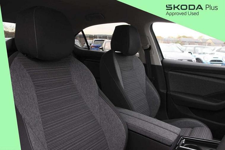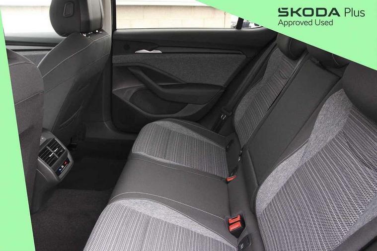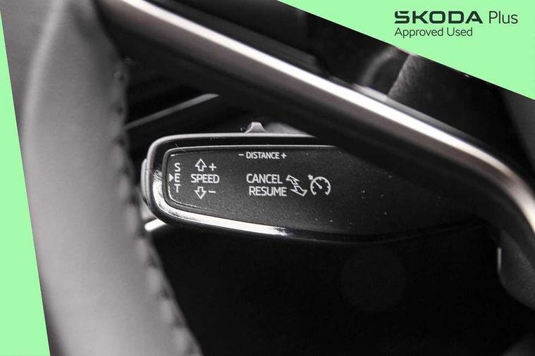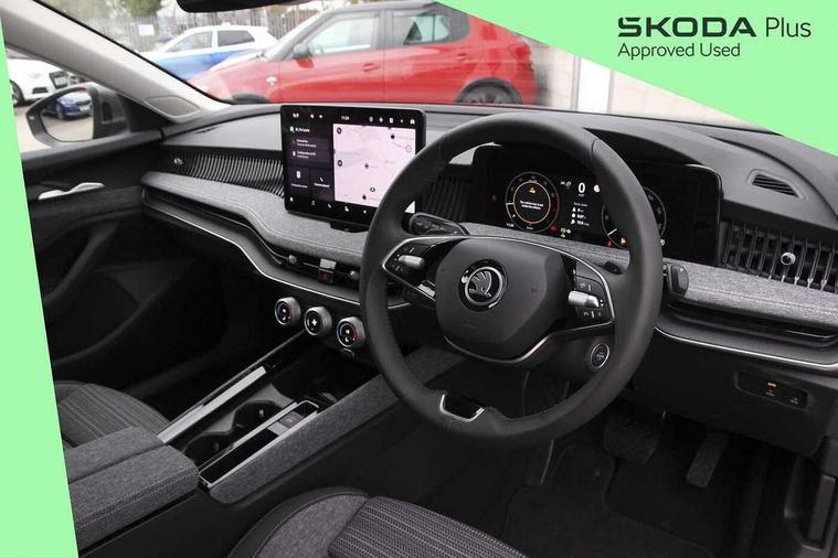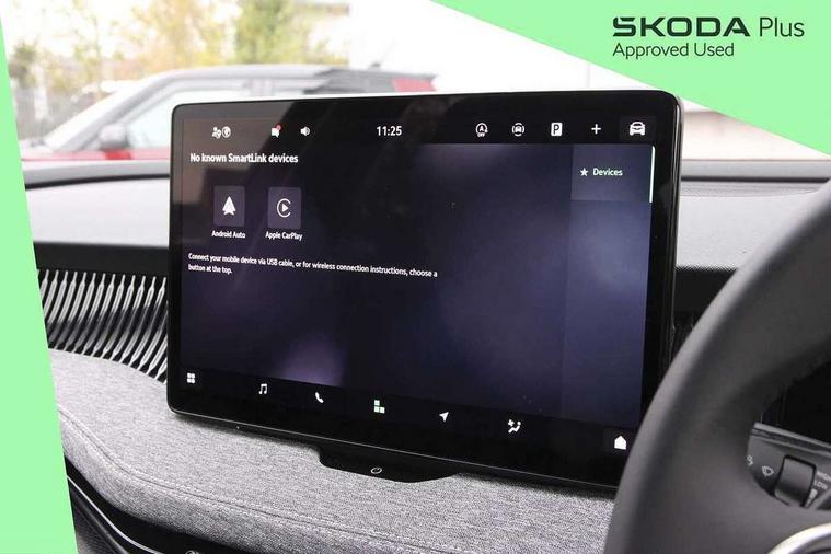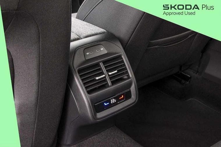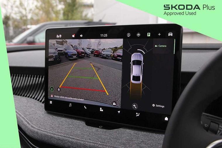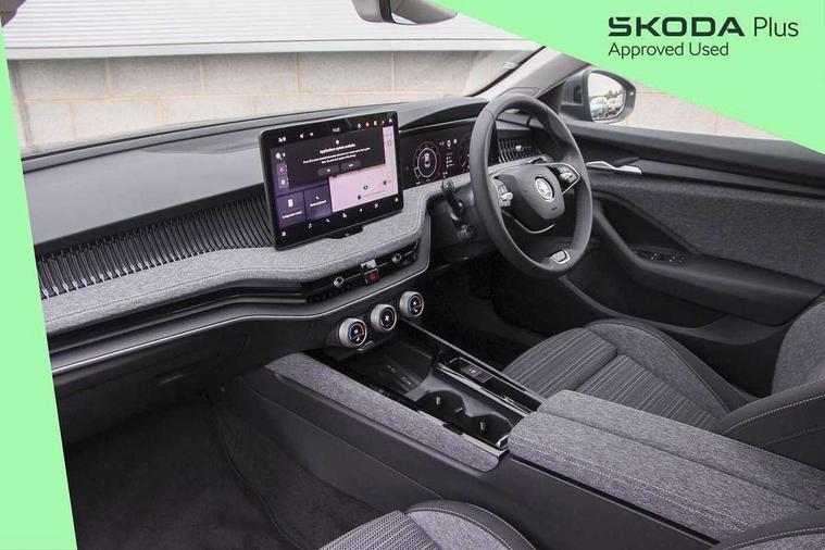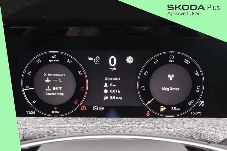 13" touchscreen display with satellite navigation, 4x USB-C ports (2x in front centre console and 2x in rear) (45W), Adaptive cruise control with speed assist, lane assist plus and traffic tram assist, Blind spot detection with door exit warning, Bluetooth system, CareConnect and Emergency Call, ChatGPT functionality, Driver fatigue sensor, Front assist with extended predictive pedestrian protection, Front cross traffic assist, PAS, Quick start all heating software functionality, Rear view camera with washer, Stop/start engine system, Traffic sign recognition, Turn assist with evasive assistance, Virtual Cockpit - 10.25" digital display, Voice control system, Wireless charging for one smartphone (15W) with cooling function, Wireless smartlink apple carplay, SmartLink+ android auto, 8 Speakers, DAB Digital radio, Display cleaner, FM radio connection, Web radio connection, Acoustic side windows and interior noise suppression, Backdrop lighting, Body colour door handles, Body coloured door mirrors, Chrome window surround, Electrically adjustable, heated, folding and driver side auto-dimming door mirrors with integrated indicators and logo projection, Frameless auto-dimming rear view mirror with USB-C, Front windscreen with heat-insulating glass, Ice scraper in fuel tank cap, LED 3rd brake light, Light assist with High beam control, Light assistant (coming/leaving home/tunnel light), Privacy glass, Rear fog light (x1), Rear side wing doors, Tow bar preparation, Unique dark chrome design logo on alloy wheels, Unique dark chrome grille surround with dark chrome rib elements, Windscreen wipers with rain sensor, 12V socket 1x centre console 1x boot, 12V socket and 2x cargo elements in boot, 2 spoke multifunction steering wheel with DSG paddles, 3 seat bench in 2nd row, 60:40 Split folding rear seats, Bottle holders in the front doors 1.5 litre bottle and rear 1.5 litre bottle, Cup holder in front with easy open mat, Front and rear footwell illumination, Front armrest with storage box, Front comfort seats, Heated front seats, Height adjustable driver and front passenger seats with 2-way electric tilt, 4-way pneumatic lumbar support, and extendable thigh support, Height adjustable front and rear head restraints, Height adjustable front passenger seat, Illuminated glovebox, Interior lights with control switches, Isofix child seat fittings in outer rear and front passenger seats, LED front and rear reading lights, Massage function for front seats, Single front passenger seat, Skoda lettering on steering wheel, Storage pockets on back of front seats, Sun visors with illuminated vanity mirrors, Ticket holder on A Pillar, Tri zone climate control, Umbrella in driver's door, 3 rear seatbelts, 8 Airbags - Front driver and passenger, front side driver and passenger, centre, curtain front and rear, drivers knee, Crew protect assist, Driver and passenger seatbelts with warning light, Electronic parking brake, ESC including ABS, EBV, MSR, ASR, EDS, HBA, DSR, RBS, CBC, multi-collision brake (MKB) and Auto hold, Hill hold assist, Power operated child lock in rear doors, Alarm with interior monitoring tilt sensor and back up horn, Backrest remote release from trunk, Electronic engine immobiliser, Keyless start/stop, Remote central locking with SAFE system, Third key, Decorative front door sills,
