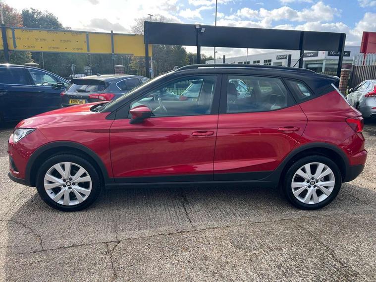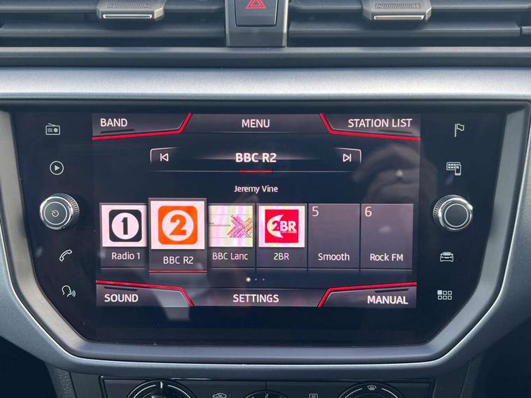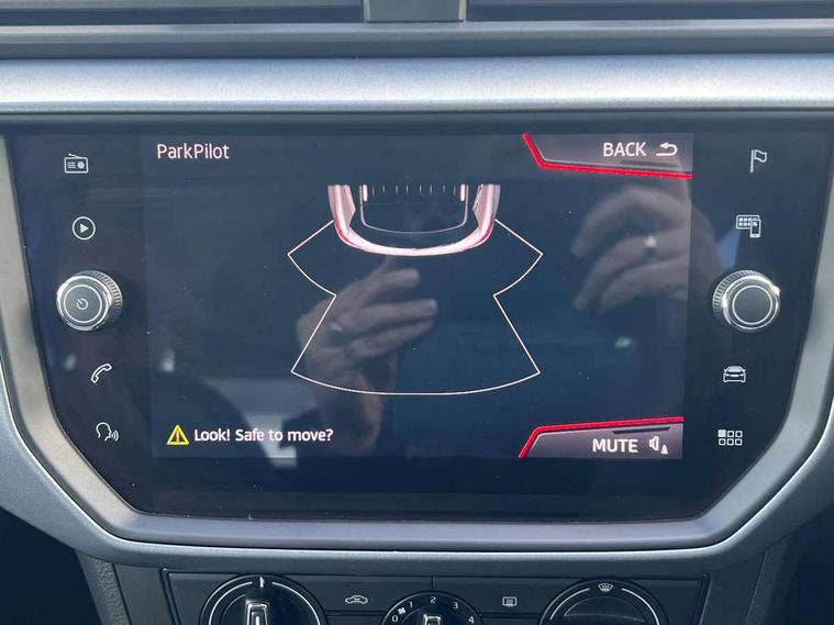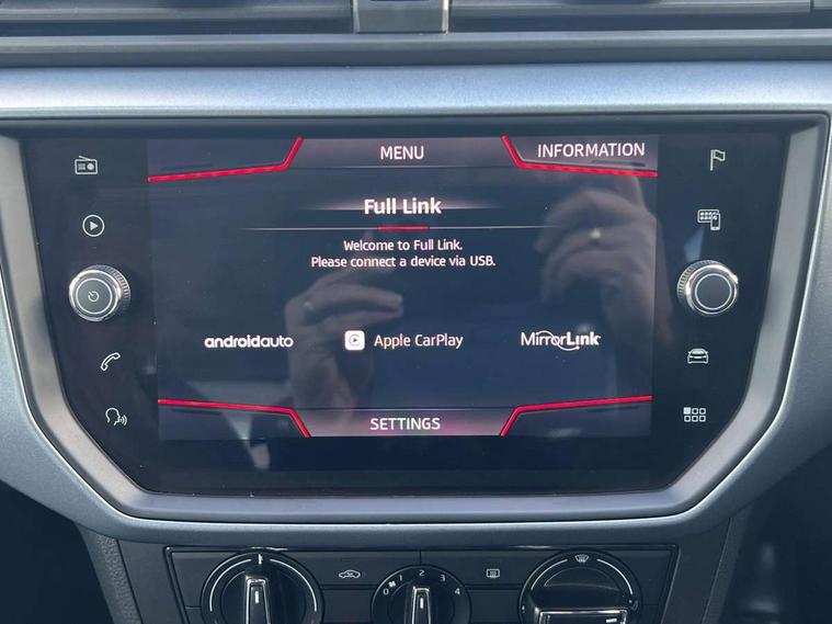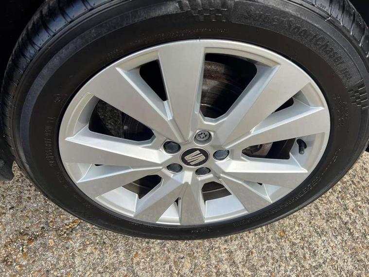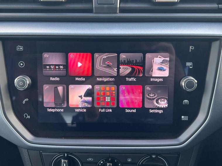 'Lights On' Reminder warning buzzer, Cruise control, Digital clock, Electric speed sensitive power steering, Front assistant collision mitigation, Full Link Smartphone Integration with Mirror Link, Apple Car Play, Google Android Auto, Low fuel warning light, Outside temperature display, Rear parking sensor, RPM counter, Trip computer, Comfort suspension, 6 speakers, Bluetooth interface for hands free and audio streaming, DAB Digital radio, SEAT USB media cable, Steering wheel mounted audio controls, Anti theft roof antenna, Automatic activation of hazard warning lights, Automatic headlights, Black roof rails, Black window surrounds, Body coloured bumpers, Body coloured door handle inserts, Chrome grille surround, Electric adjustable door mirrors, Electric front/rear windows with one touch/auto up/down, Electric headlight adjustment, Front fog lights with static cornering function, Halogen headlights, Hidden exhaust pipe, LED daytime running lights, LED licence plate lighting, LED tail lights, Rear fog lights, Rear window wash/wipe, Visible VIN plate, Windshield wiper with intermittent control and potentiometer, 2 cupholders, 3 rear height adjustable headrests, 60/40 split folding rear seat, Active head restraints, Air conditioning, Ambient interior lighting, Card holder, Cloth upholstery, Double boot floor, Driver and passenger sunvisors, Driver/front passenger seat height adjustment, Dust/pollen filter, Footwell ambient lighting, Front courtesy lights, Front reading light, Gear shift indicator, Height/reach adjustable steering column, Illuminated boot, Instrument lighting with brightness control, Isofix attachments on rear seats, Leather handbrake, Leather steering wheel and gear knob, Connectivity pack plus - Arona, 3 point seatbelts on all rear seats, ABS+EBA, Child locks on rear doors, Driver/Front Passenger airbags, Electronic stability control, Front and rear seatbelt reminder, Front side/curtain airbags, Height adjustable active front headrests, Hill hold control + Tyre Pressure monitor, Multi-Collision braking, Passenger airbag deactivate switch, Tiredness recognition system, Traction control, 2 folding remote keys with window open/close function, Immobiliser, Locking wheel bolts, Remote central locking + deadlocks, Interior chrome line trim, 17" Dynamic alloy wheels,