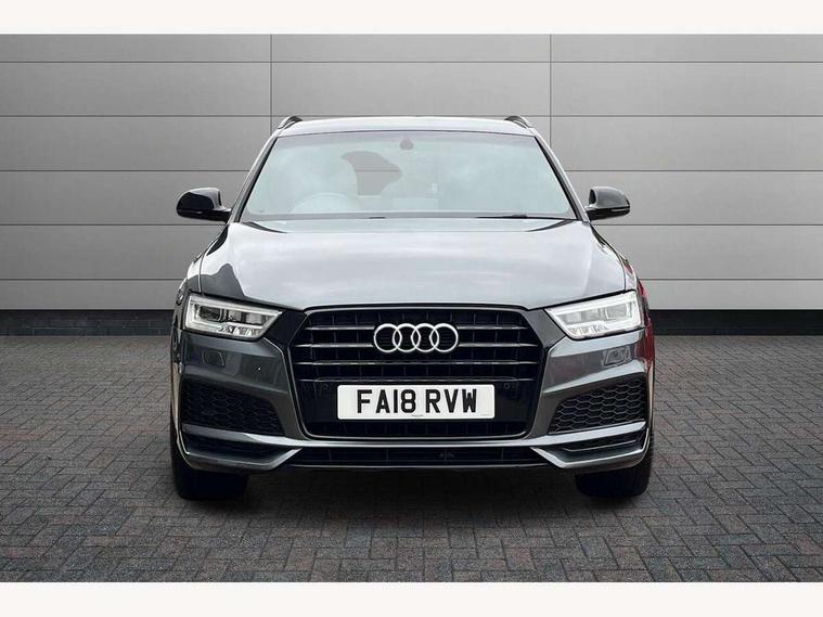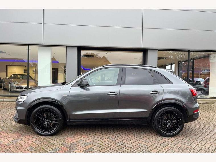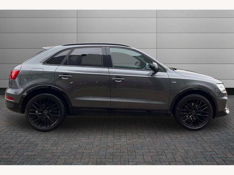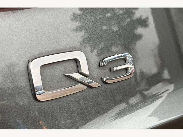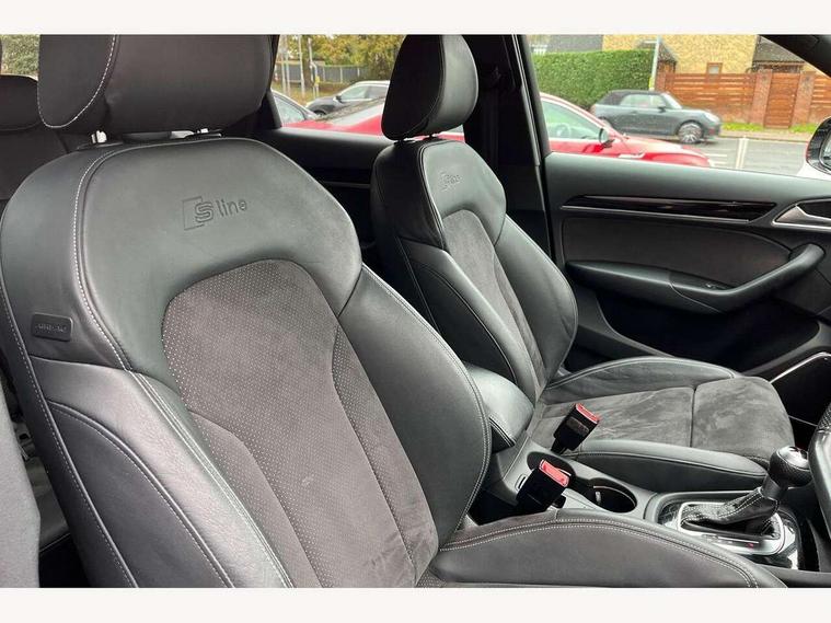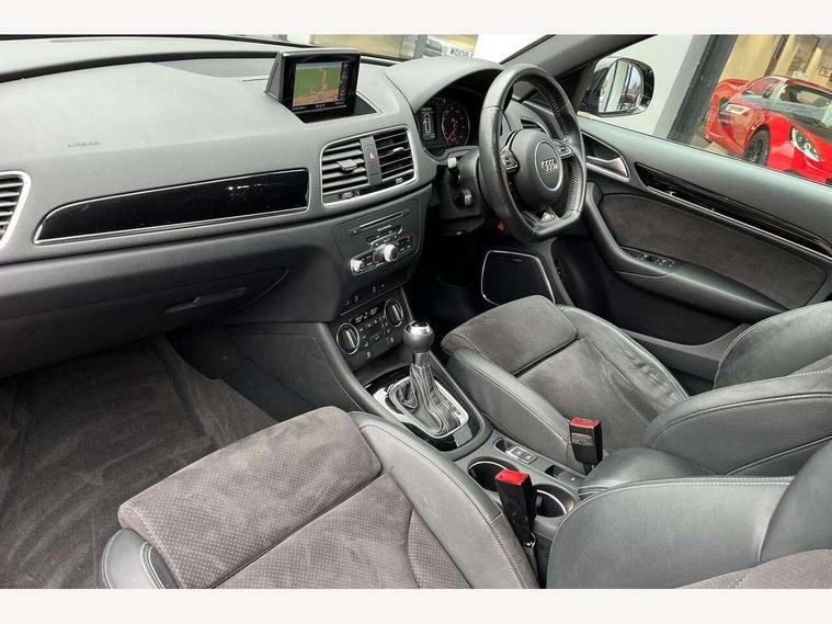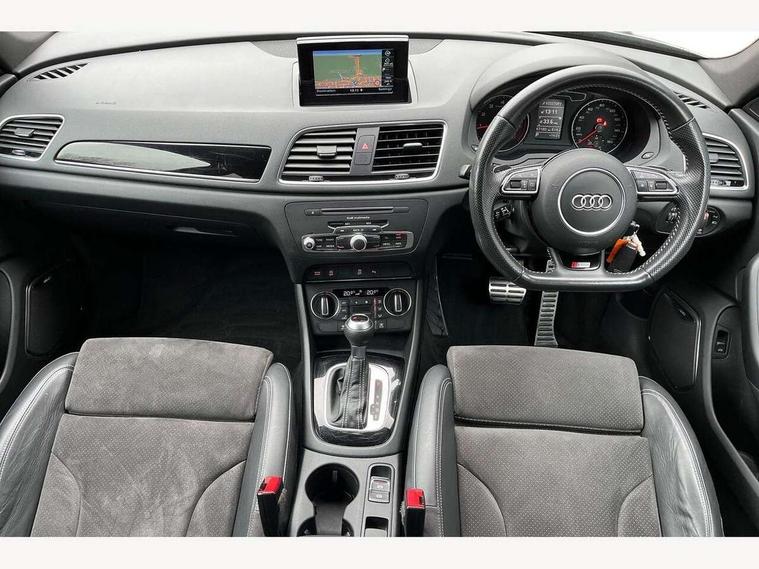 6.5" colour display screen, Audi drive select, Cruise control, Electro-mechanical PAS, Low washer fluid indicator, MMI - Multi Media Interface control system, On board computer, Remote electric boot opening/closing, Service interval indicator, Voice control system, Sports suspension, Audi music interface, BOSE sound system, DAB digital radio module, Acoustic windscreen, Aluminium window surround, Auto dimming rear view mirror, Black exhaust tailpipes, Black high gloss door mirrors, Black roof rails, Coming home function, Door mirror integrated indicators, Front and rear electric windows, Front fog lights, Front lip spoiler, Heated windscreen washer jets, High Gloss Black Contrast Bumpers, High Gloss Black rear spoiler, LED daytime running lights, LED headlights with headlight washers, LED rear lights, Light and rain sensor for auto activation of lights and windscreen wipers, Loading sill protector in stainless steel, Privacy glass, Rear diffuser with platinum insert, Rear wiper, S Line body styling, Sunband for windscreen, 12V socket in rear centre console, 3 spoke flat bottom multi-function perforated leather steering wheel with contrast stitching and aluminium gearshift paddles, Aluminium door sill trims, Aluminium gear knob, Black cloth headlining, Door sill trim strips, Dual zone climate control, Electric front lumbar adjustment, Front and rear headrests, Front and rear velour floor mats, Front centre armrest with storage compartment and angle adjustment, Front sports seats, Height/reach adjust steering wheel, ISOFIX on front passenger and rear outer seats, Jack and tool kit, Retractable luggage cover, Reversible boot floor, Split fold rear seat, Stainless steel pedals, Storage compartment and 12V socket, Under floor storage in luggage area, Audi Exclusive black styling pack - Q3, LED interior light pack - Q3, 3x3 point rear seatbelts, ABS+Electronic Brake force Distribution, Curtain airbags, Driver and passenger airbags, Driver and passenger side airbags, EDL + ASR, Electrically operated child locks on rear doors, Electromechanical parking brake, ESP, First aid kit, Front passenger airbag deactivation, Head airbags, Seatbelt warning light, Tyre pressure monitoring system, Warning triangle, Locking wheel bolts, Remote central locking, Thatcham category 1 alarm + immobiliser, Piano black finish inlay,